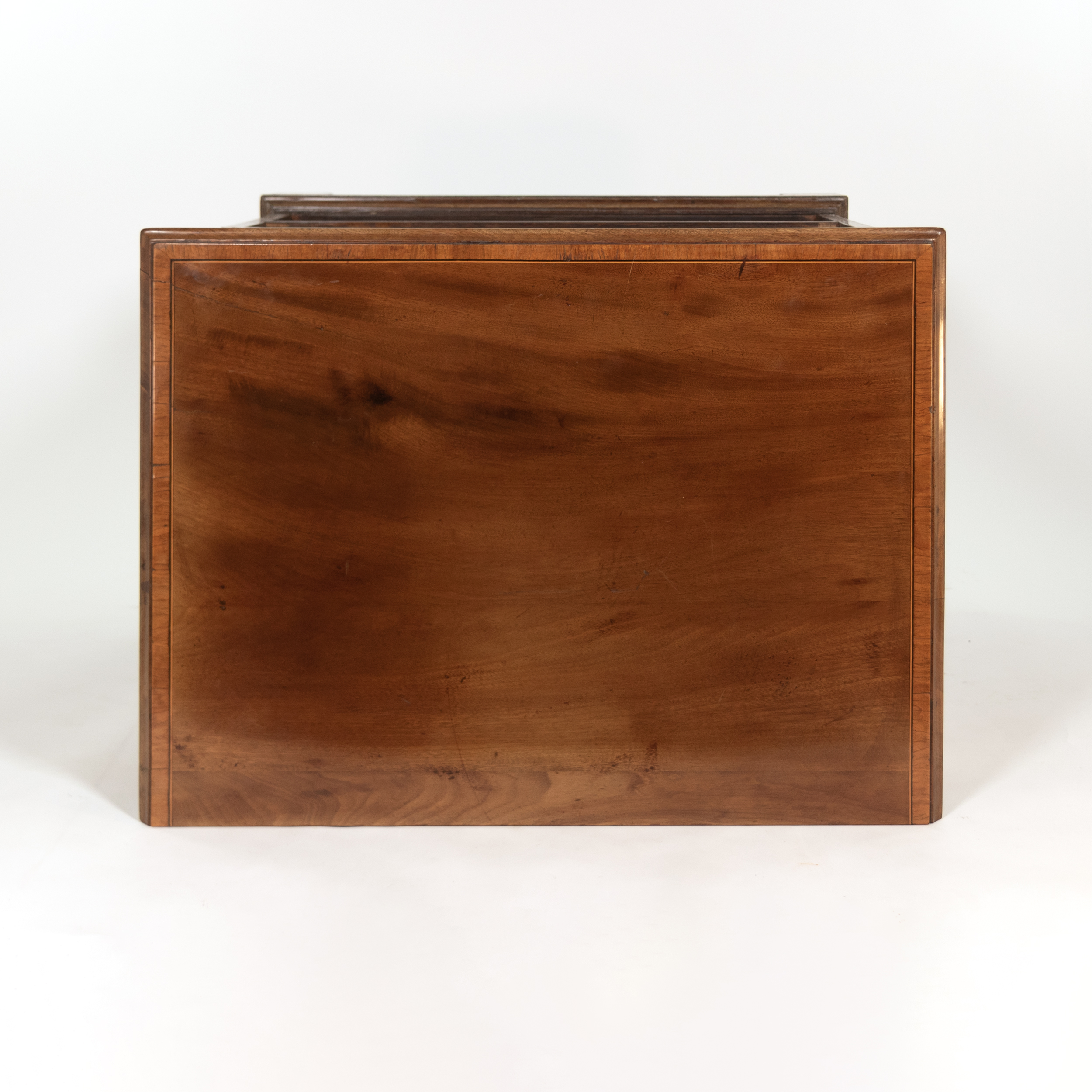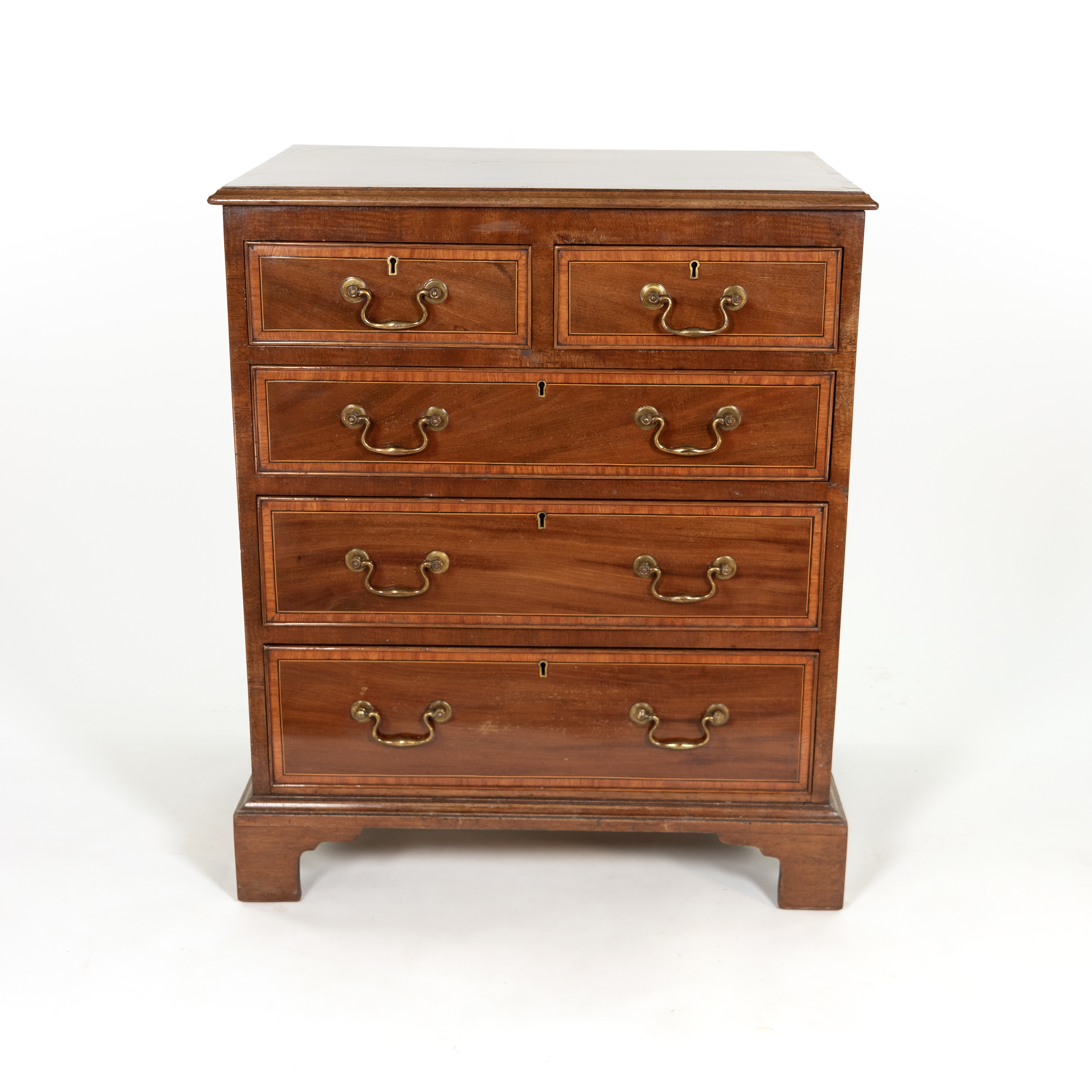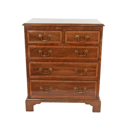 A Georgian-style mahogany bachelor’s chest with two small drawers over three larger drawers, each bordered with inlaid satinwood and brass hardware. The chest rests on bracket feet. English circa 1890.