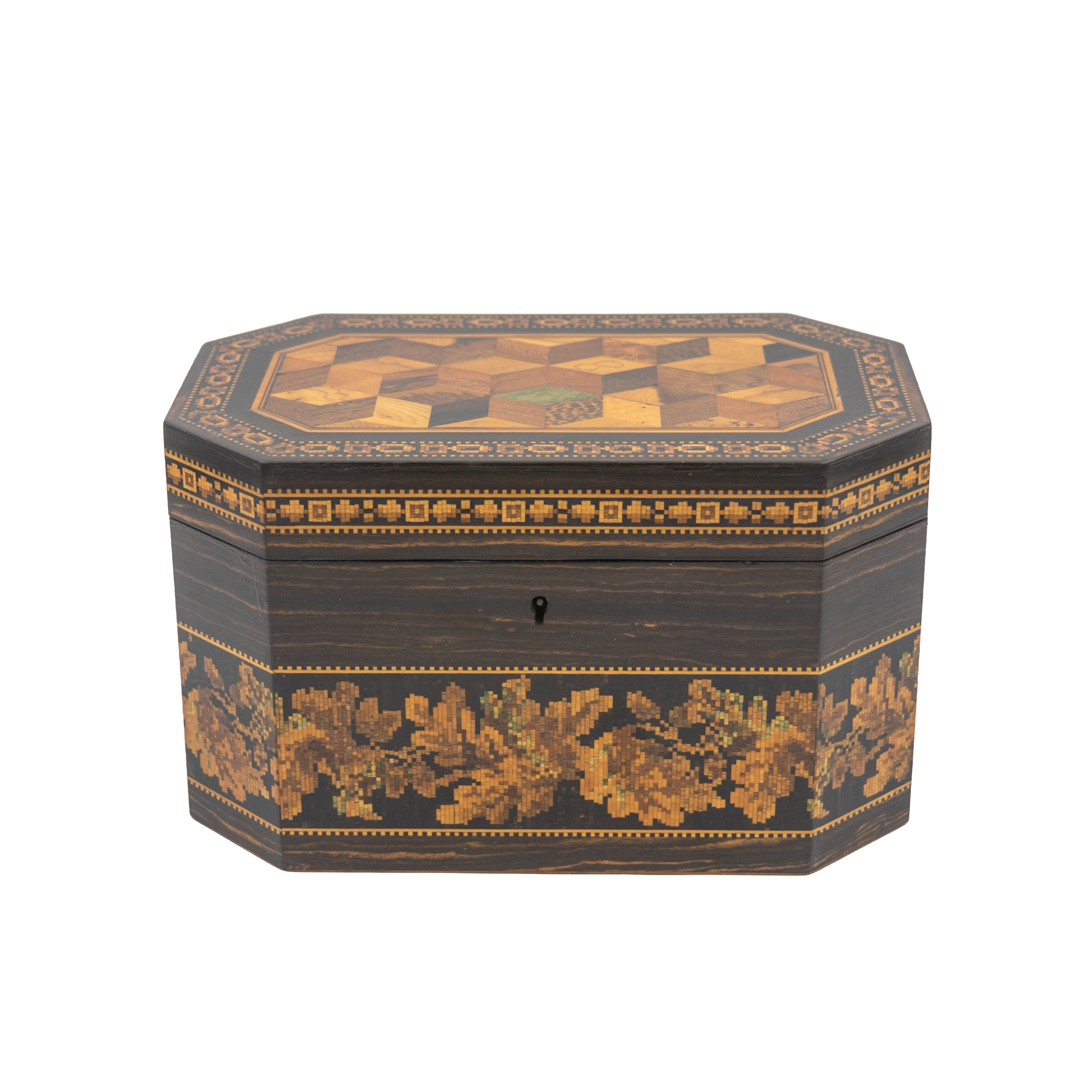 Wonderful hexagonal Tunbridgeware tea caddy by Thomas Barton; tumbling block marquetry top, geometric borders and floral marquetry band around the bottom. English, circa 1865.