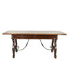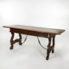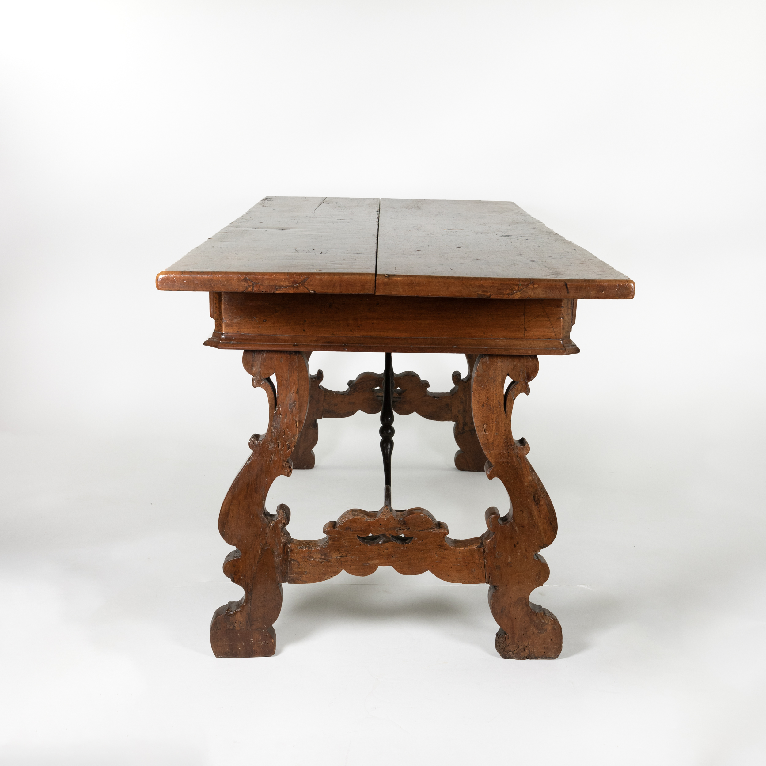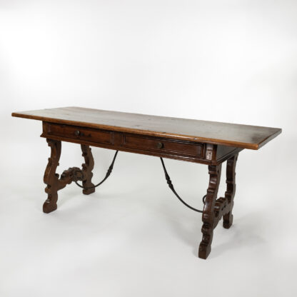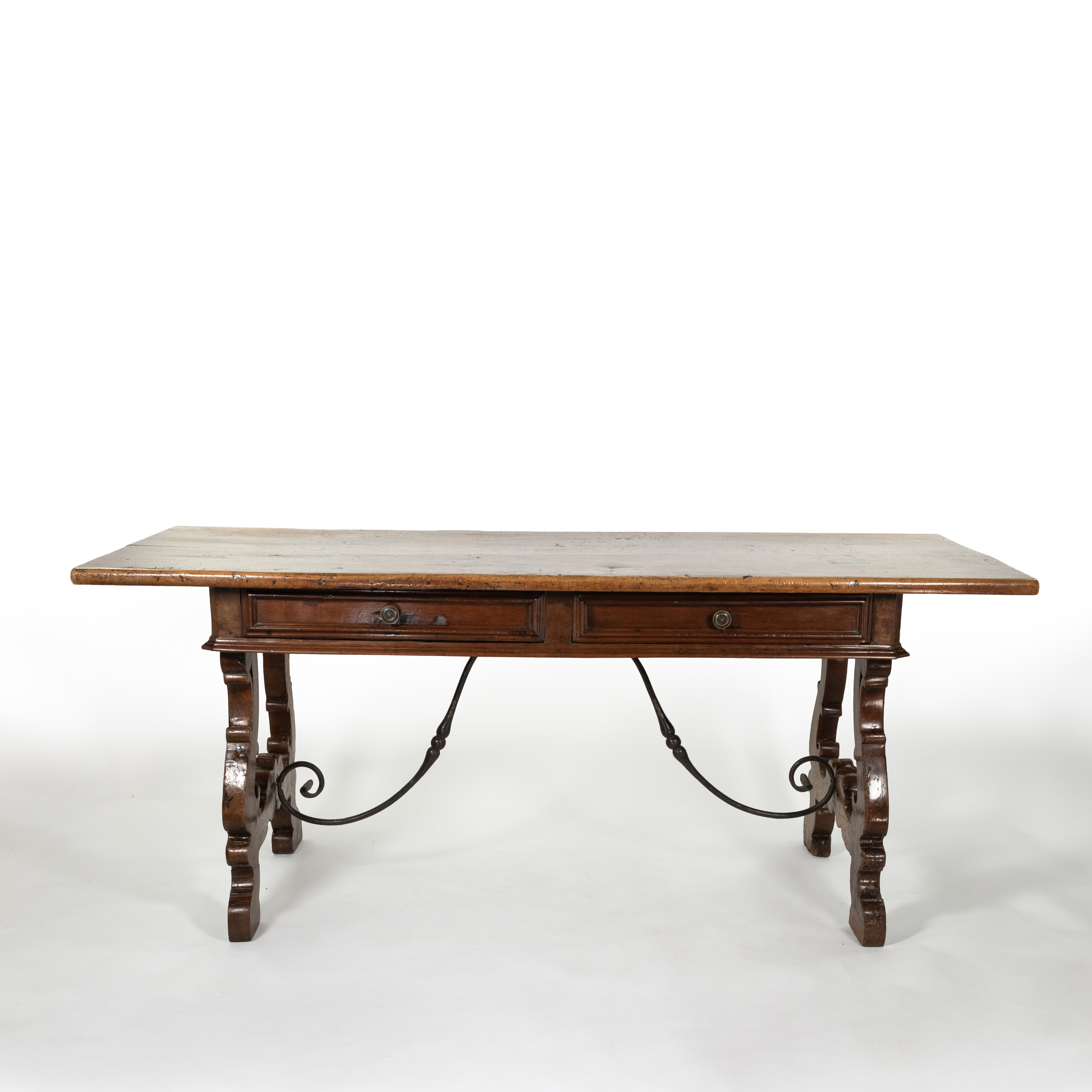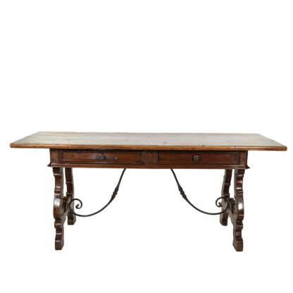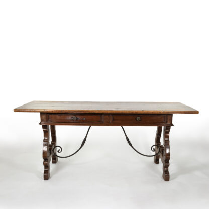 A handsome Italian Baroque period walnut writing table with two moulded drawers, carved harp-shaped trestle bases with sand cast iron stretcher, Italy circa 1650.