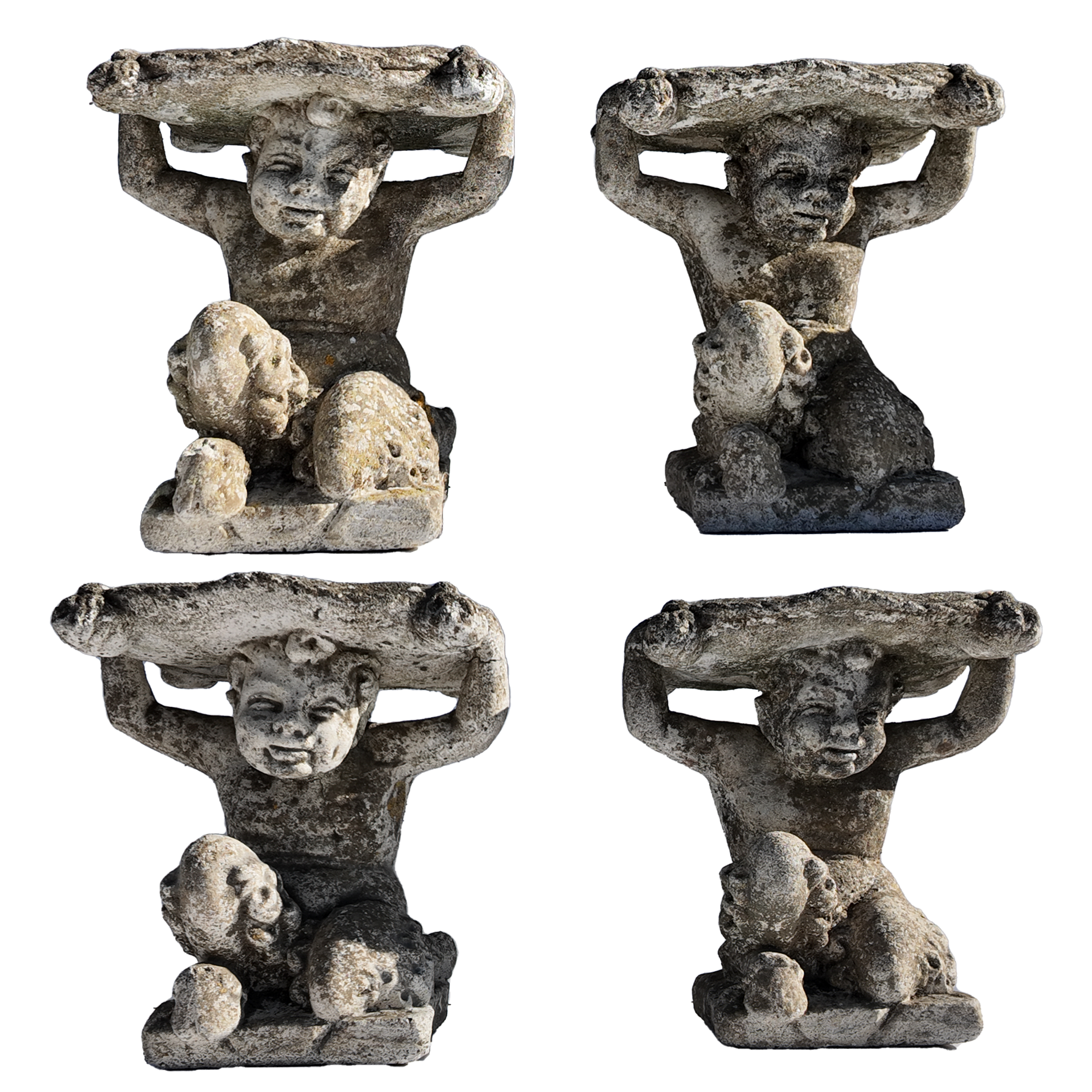 These are one of a class of lustful, drunken woodland gods. In Greek art they were represented as a man with a horse's ears and tail, but in Roman representations as a man with a goat's ears, tail, legs, and horns. These four are depicted holding up cushions on their heads, waiting to be sat upon. Italy, Circa 1900 Height: 17.5 in. (44 cm.) Sold as a set of 4
