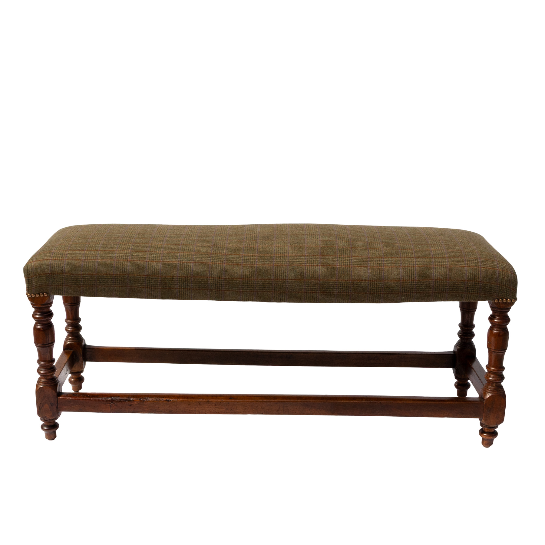 Italian Fruitwood Upholstered Bench With Turned Leg And Box Stretcher; circa 1800