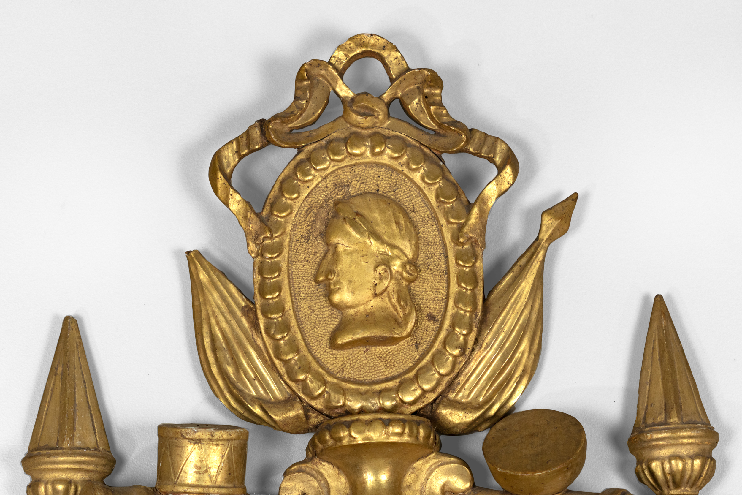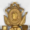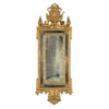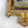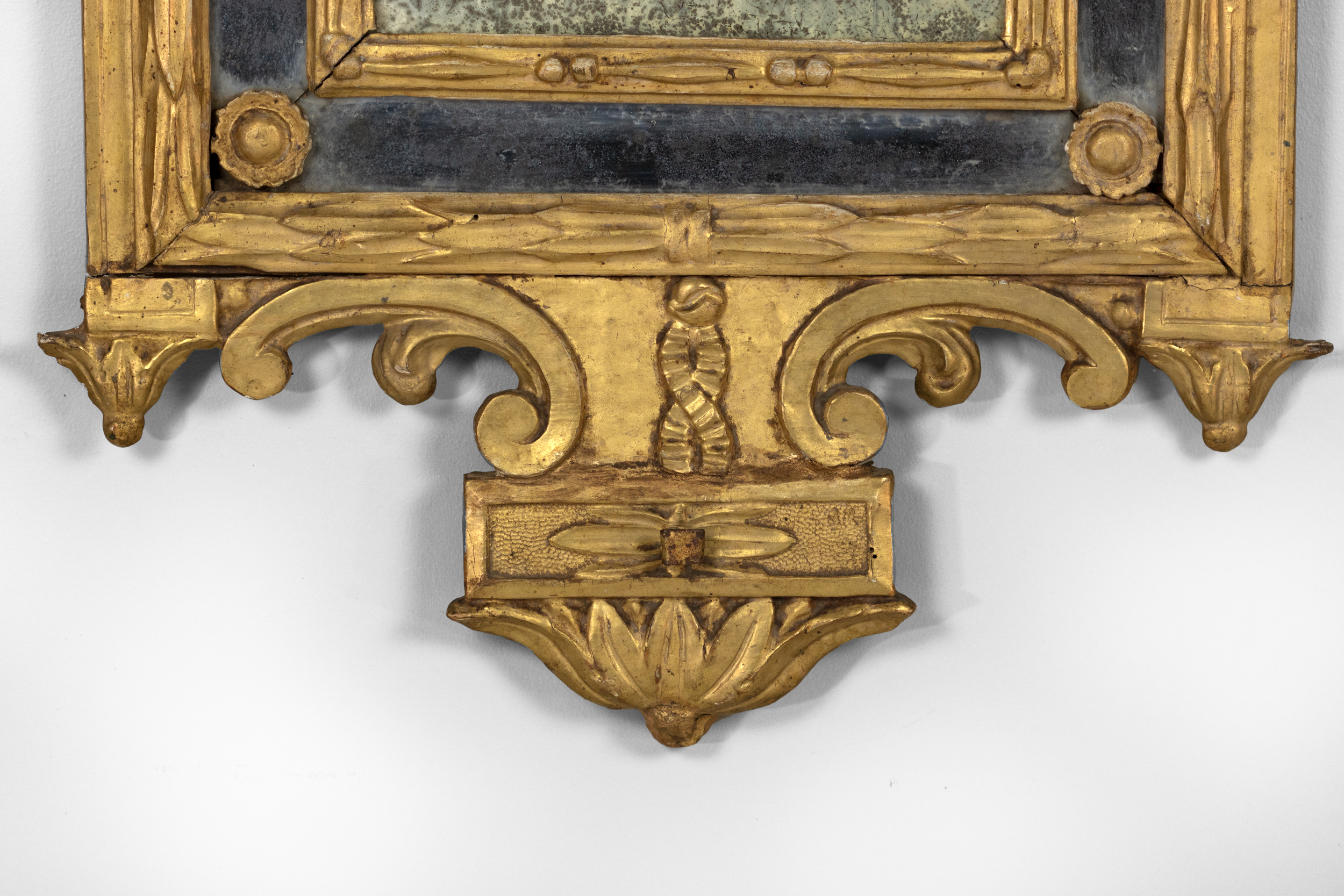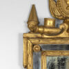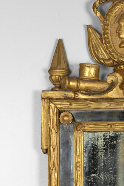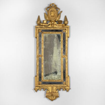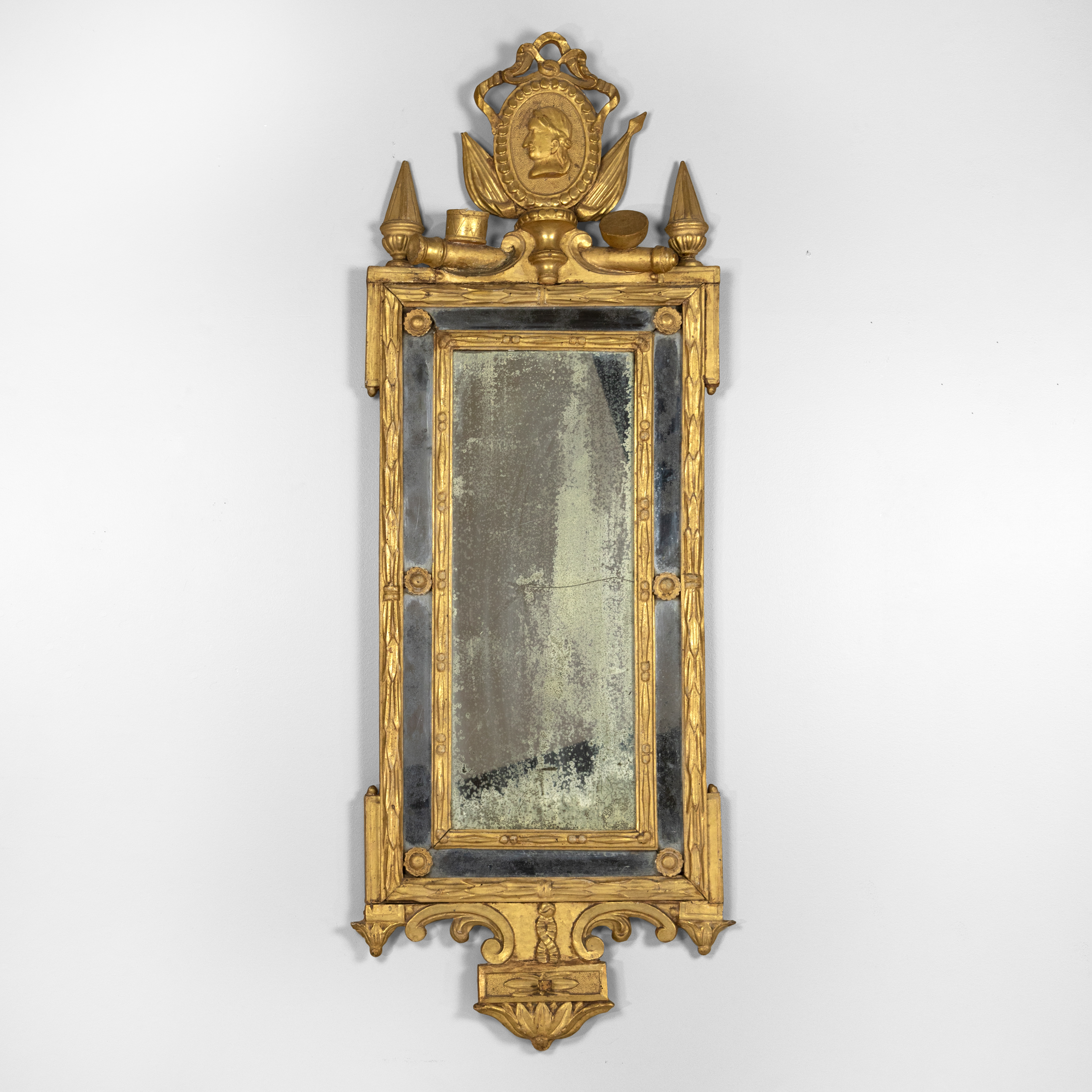 An Italian Neoclassical giltwood mirror with original mercury plates; rectangular mirror plate with a carved inner slip and a mirrored border divided by beaded rosettes; a husk carved frame surmounted by swag with ribbon and medallion cresting featuring a carved relief profile of Augustus Caesar, the first Roman Emperor, with aquiline / Roman nose and laurel wreath on his head; a pair of finials and drum elements. The apron featuring scrolls & ribbon, and dragonfly carvings and foliate elements