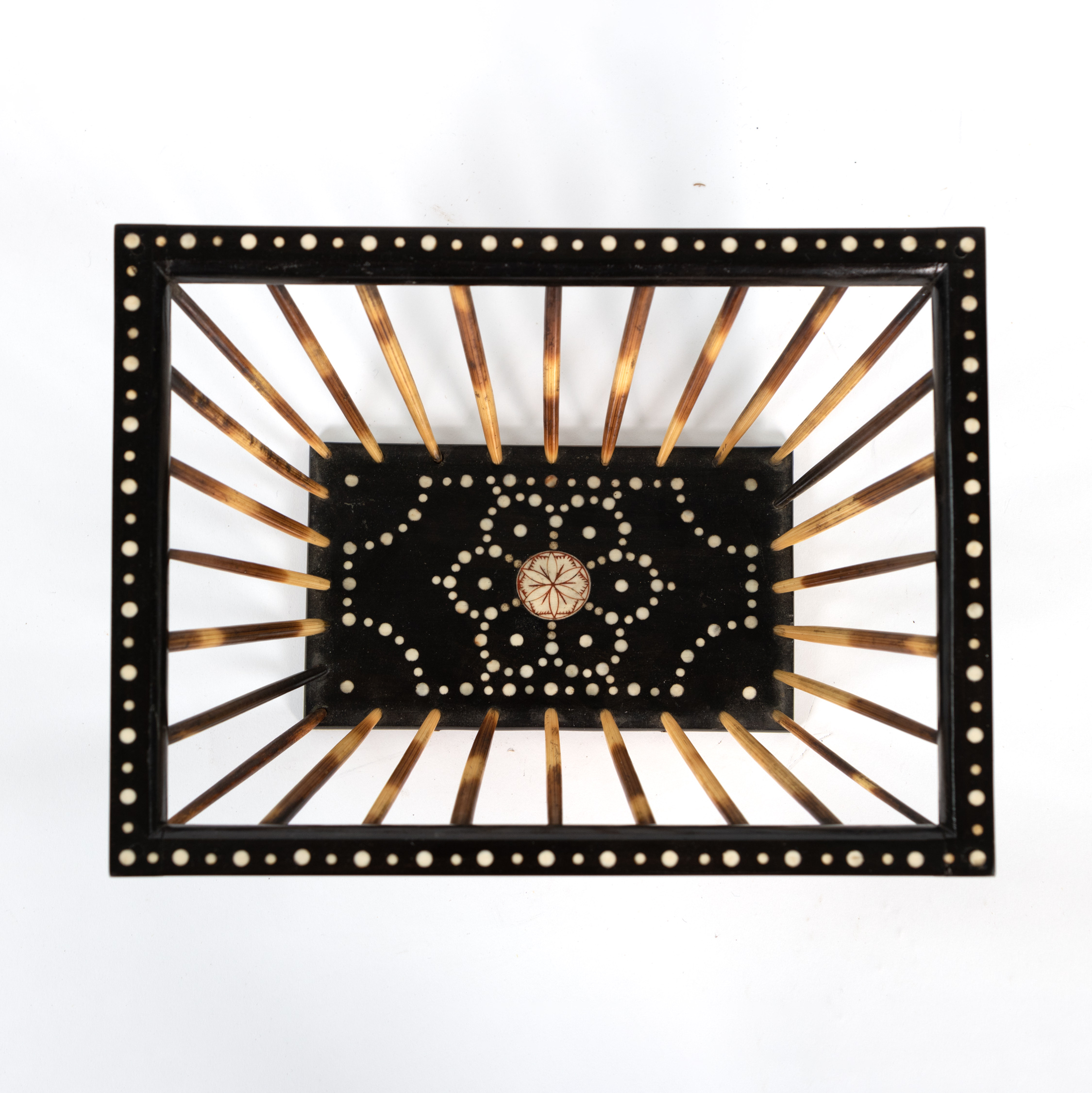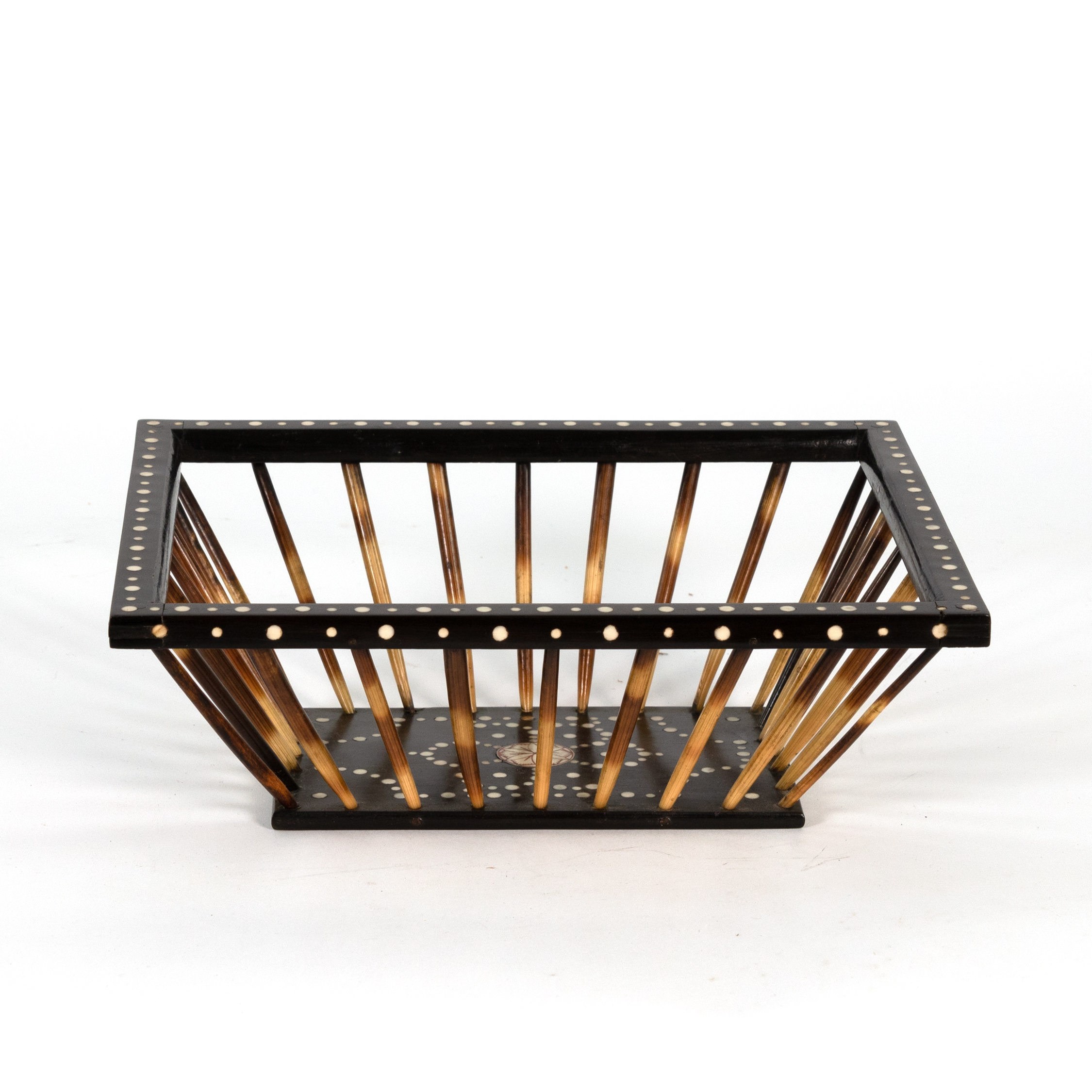 A large Anglo Indian porcupine quill and ebony basket with bone dot inlay. Made in India for the English market circa 1880