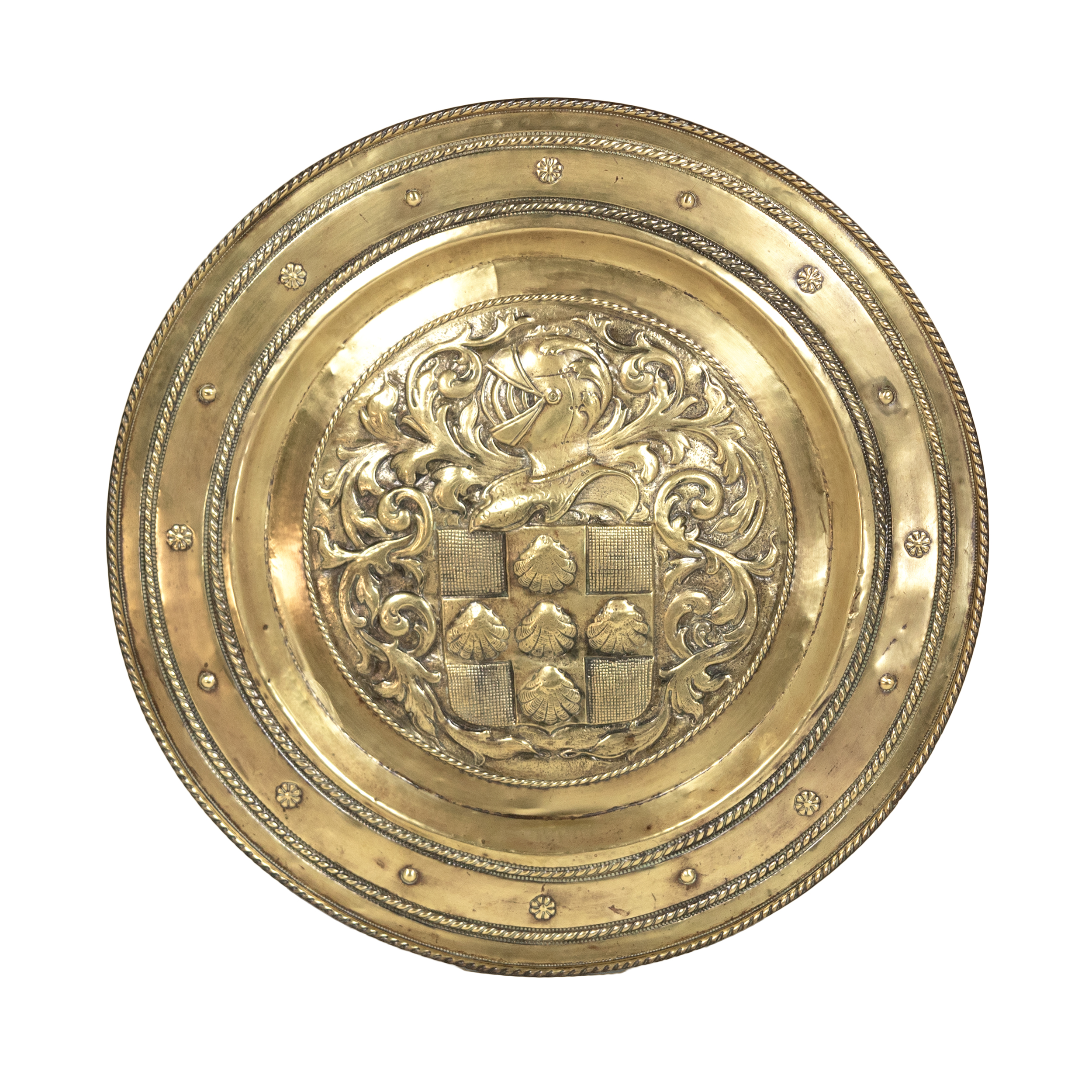 A large heraldic brass repoussé charger featuring a coat of arms crowned with a knight’s helmet. The shield includes four shells in a cross configuration and patterned quadrants in each corner. The rim is bordered with decorations of repeating rosettes and concentric rope twists. English, circa 1860. 1