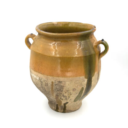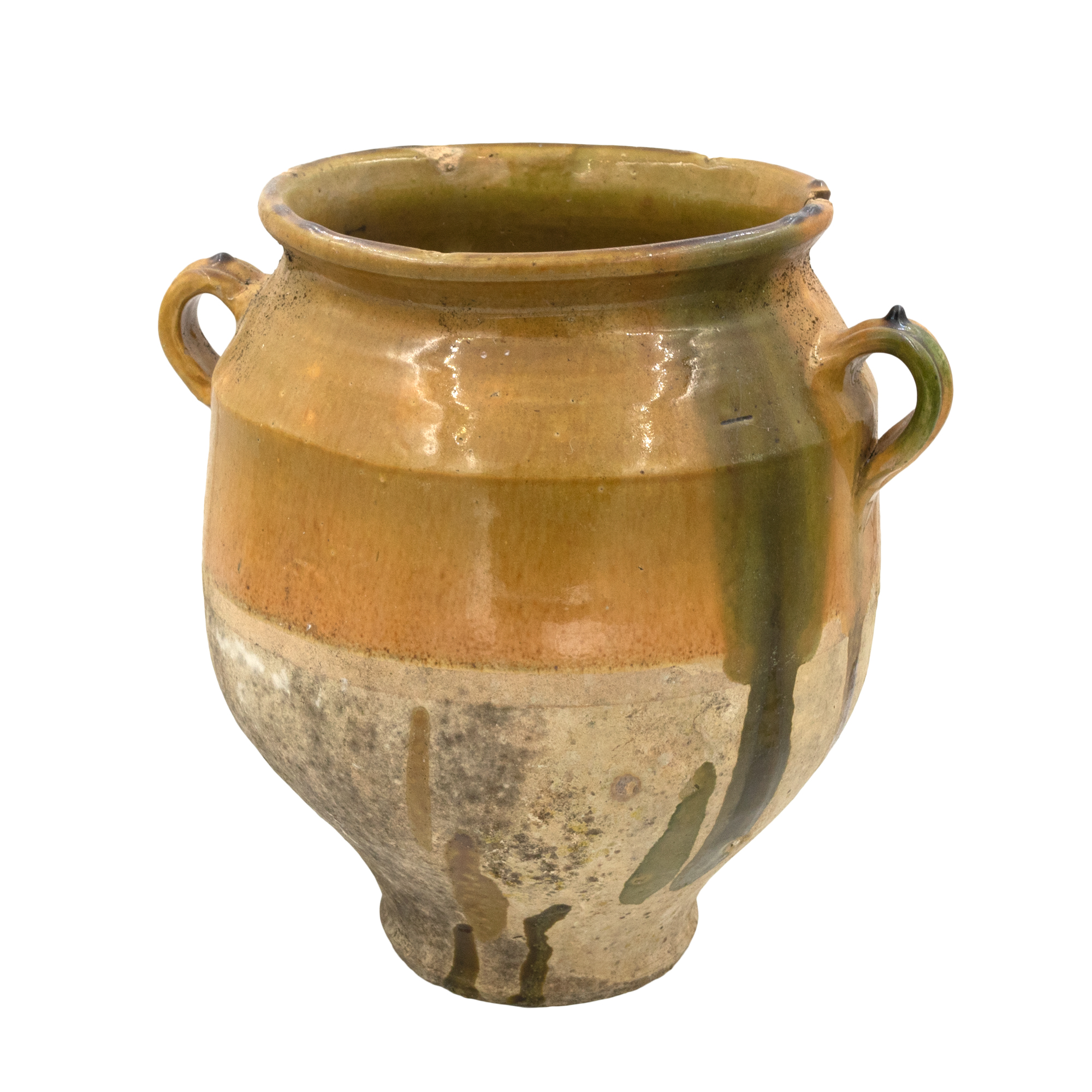 A gorgeous large antique French confit pot with yellow & green glaze, late 1800’s featuring a single streak of green. A lovely piece to add to any collection of vintage French pottery.1