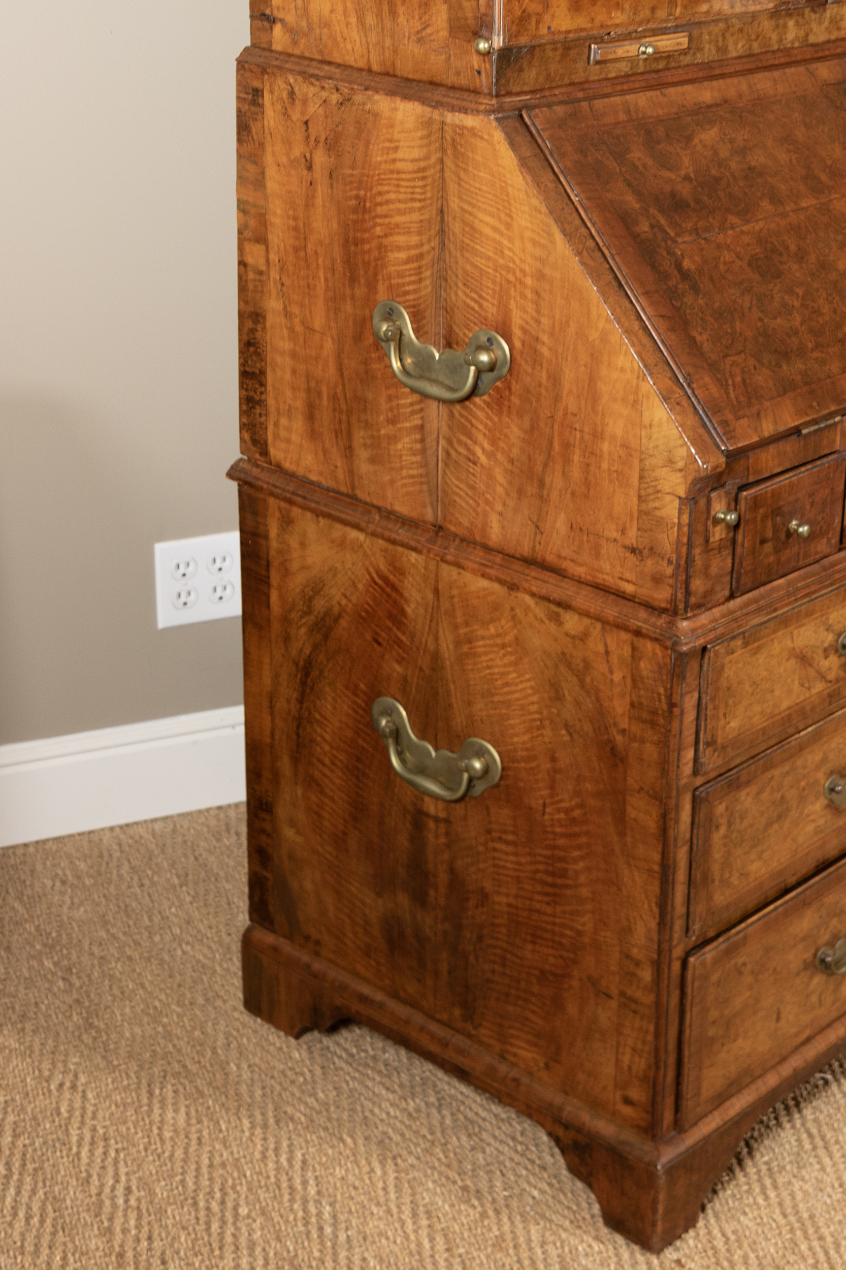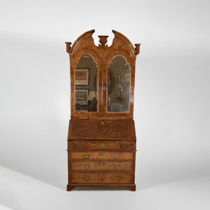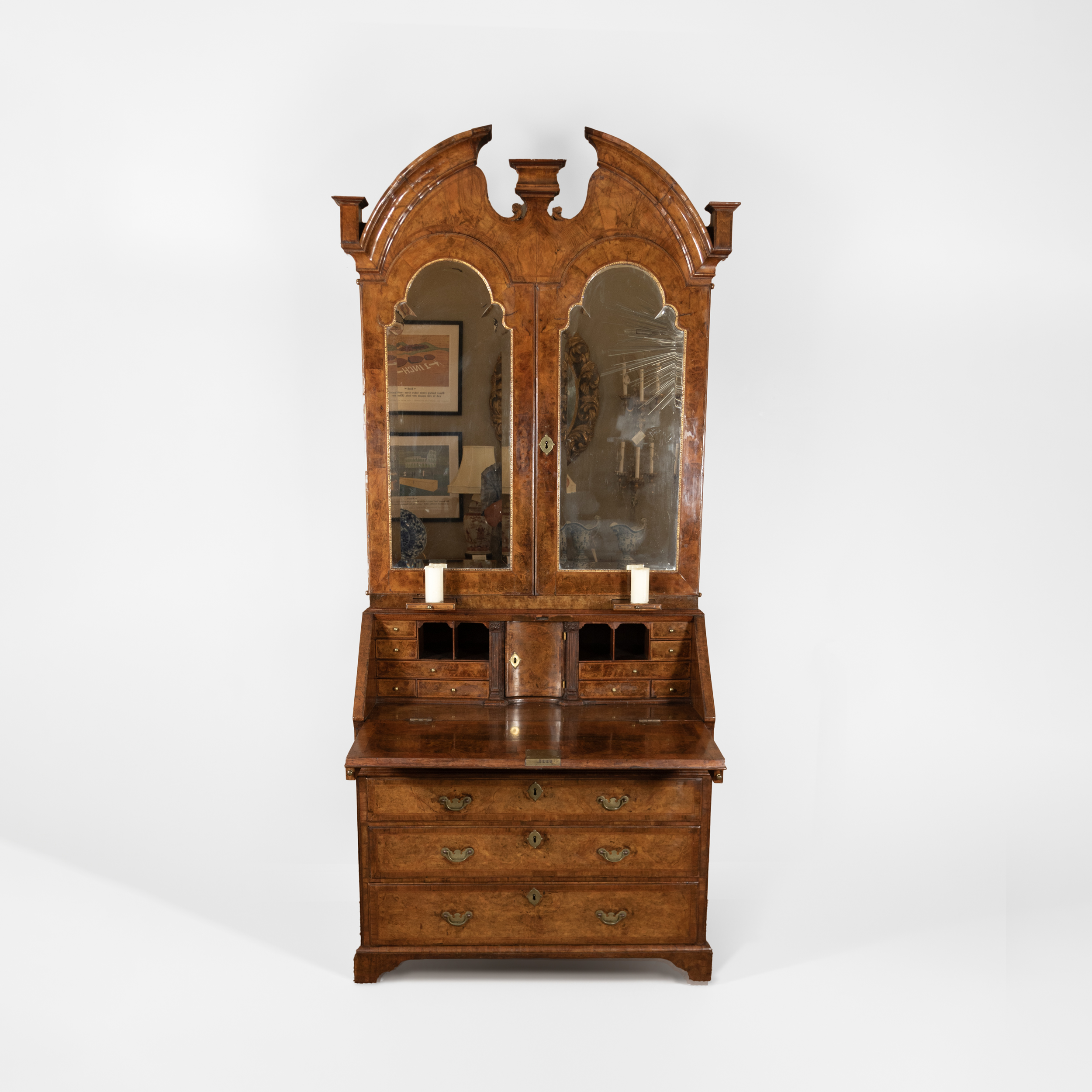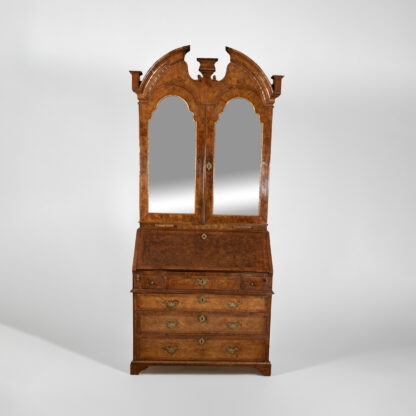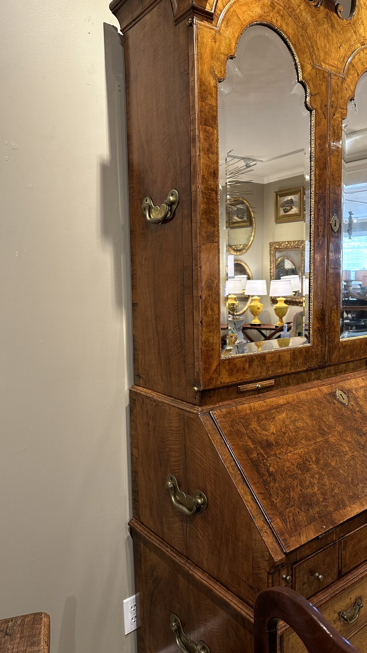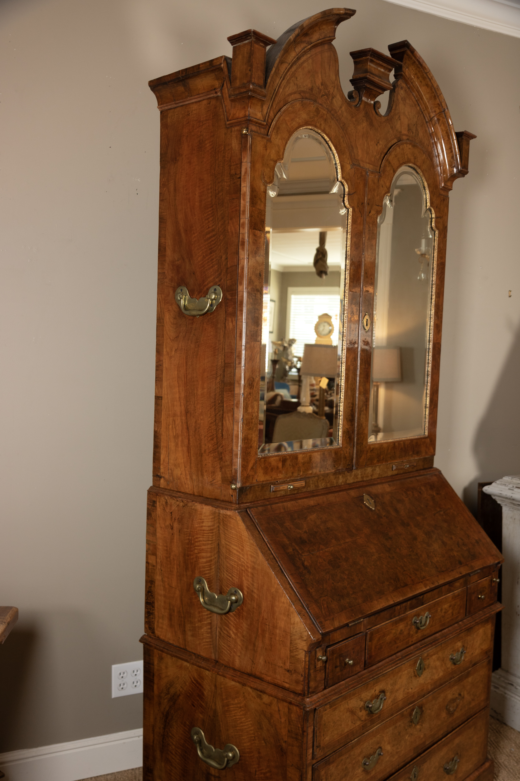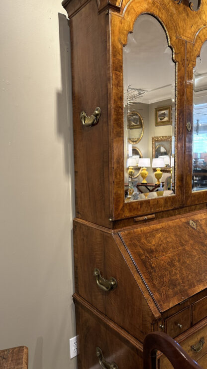 A George III period burl walnut secretary with a broken-arched pediment crown and a two-door upper cabinet with later beveled glass panes. The interior reveals an arrangement of shelves, niches, and small drawers. The slant front writing surface opens to reveal three small drawers. The base section includes handles to the sides and three long graduated drawers resting on bracket feet, brass pulls, and escutcheons throughout. Handles are also present on the sides of the base and upper sections—late 18th Century.
