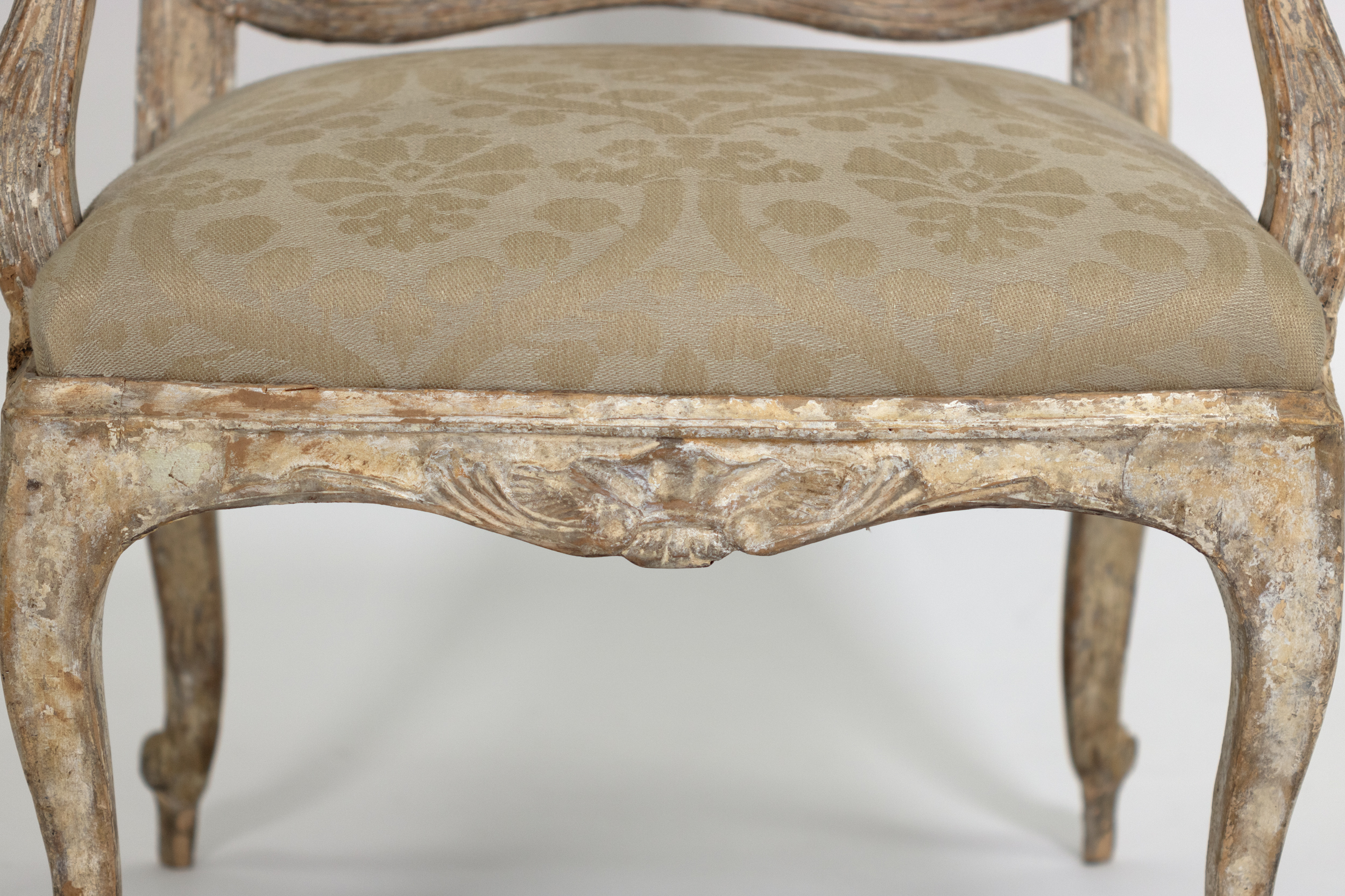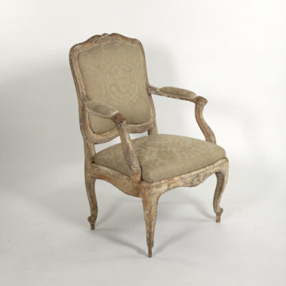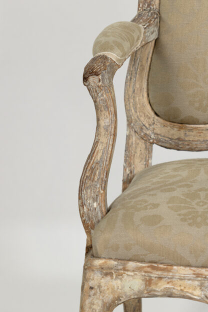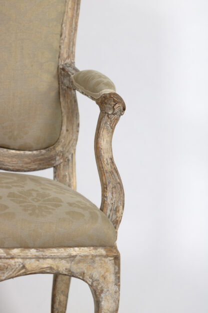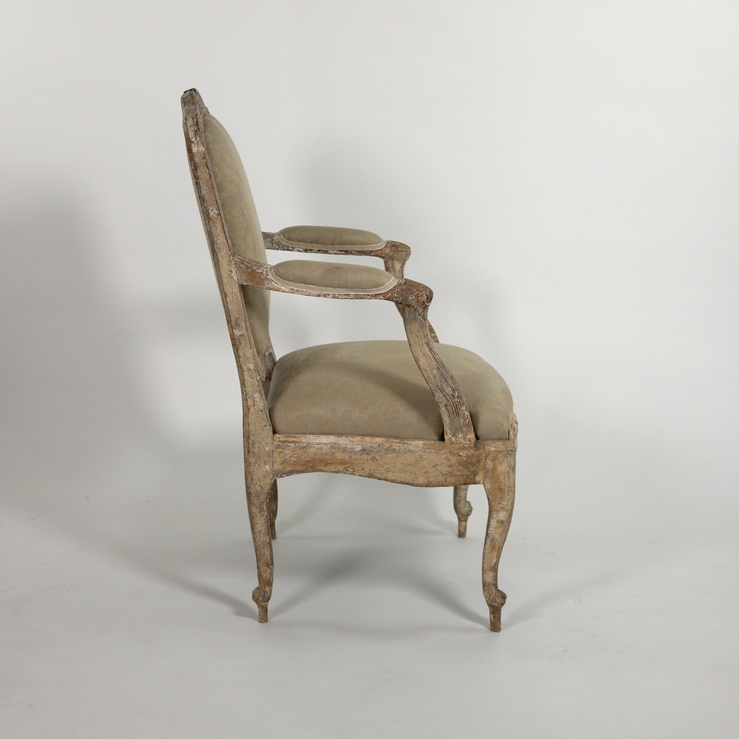 An elegant and well-proportioned painted Swedish open armchair from the late Gustavian period with later upholstery complementing its historical aesthetic. The Gustavian style, characterized by its neoclassical influences and refined simplicity, is evident in the chair’s clean lines and restrained decorative elements.