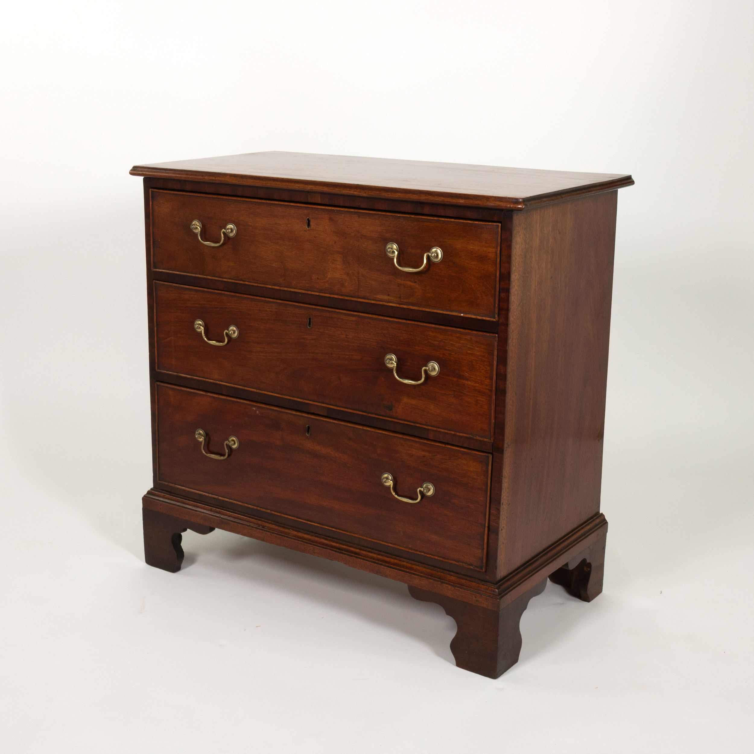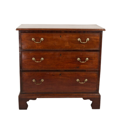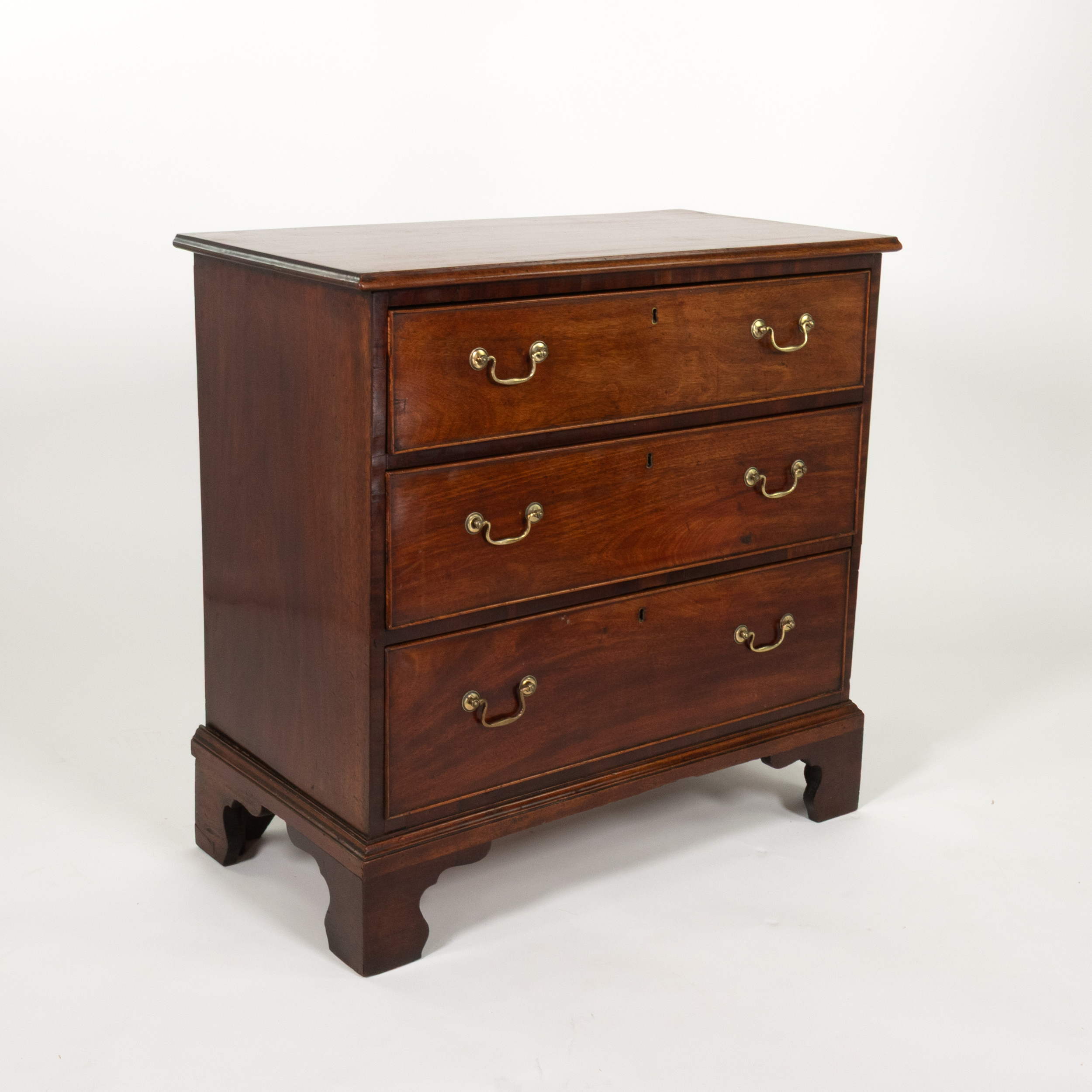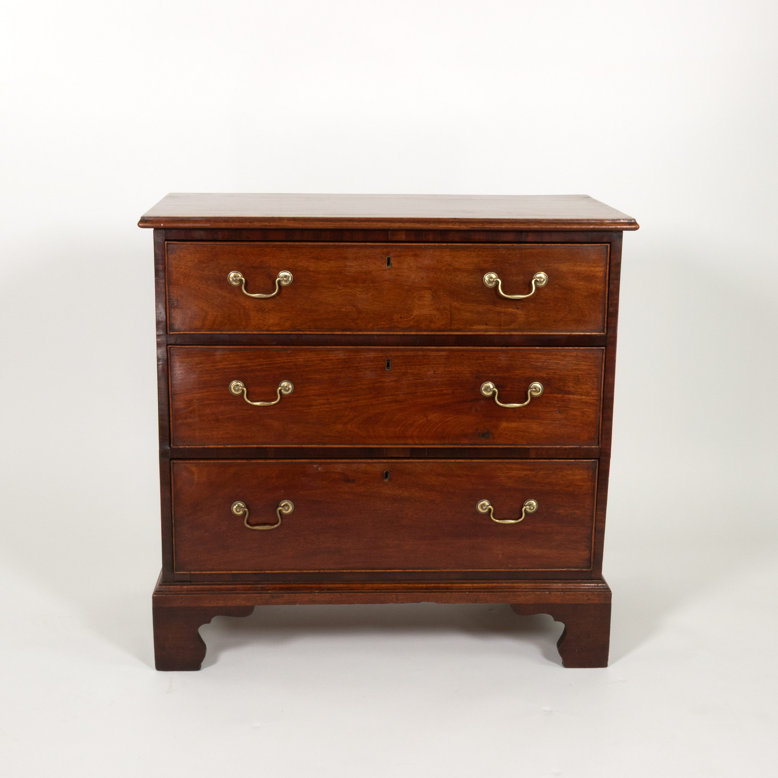 A handsome mahogany bachelor’s chest raised on shaped bracket feet; with three graduated drawers and brass pulls. The richly patinaed top shows subtle signs of wear offering evidence of age and use. The drawers outlined with simple cock-beading. English, circa 1820