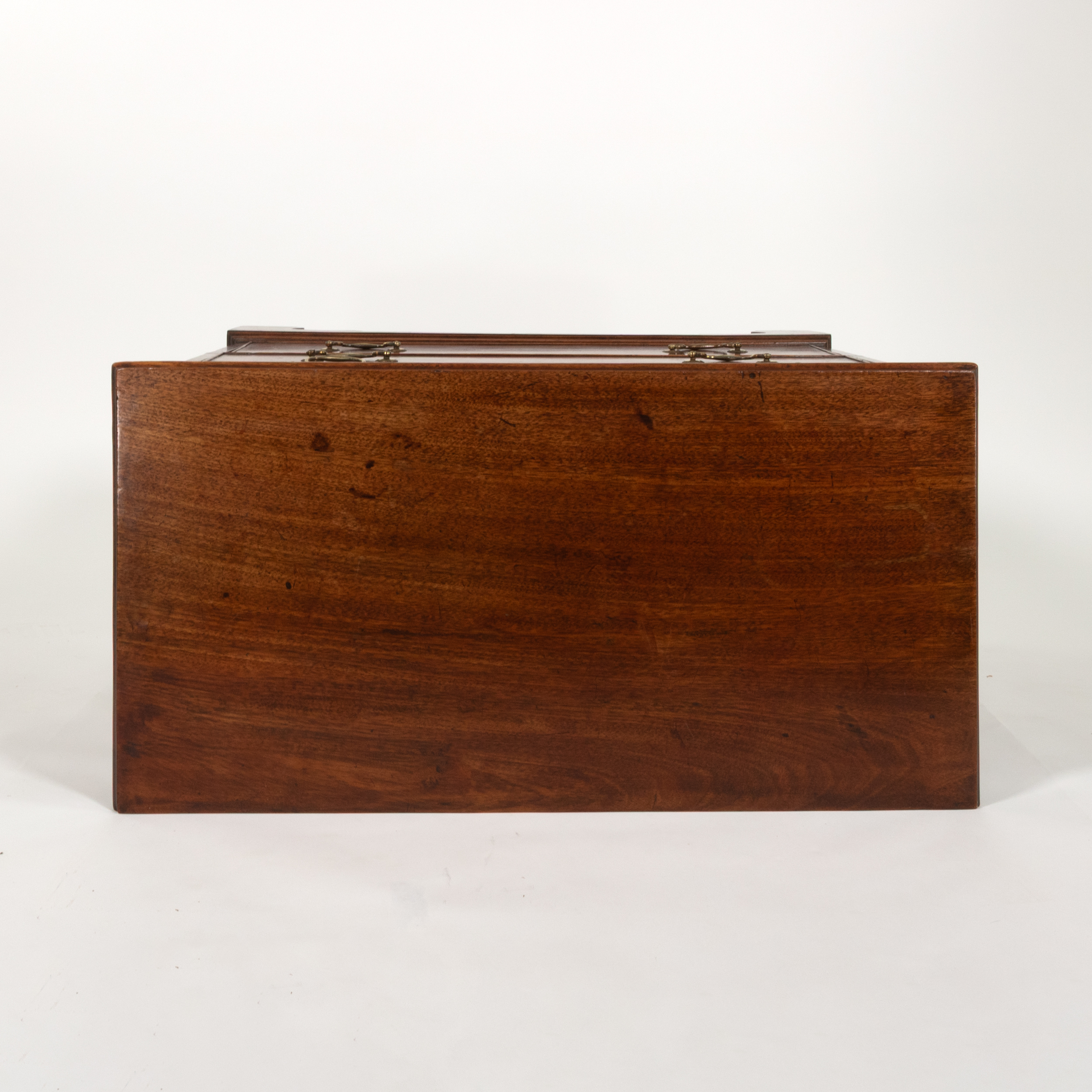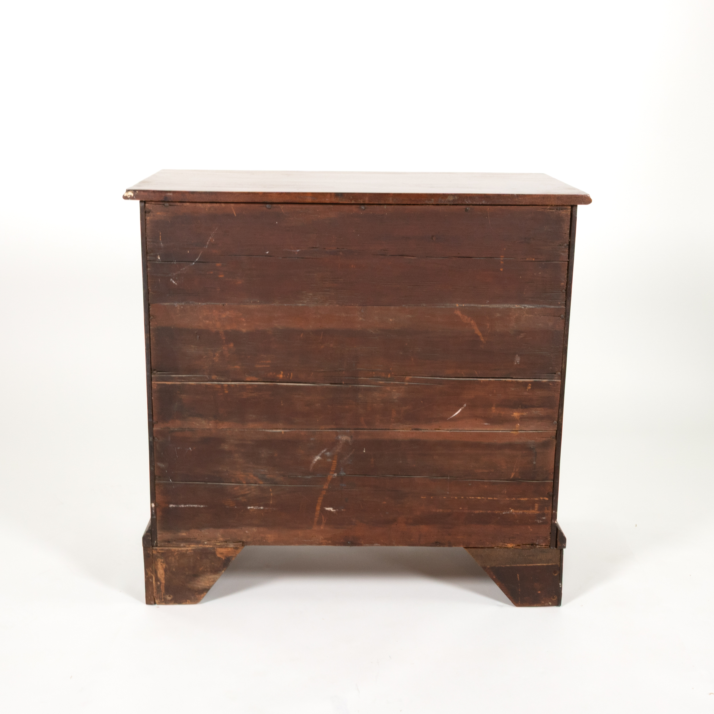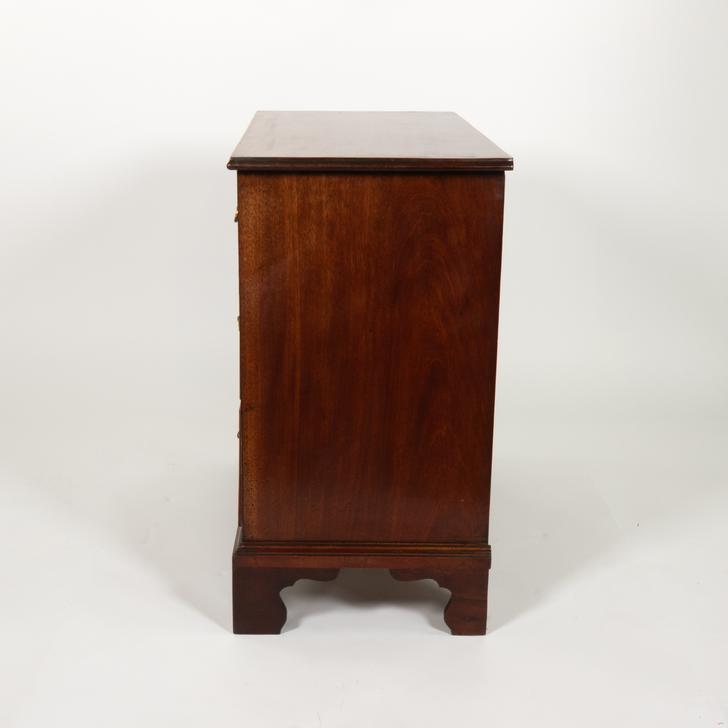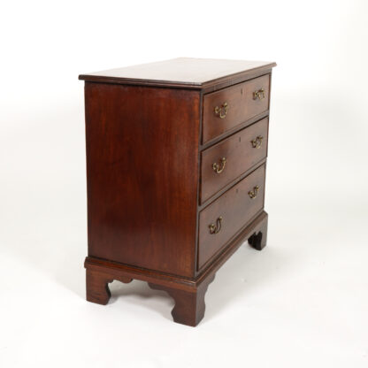 A handsome mahogany bachelor’s chest raised on shaped bracket feet; with three graduated drawers and brass pulls. The richly patinaed top shows subtle signs of wear offering evidence of age and use. The drawers outlined with simple cock-beading. English, circa 1820