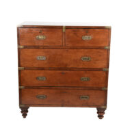 - British officers of high social position in the Georgian and Victorian periods (1714-1901) took it for granted that when they set out on a military campaign in Africa or India they could enjoy the same standard of living as they did at home. While “under canvas,” as life in camp was called, an officer and a gentleman assured himself a high degree of comfort by using specially designed pieces of campaign, or knock-down, furniture. The only real difference between fine household furniture and its campaign counterpart was that the latter could be quickly folded up, packed away in boxes, transported, and —– without the use of nails, tacks, or tools –– reassembled in “some corner of another foreign field that was forever elegantly furnished England.” The superb designs of these pieces reflected the strong sense of superiority of the gentleman-officer class, its rank in both society and in the army, and its attitudes toward travel, camp, and battle.