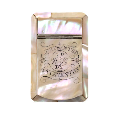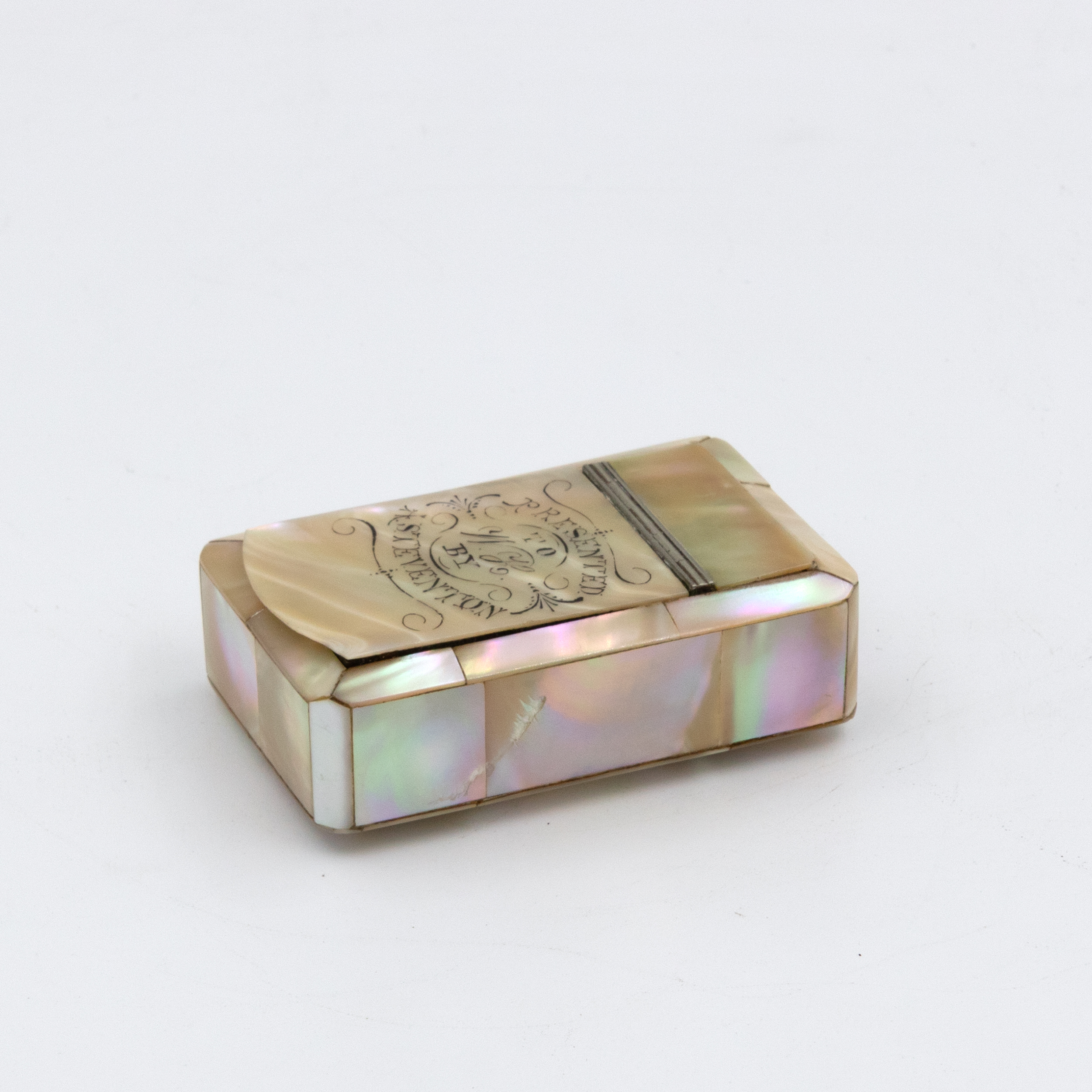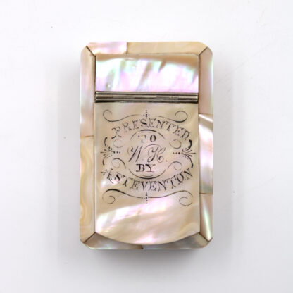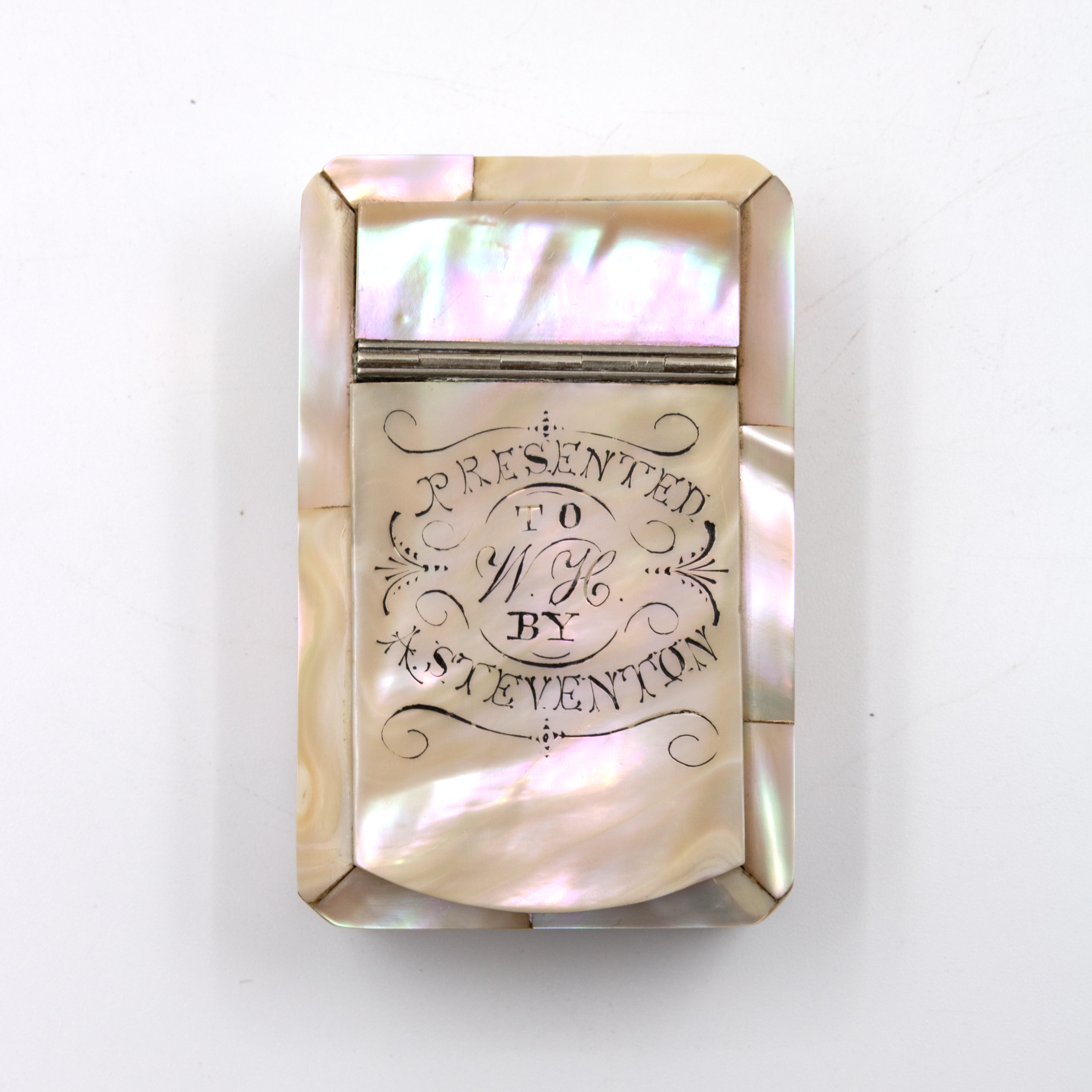 A rectangular snuff box veneered in mother-of-pearl, with a hinged lid engraved “Presented to W.H. by A. Steventon.” The surface is made of beautiful mother-of-pearl panels, mitered at the corners. The script is in a copperplate style, suggesting the box was intended as a personal gift or presentation piece. 1 English, circa 1890.