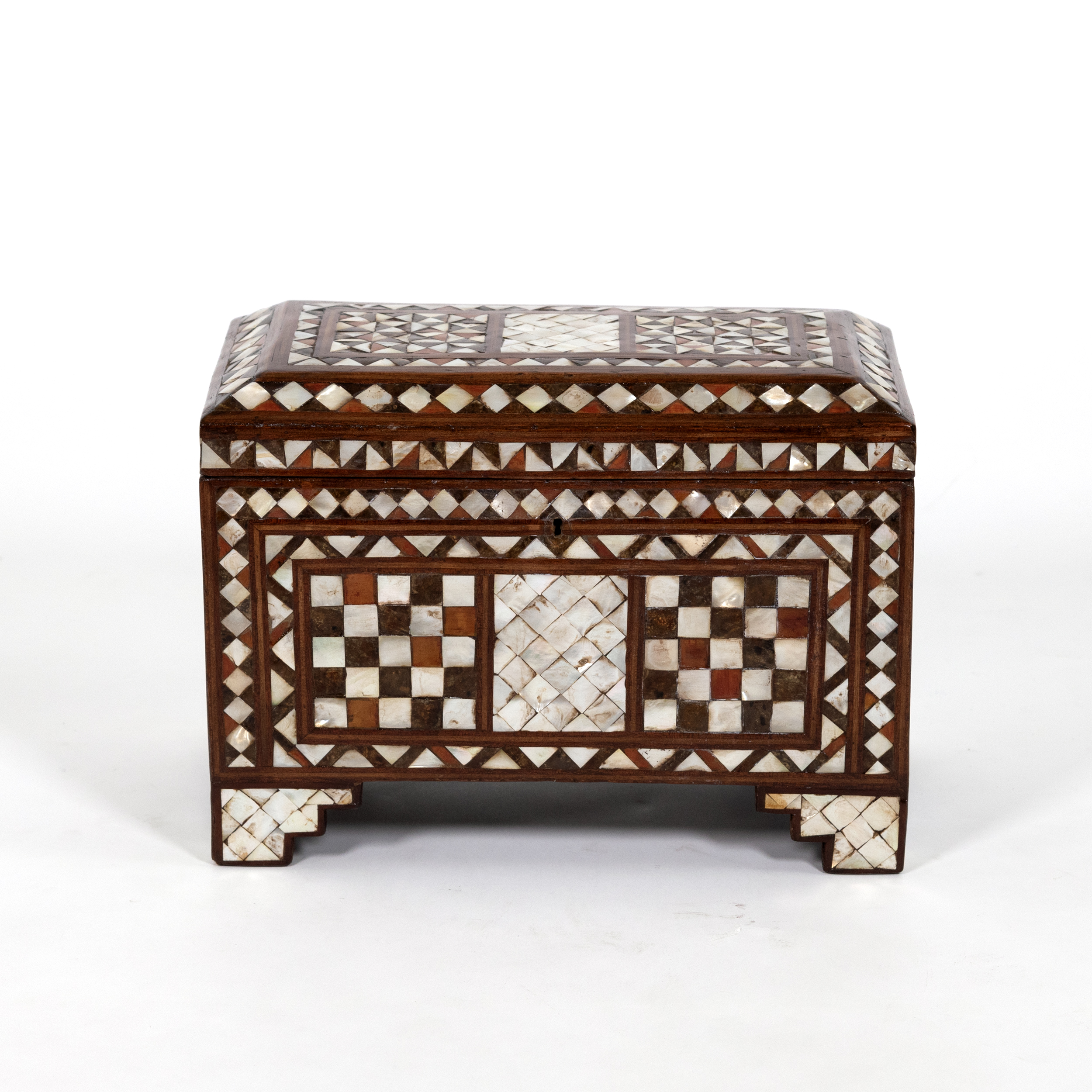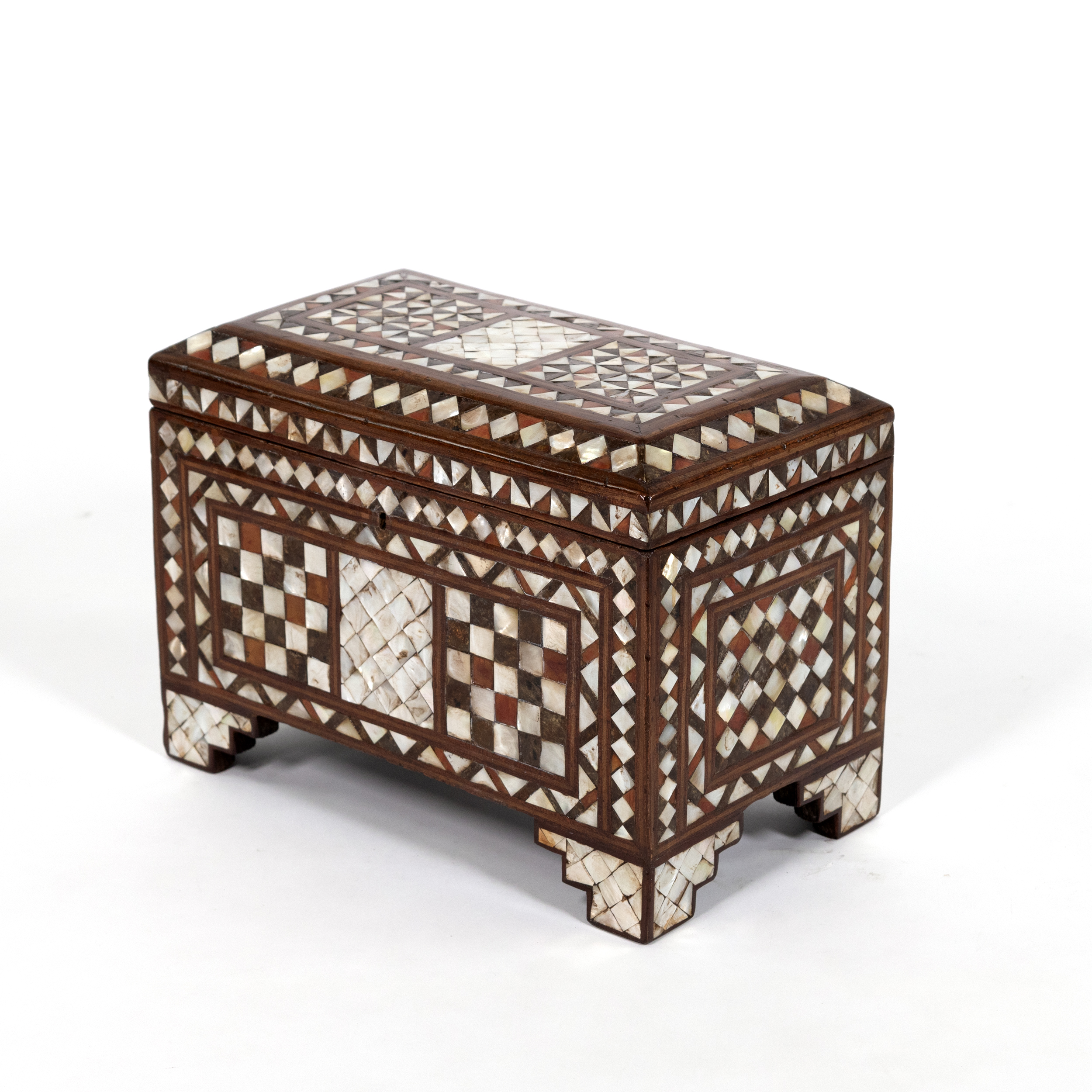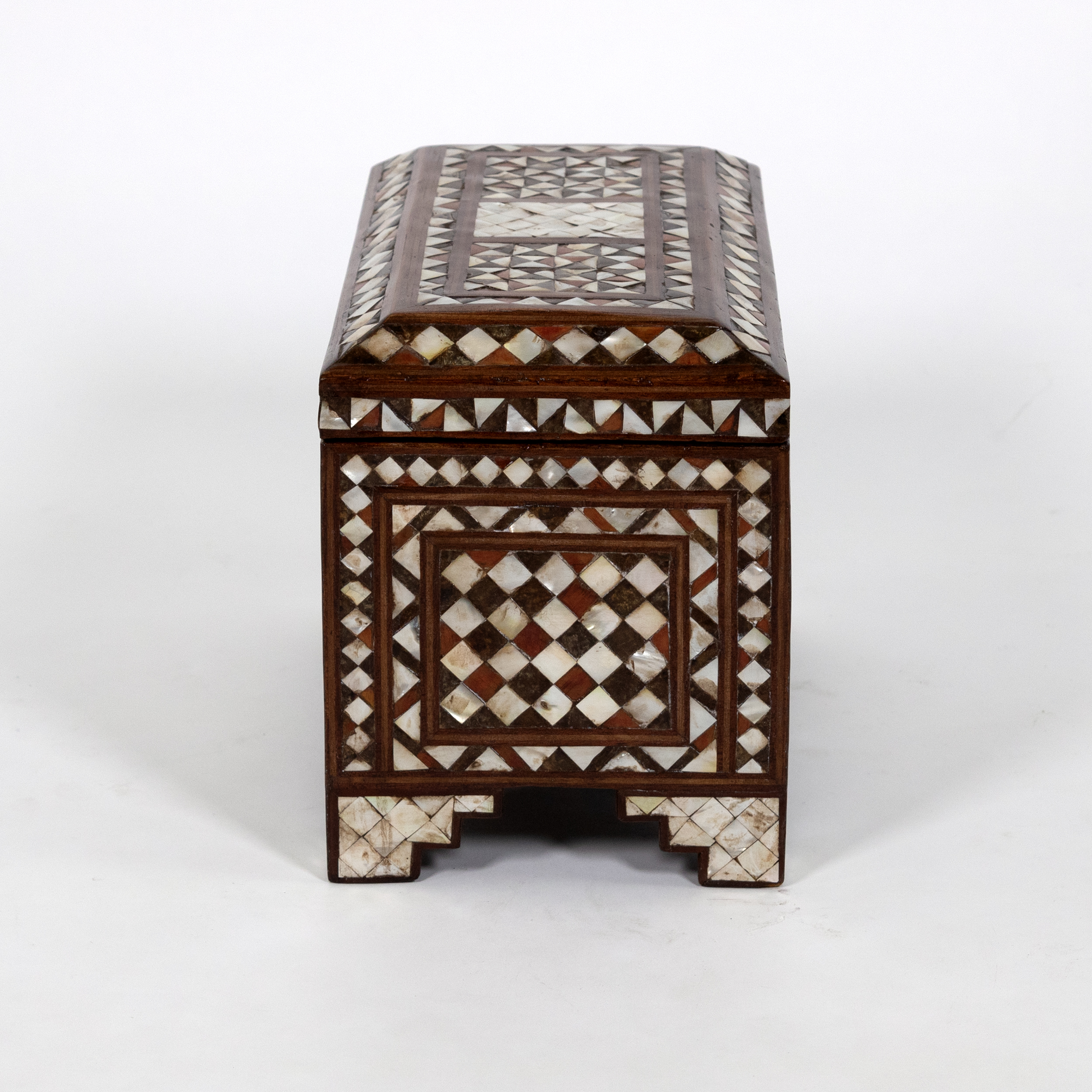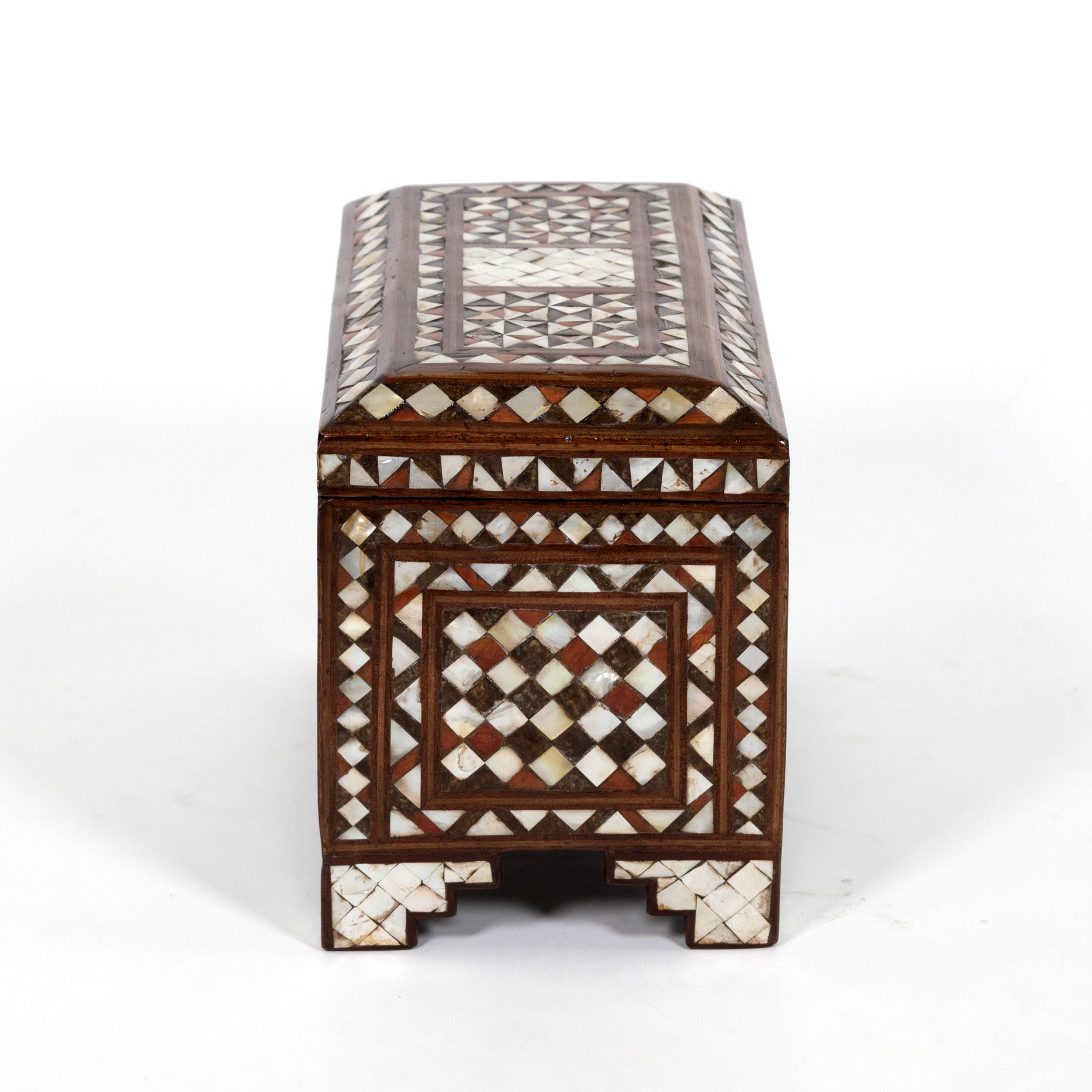 Very decorative Ottoman Empire table box with all sides inlaid with harlequin style marquetry including mother of pearl, various hardwoods, and shell underlaid with various colored pigments in geometrical forms. A waxed solid wood interior with a lidded side compartment. The box stands upon stepped bracket feet. Hand French polish. This box was most likely a marriage box and is rare for its smaller size.