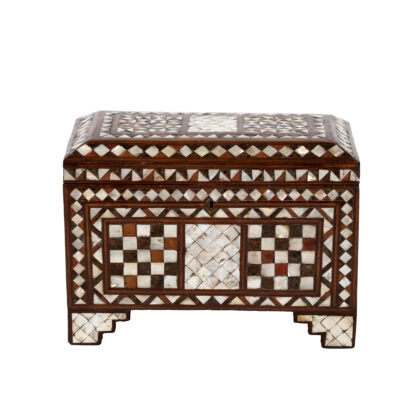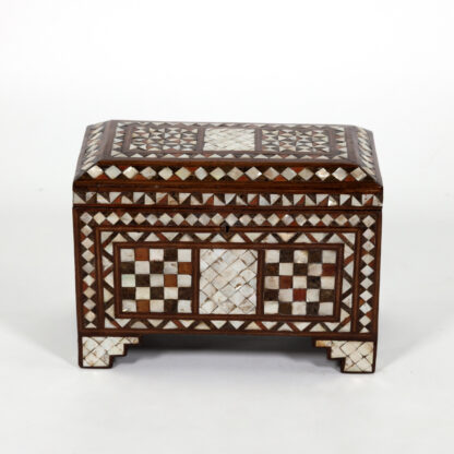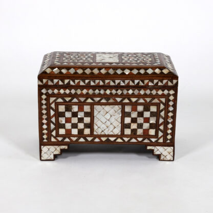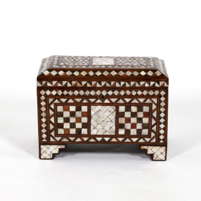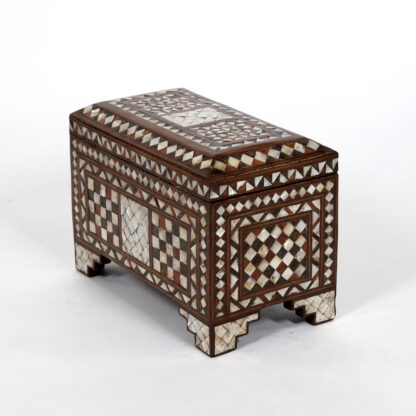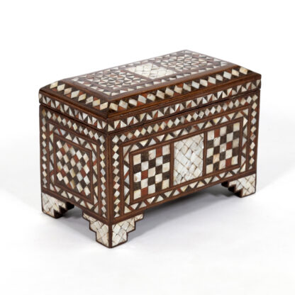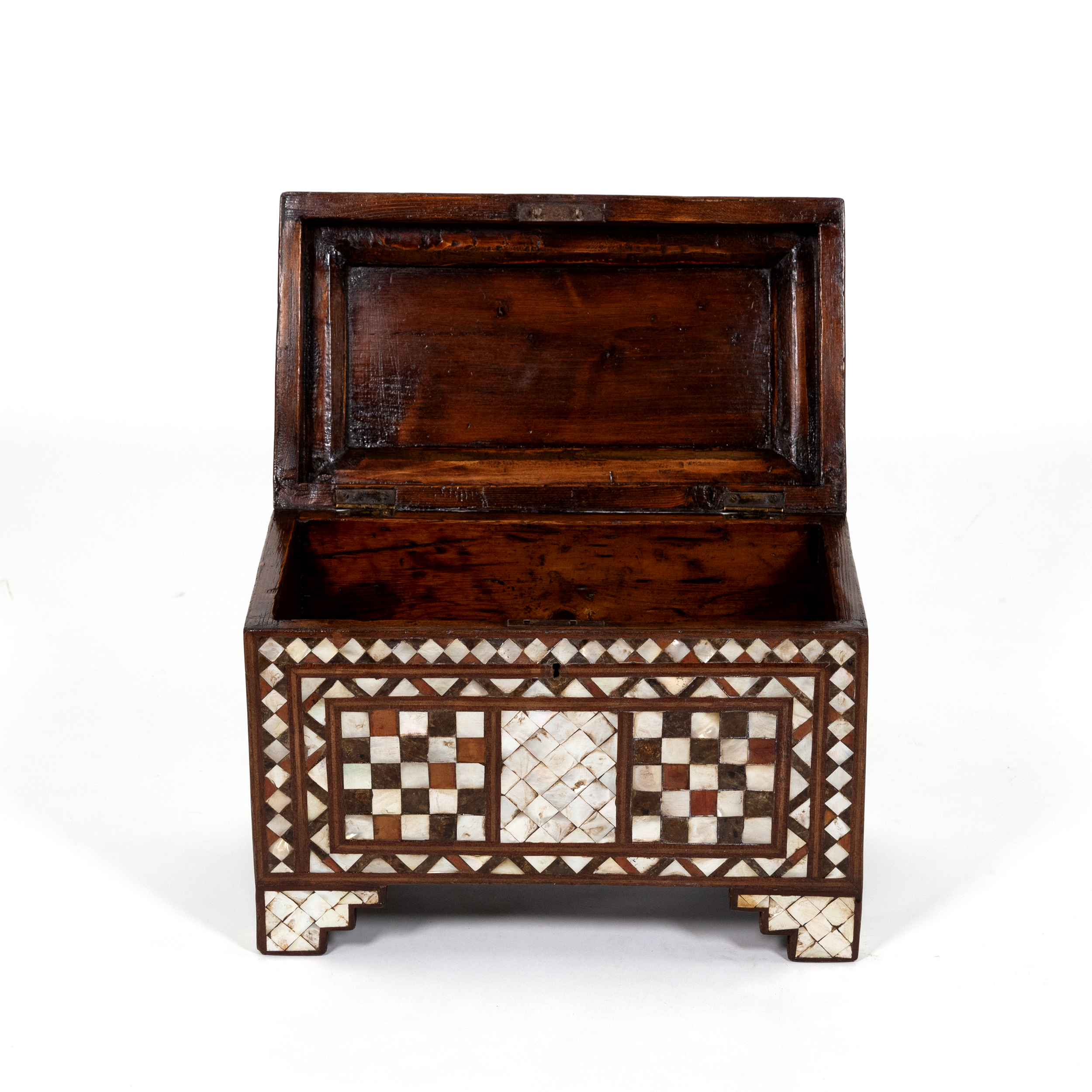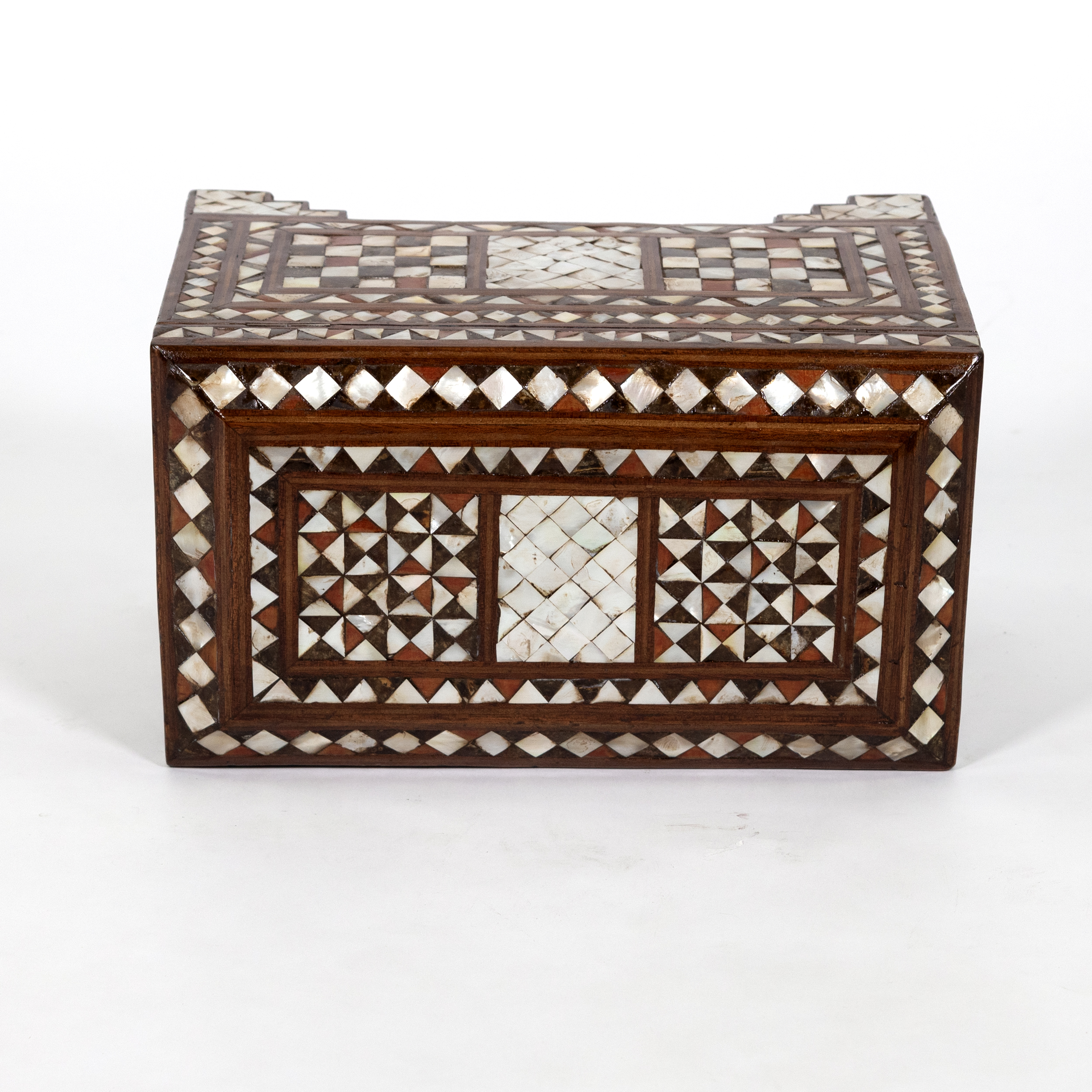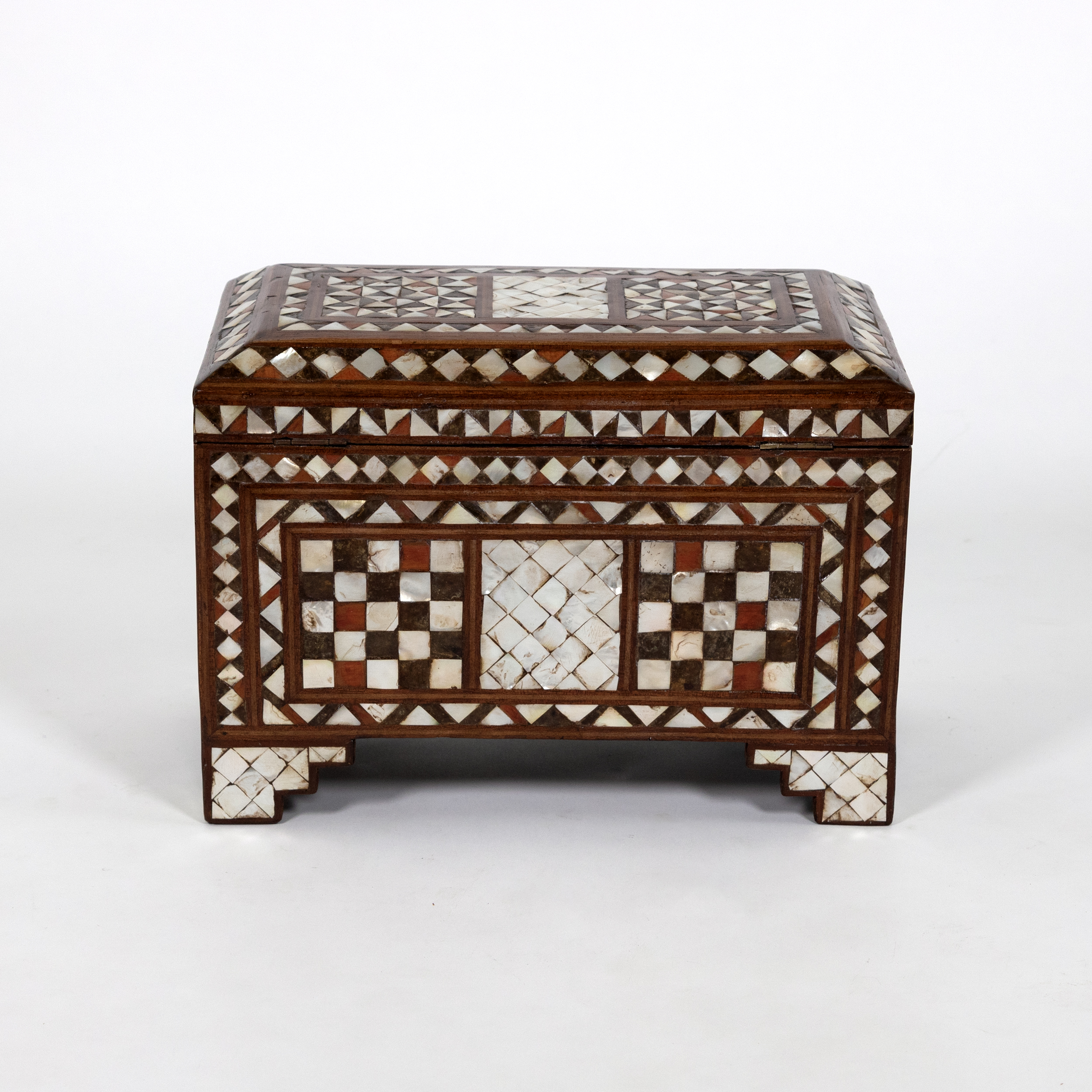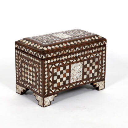 Very decorative Ottoman Empire table box with all sides inlaid with harlequin style marquetry including mother of pearl, various hardwoods, and shell underlaid with various colored pigments in geometrical forms. A waxed solid wood interior with a lidded side compartment. The box stands upon stepped bracket feet. Hand French polish. This box was most likely a marriage box and is rare for its smaller size.