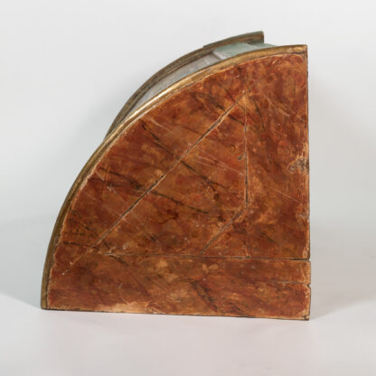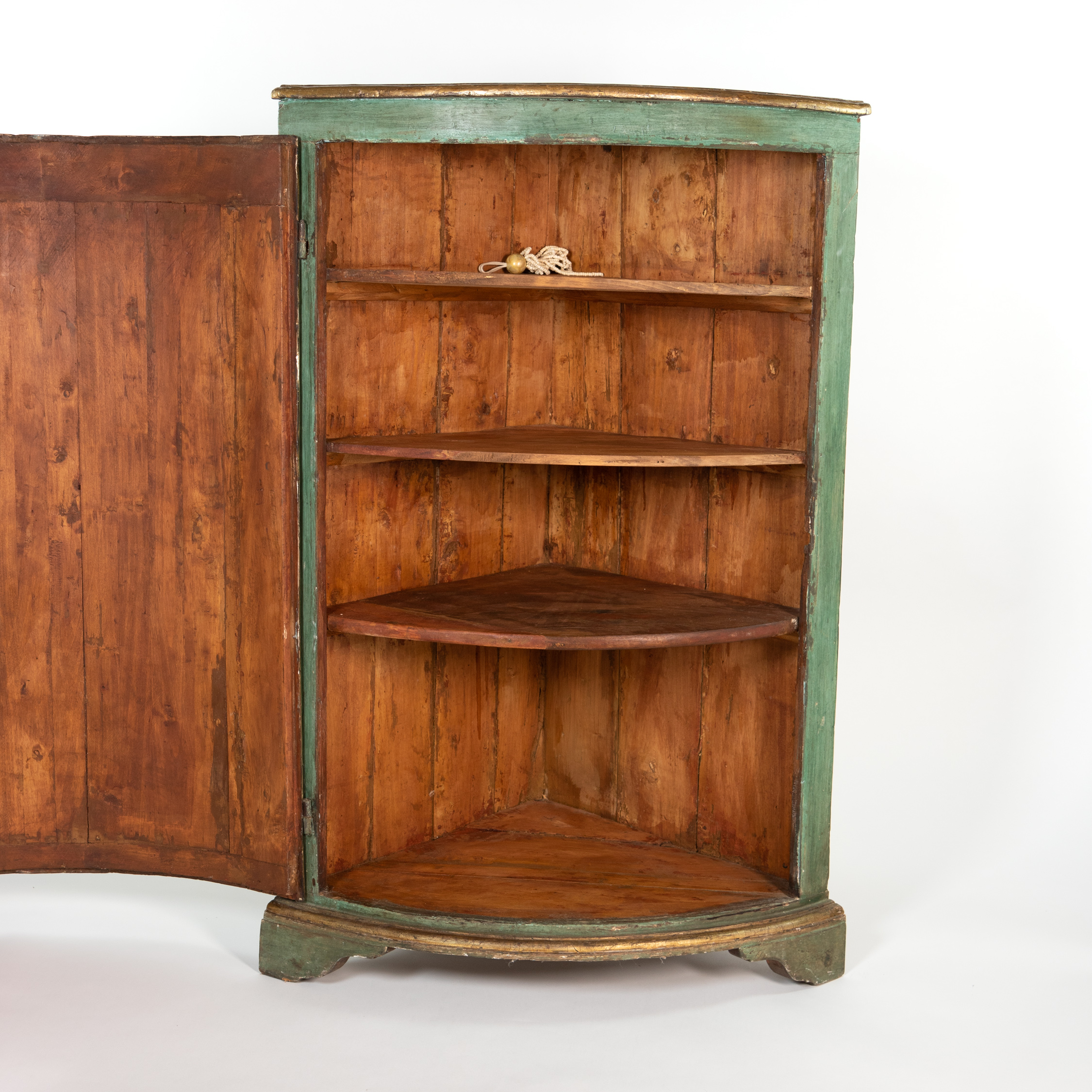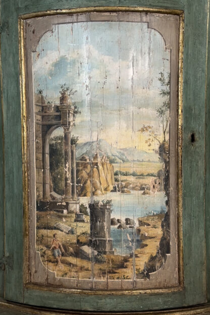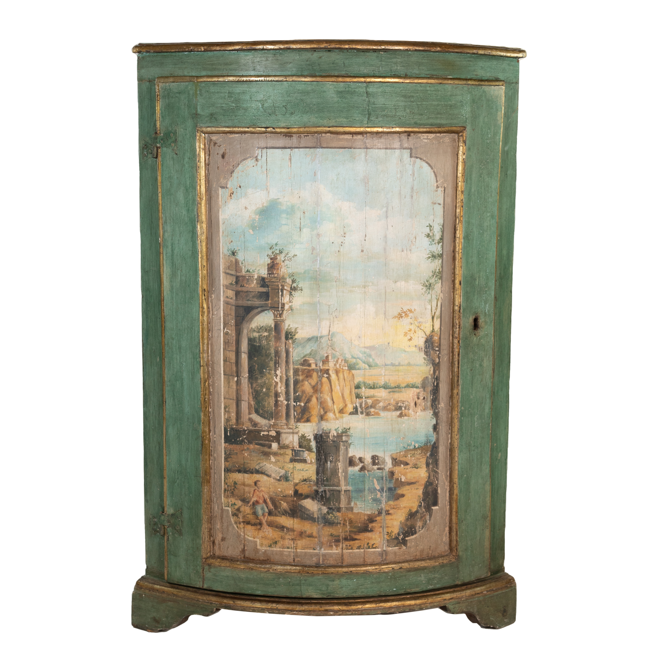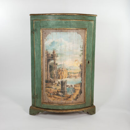 Painted Italian Bowfront corner cupboard, sage green ground with faux marble painted top, gilded edging, single door with neoclassical pastoral scene, all sitting on bracket feet, Italy circa 1780