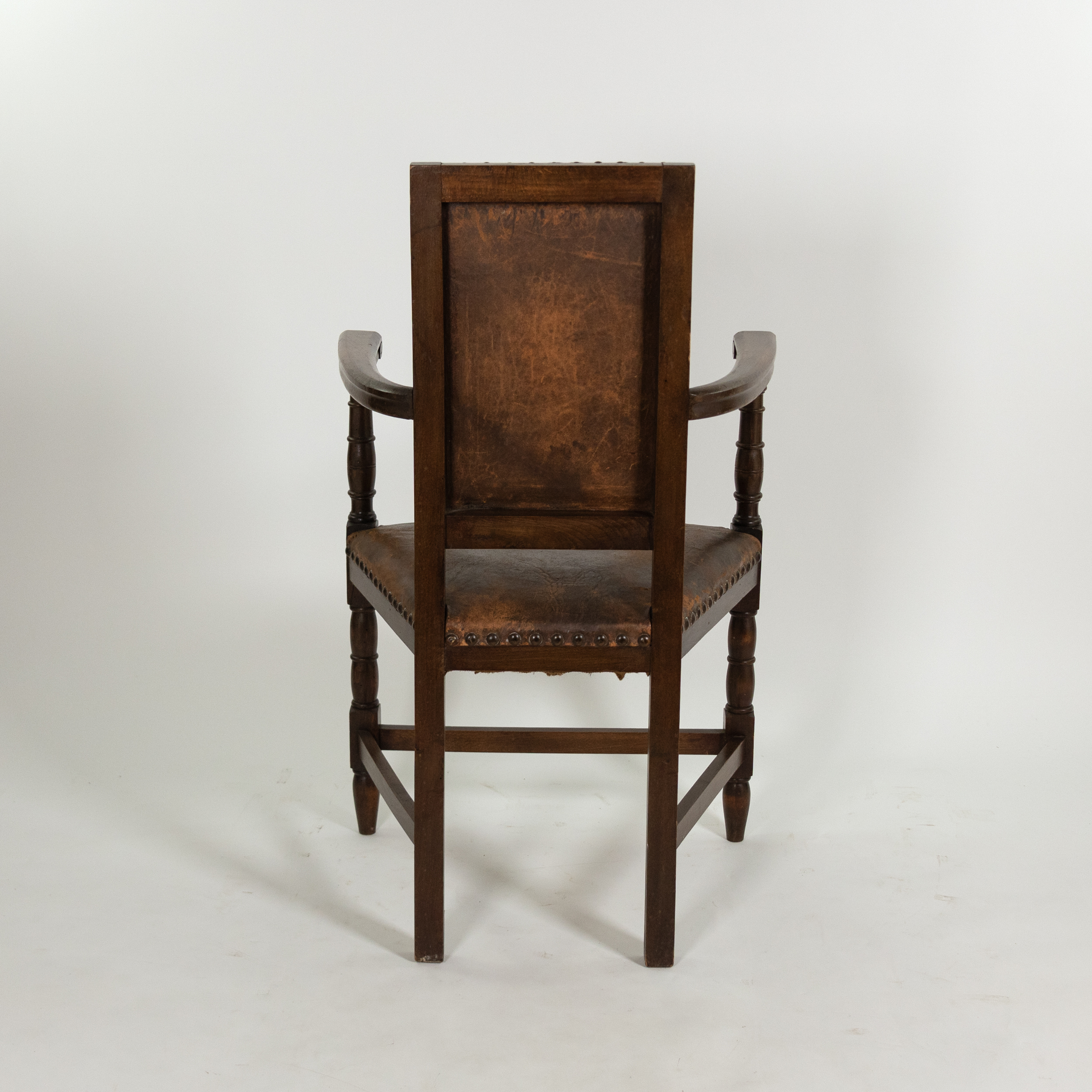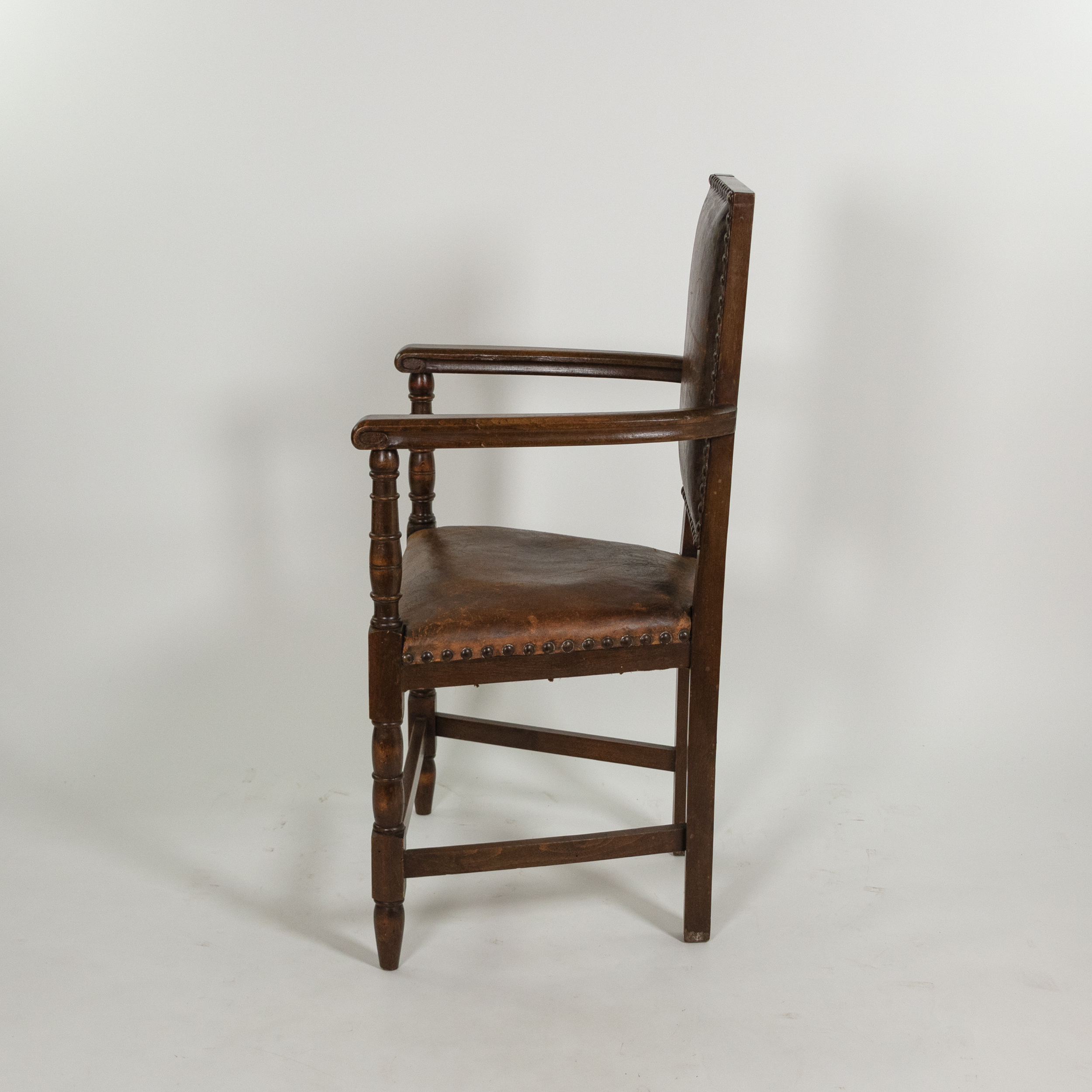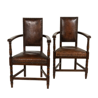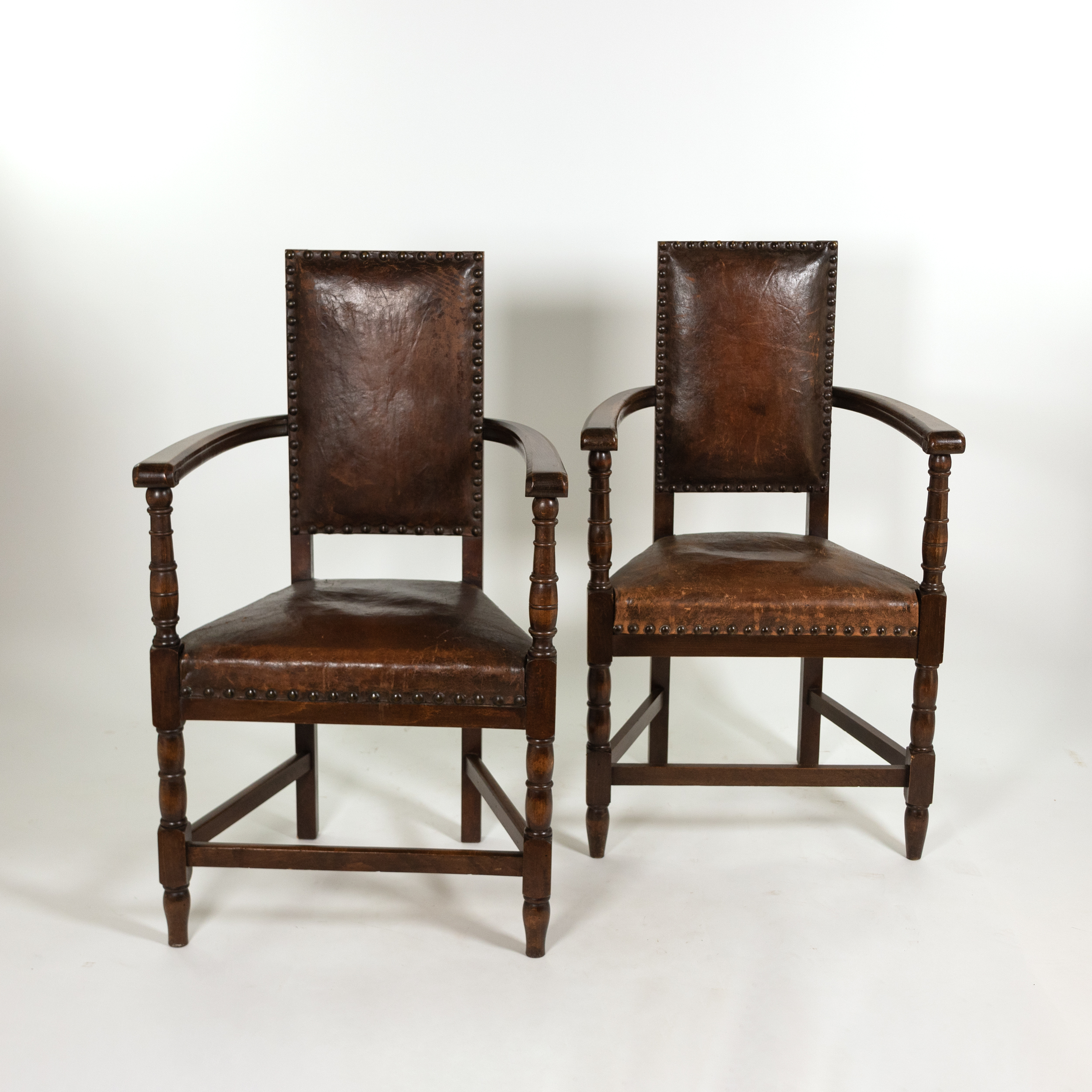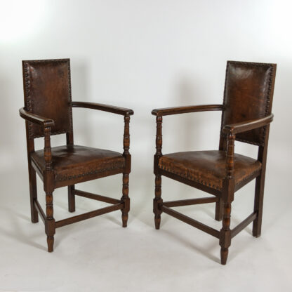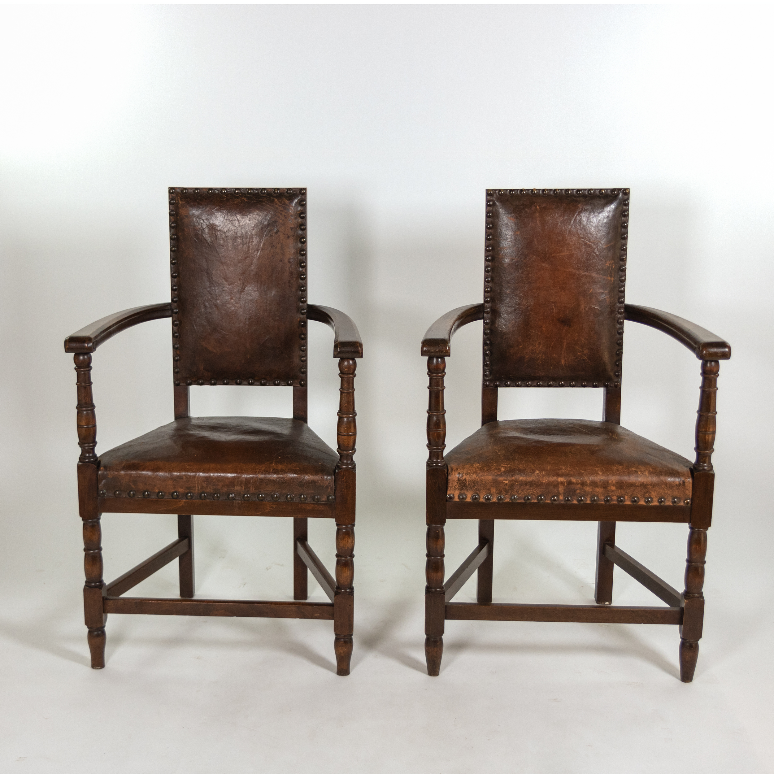 An unusual pair of beechwood armchairs with leather upholstery and nailhead trim; a narrow leather-covered back is met by curved arms, on turned supports with box stretchers. French, circa 1900.