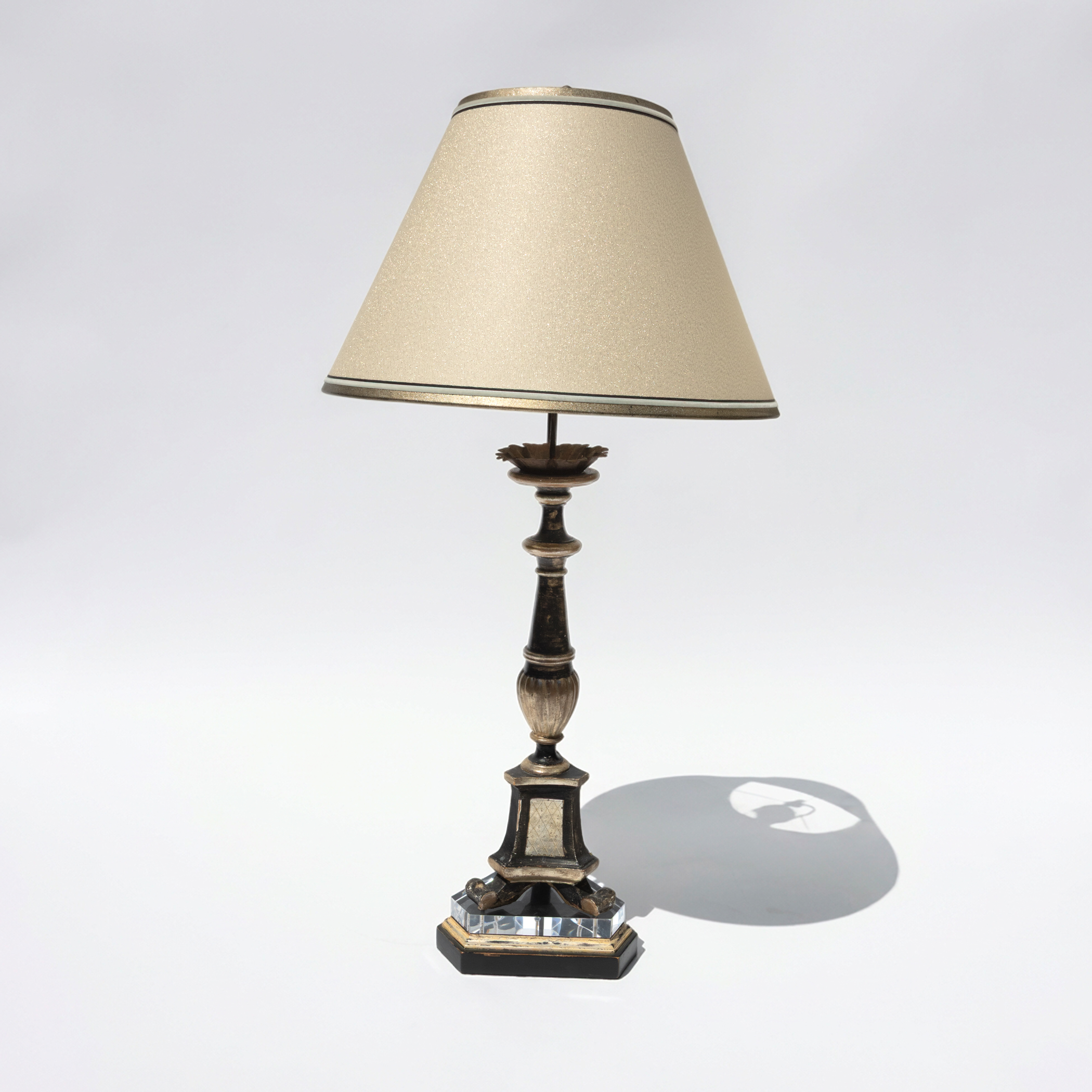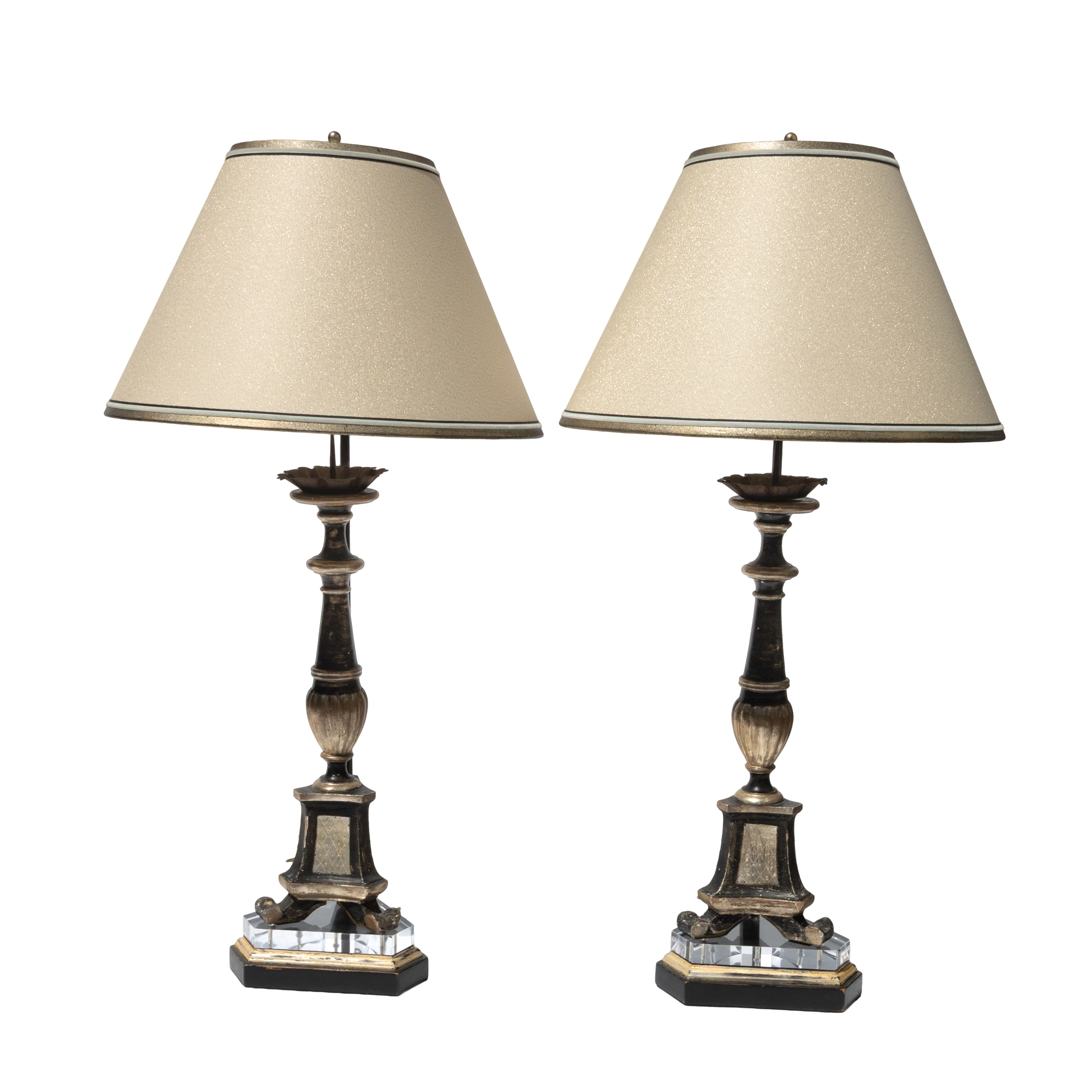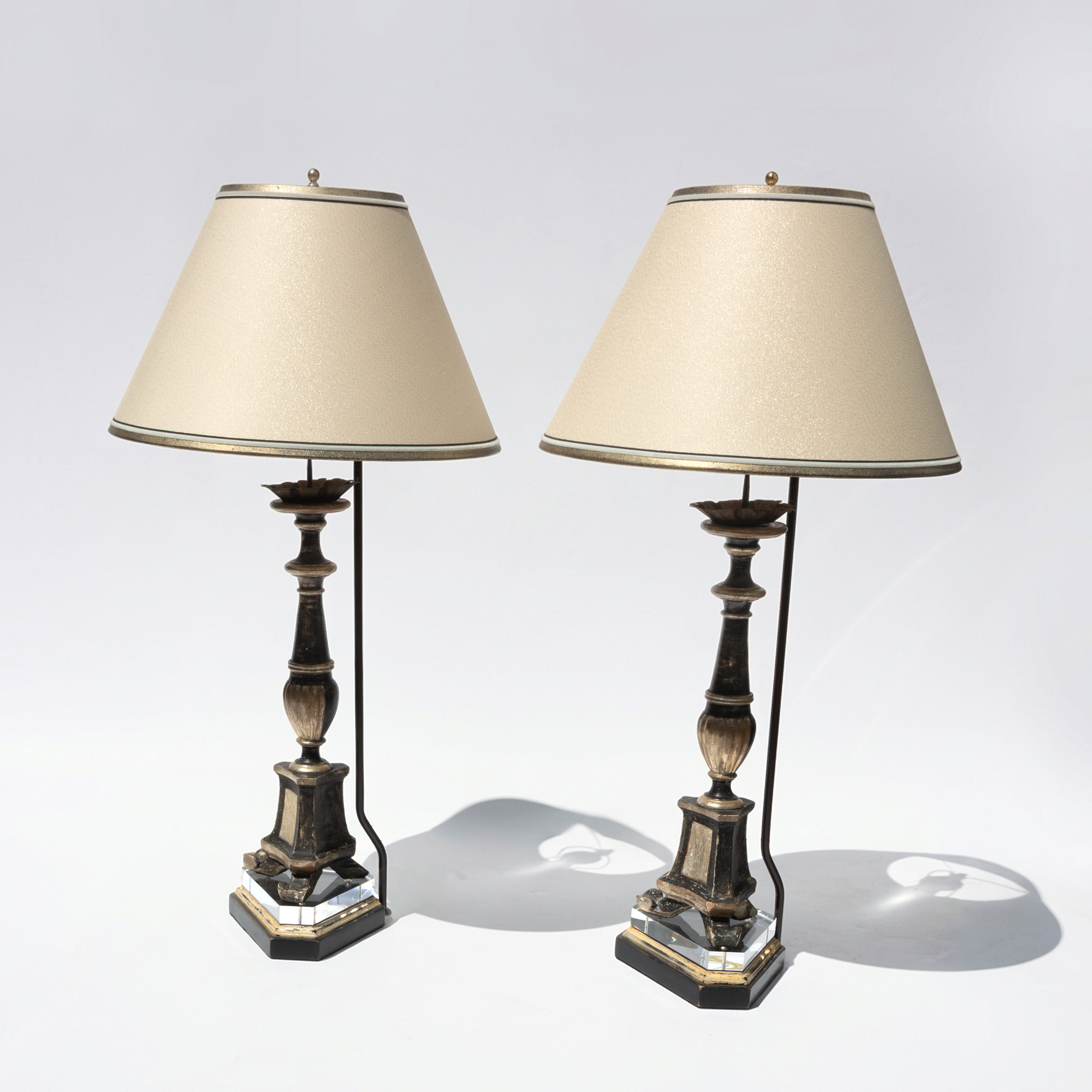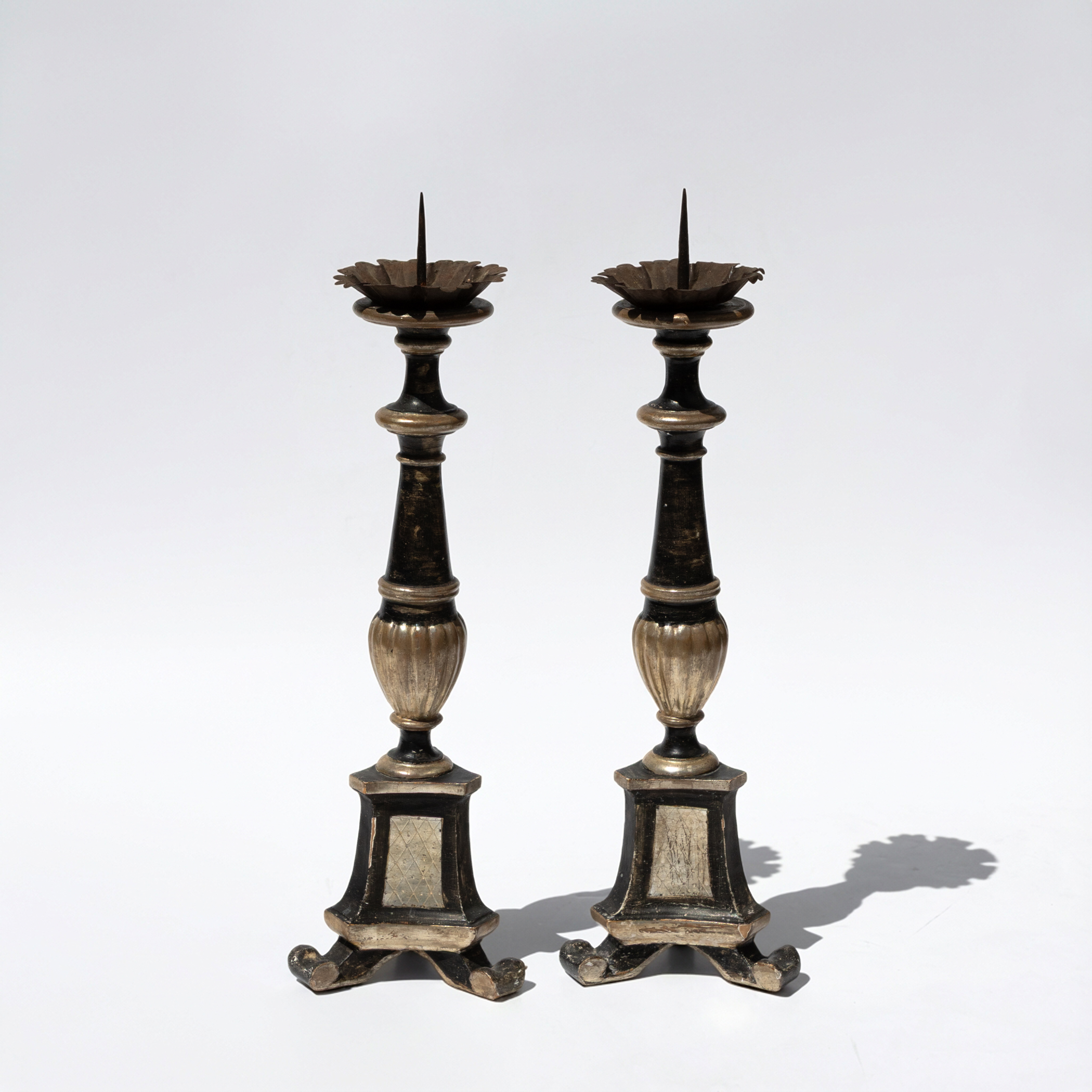 Pair of early 19th-century carved wood candlesticks, painted black and parcel-silver-gilt, adapted as table lamps. The baluster-form standards rise from triform bases with canted corners, detailed with inset panels of incised lattice decoration. The whole raised on scroll feet. Minor wear and rubbing to painted and gilded surfaces consistent with age. Period Italian, circa 1820