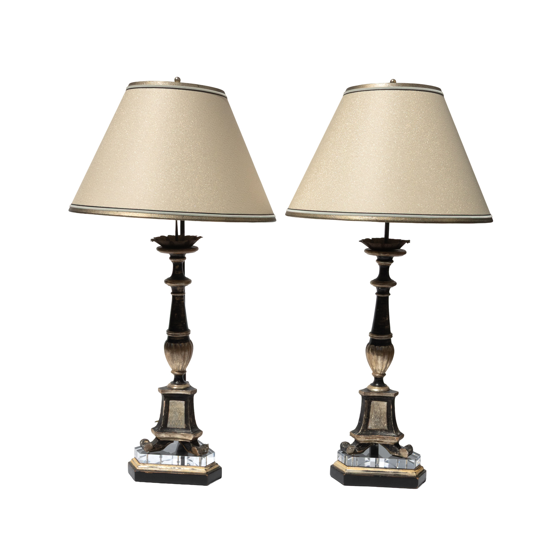 Pair of early 19th-century black and silvergilt candlesticks mounted as lamps with custom shades.
