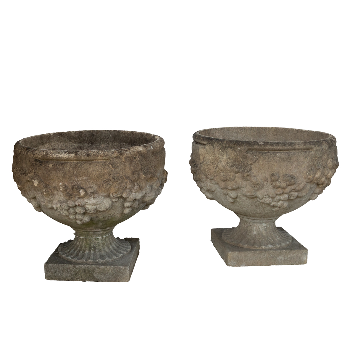Pair Of Cast Stone Urns With Raised Reliefs Of Swags And Grapes On A Fluted Column On A Square Base