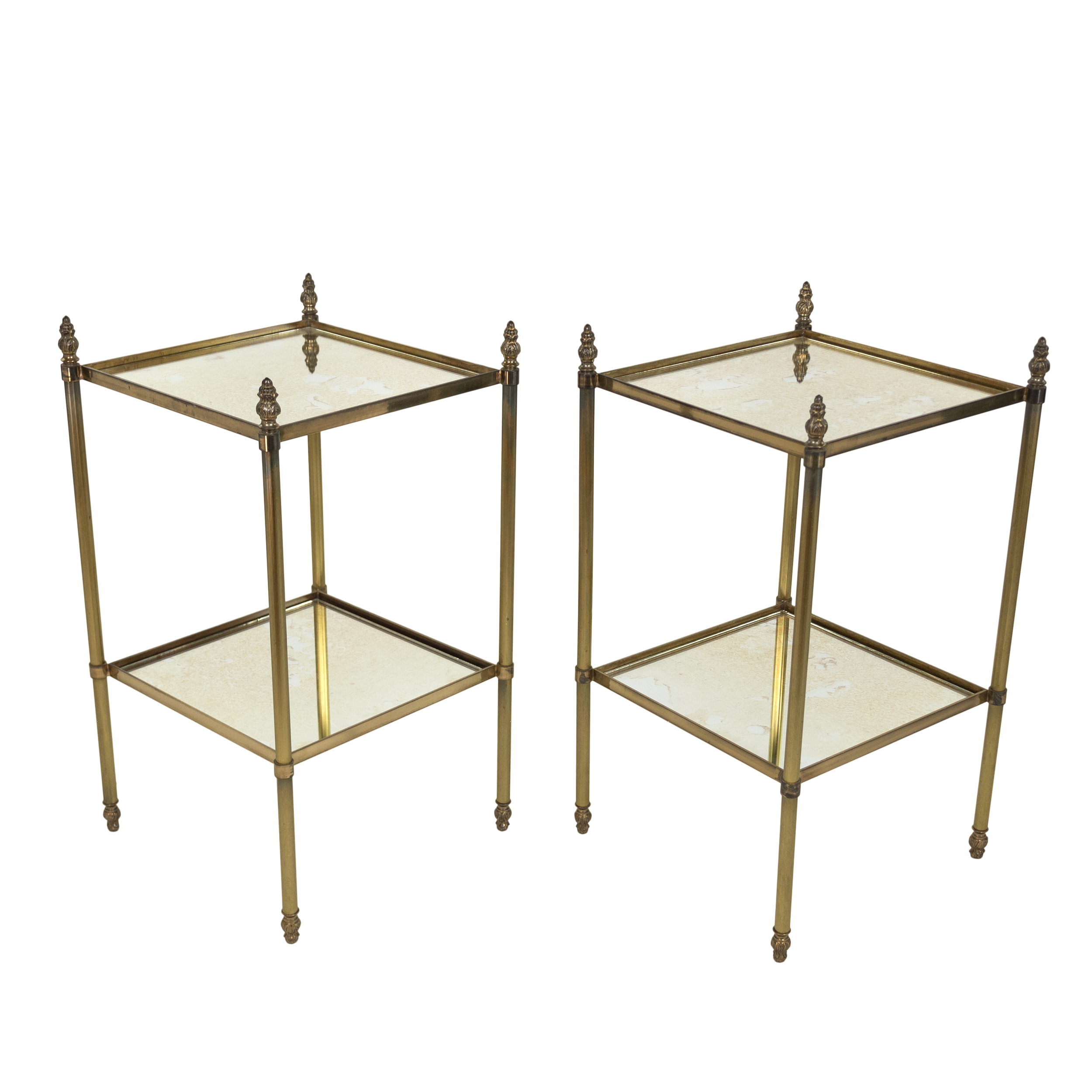 A pair of French Art Deco cocktail tables featuring fluted brass frames and square antique mirror shelves. Each table stands on four slender legs, topped with decorative finials. height: 24 in. (61 cm.) Sold as a pair.