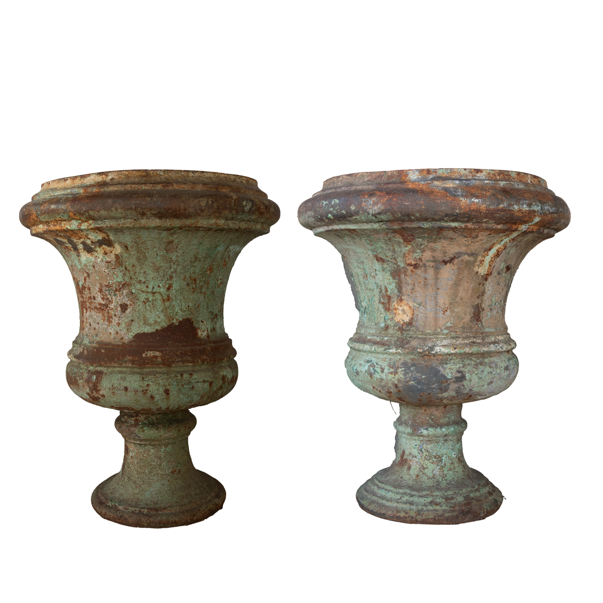 Pair Of Large Scale Green Painted Iron Pedestal Urns