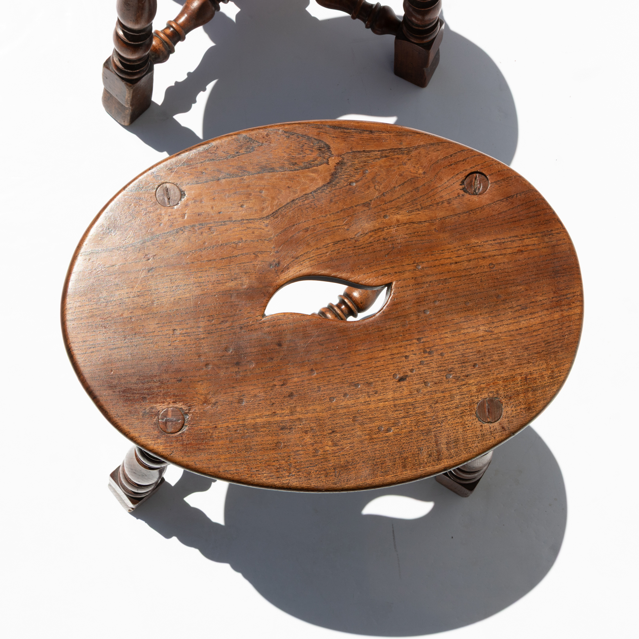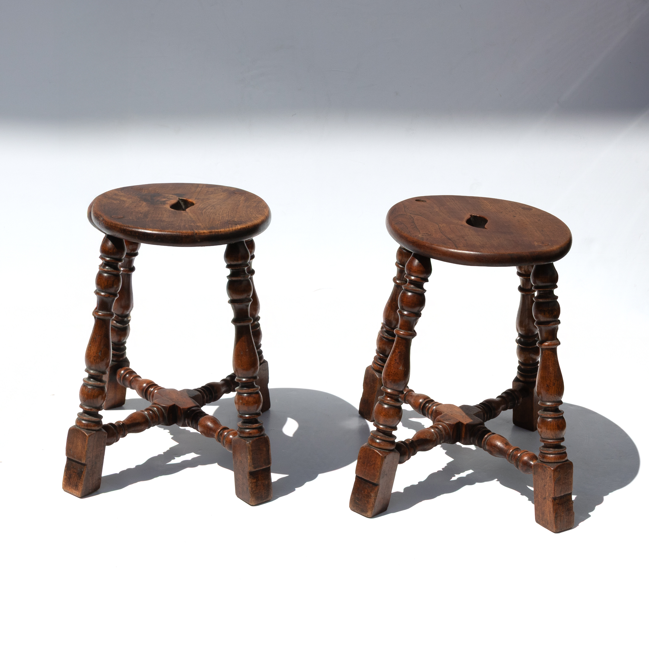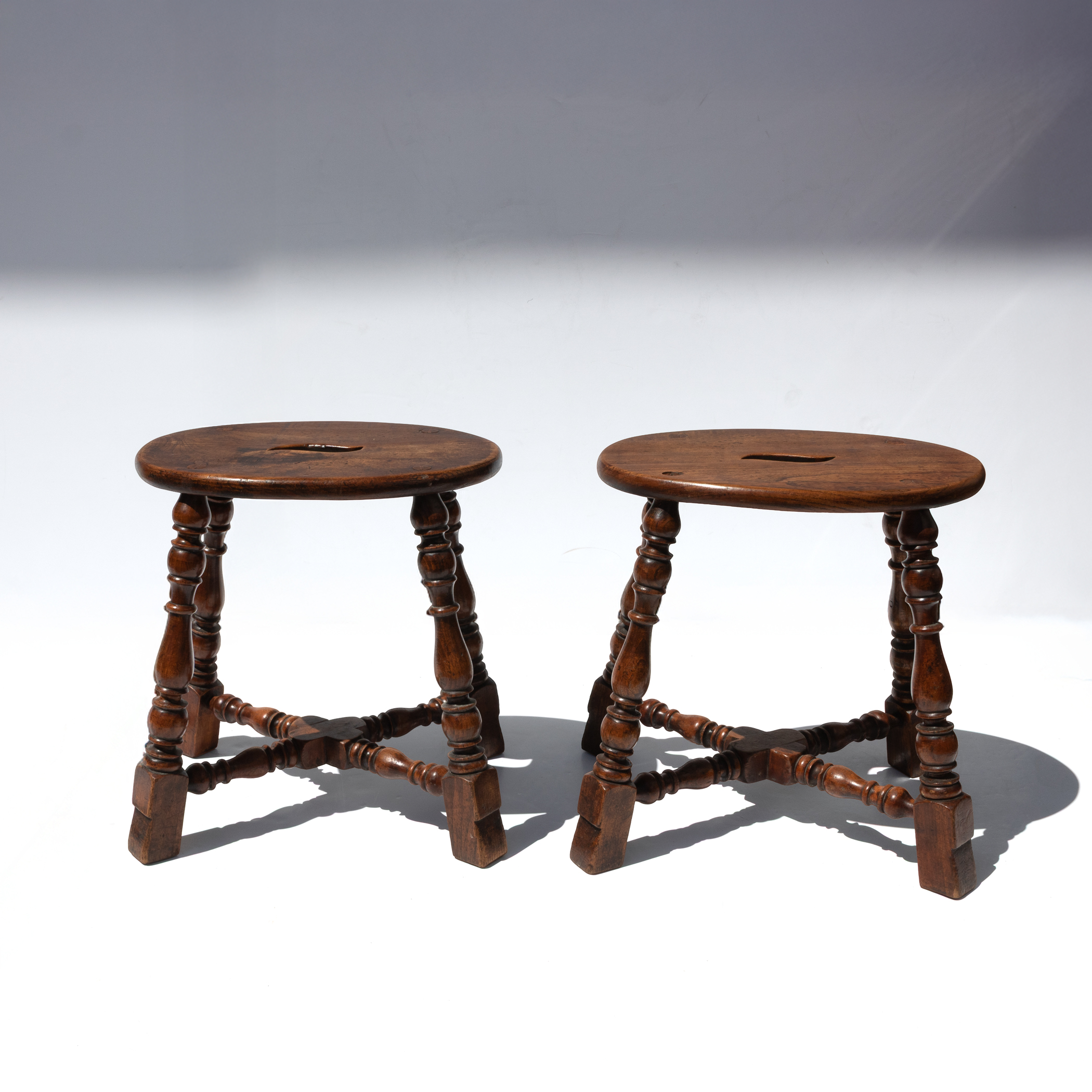 A pair of late-19th-century oval oak stools with shaped hand-grip apertures to the seats. Each stool is supported on four turned legs joined by turned and block-form stretchers set in a cross formation. The seats show shaped circular plugs consistent with period construction, and each retains a well-worn surface with expected early wear. The stools sit on slightly splayed feet, giving stability to the compact form.