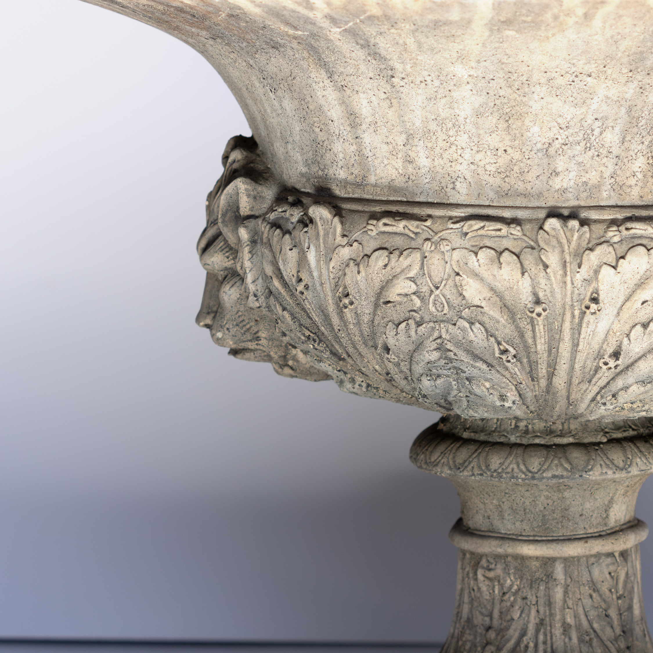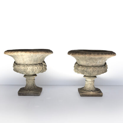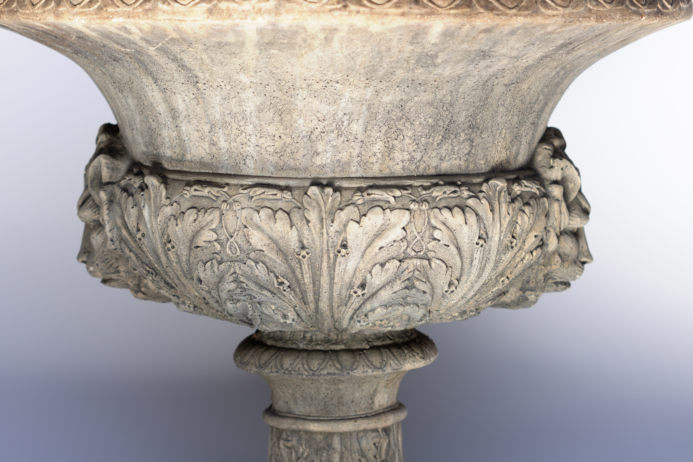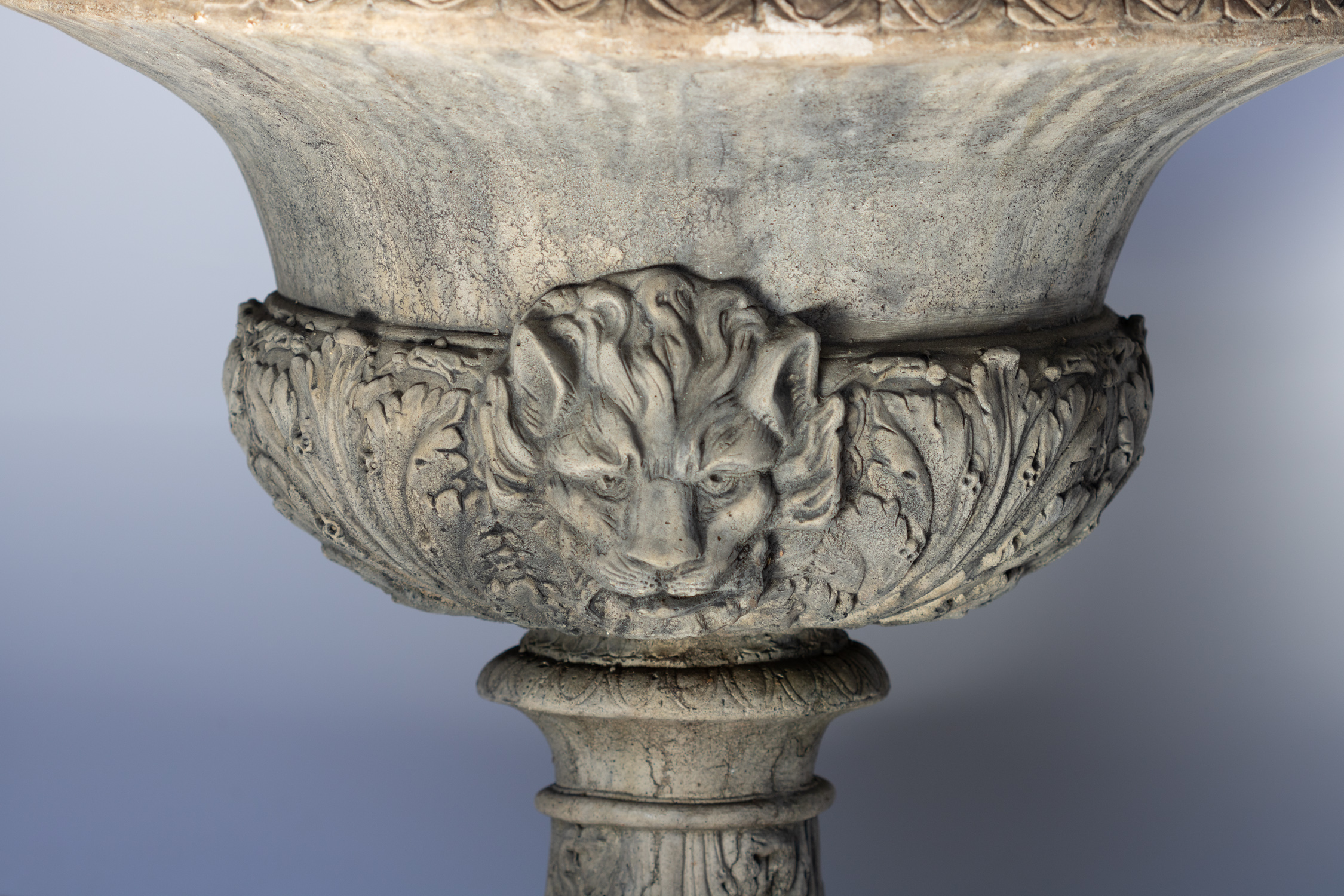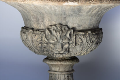Pair of Terra Cotta pedestal urns with egg and dart collar, lion face handles and foliate motif wrapping the base of the urn and down the pedestal base, English circa 1900.