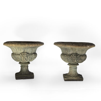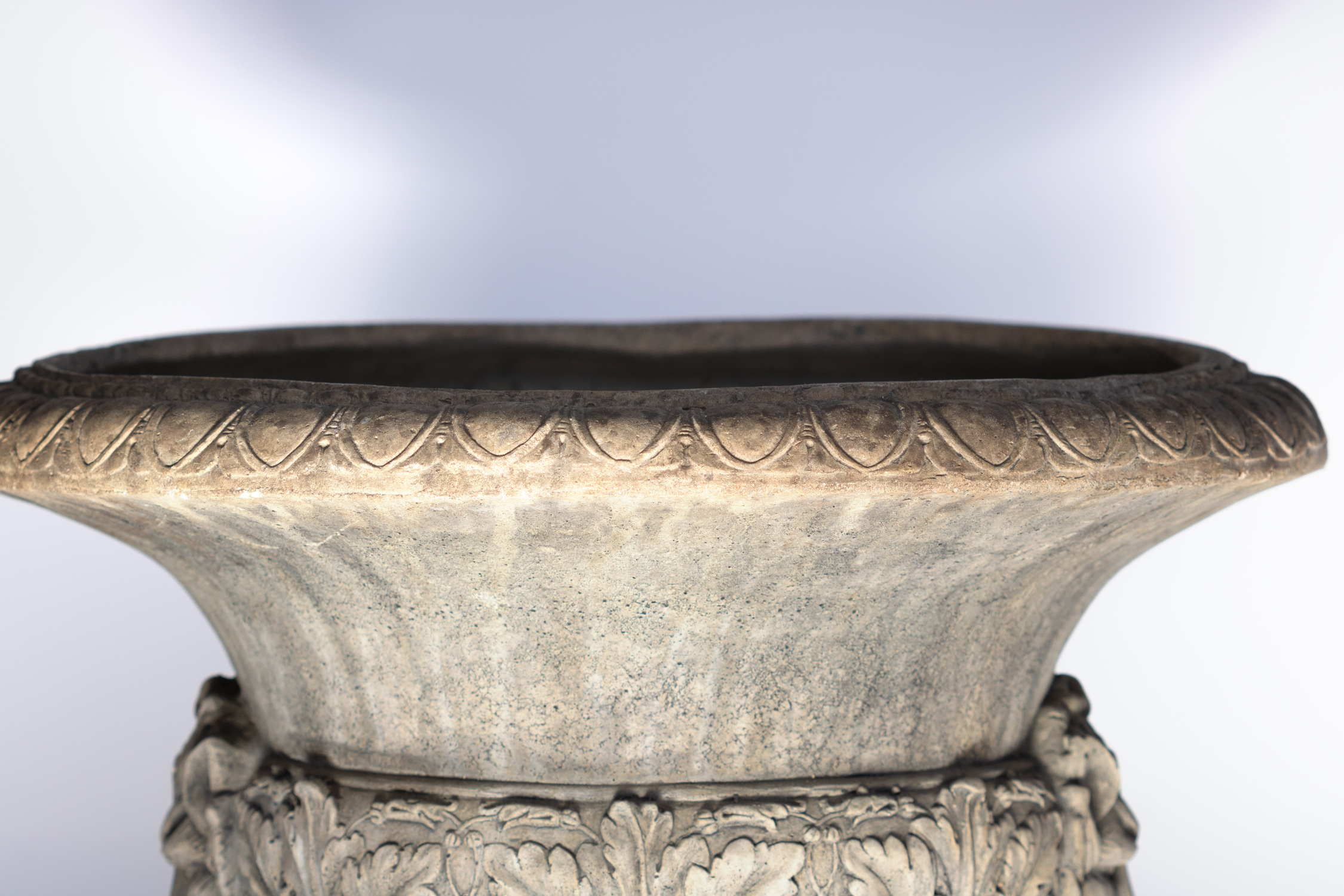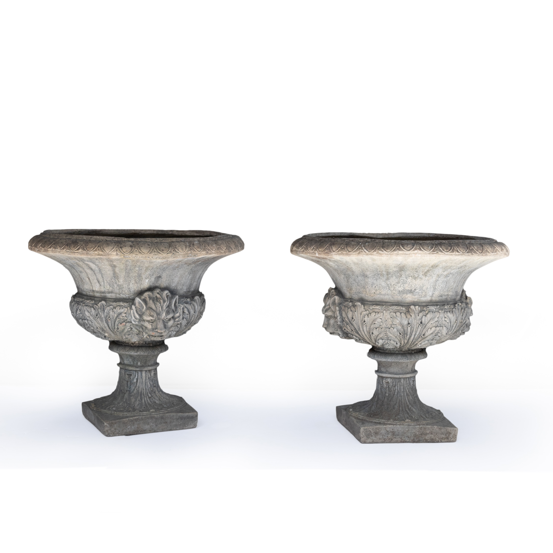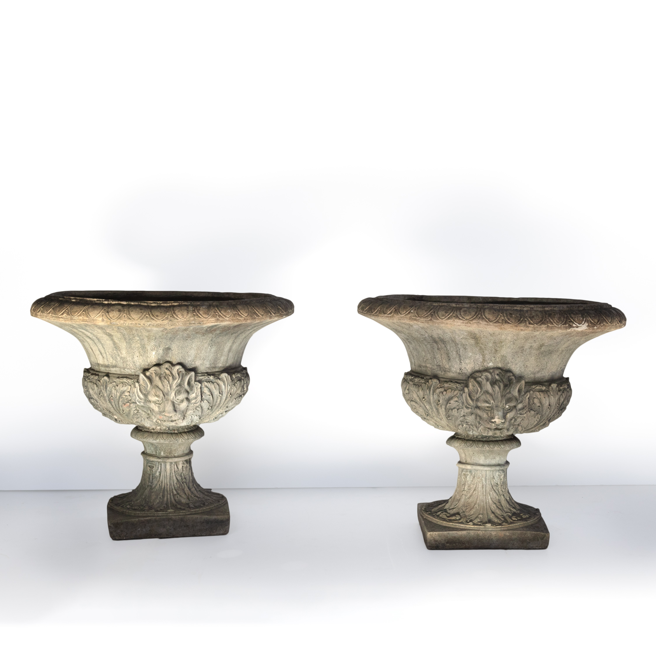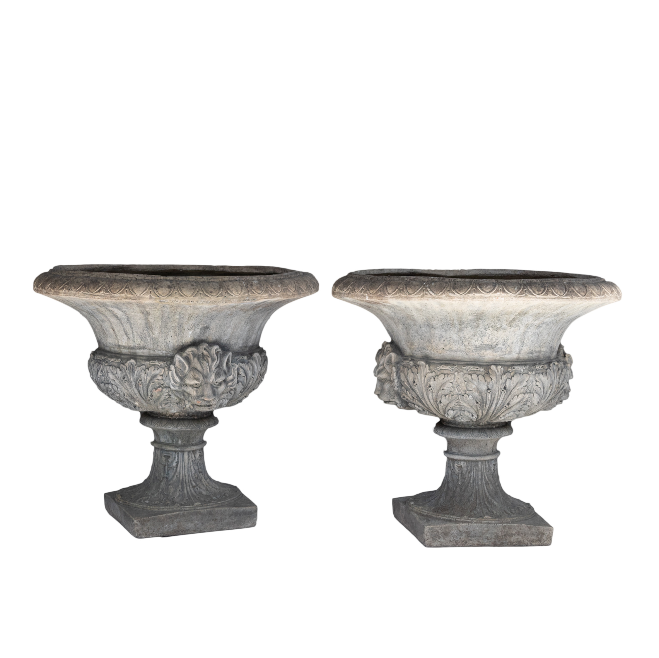 Pair of Terra Cotta pedestal urns with egg and dart collar, lion face handles and foliate motif wrapping the base of the urn and down the pedestal base, English circa 1900.