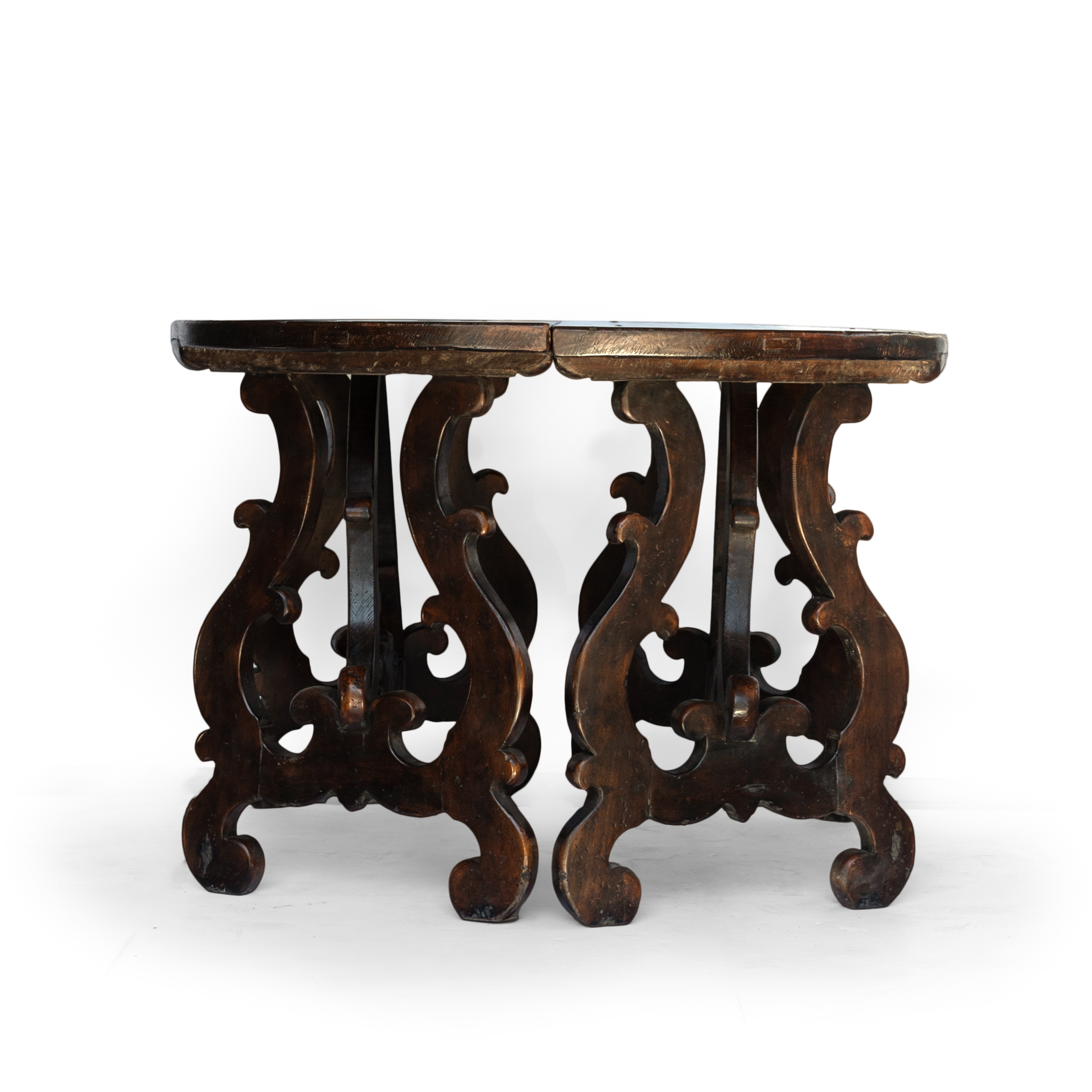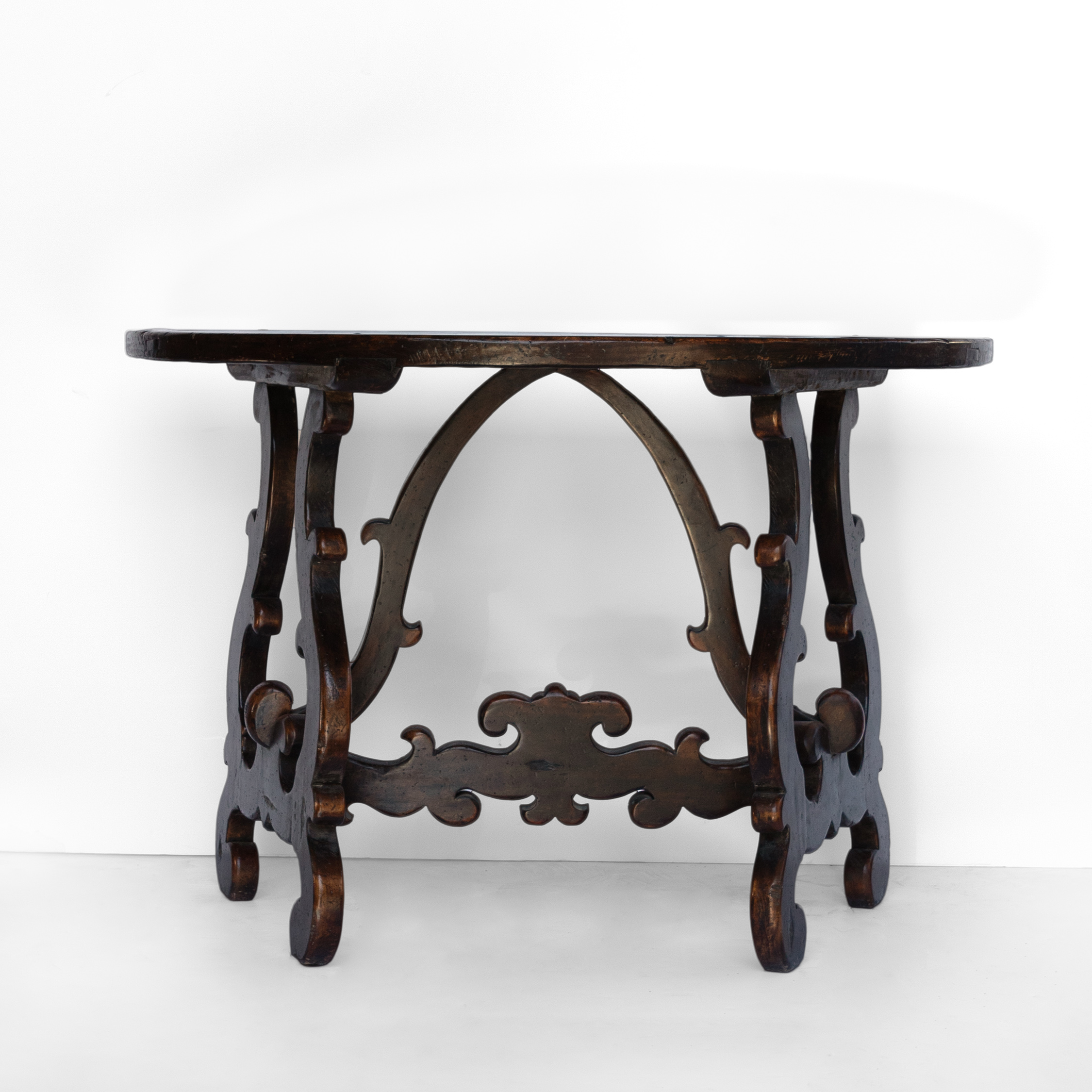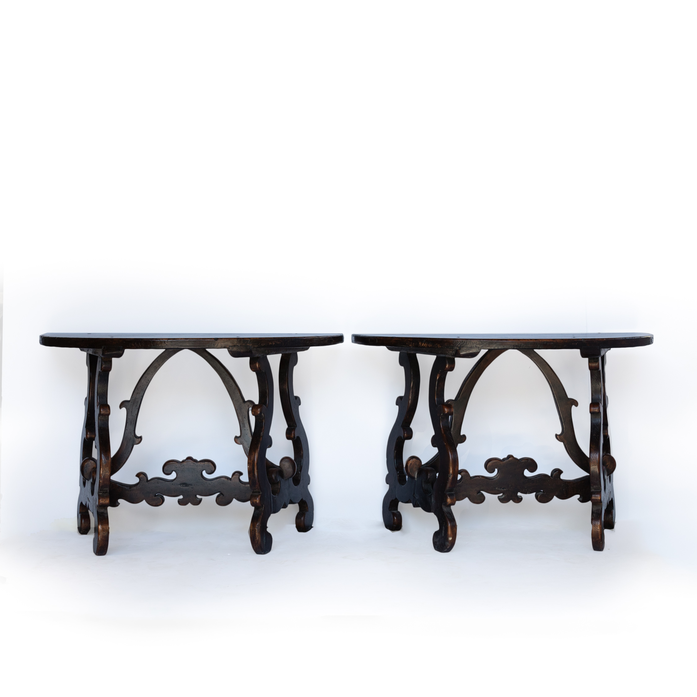 Spanish Baroque Style walnut demilune consoles with spreading harp shaped bases and walnut stretchers. Used back to back as a center table; moved to be used as a pair of consoles. Spanish circa 1890. Sold as a pair.