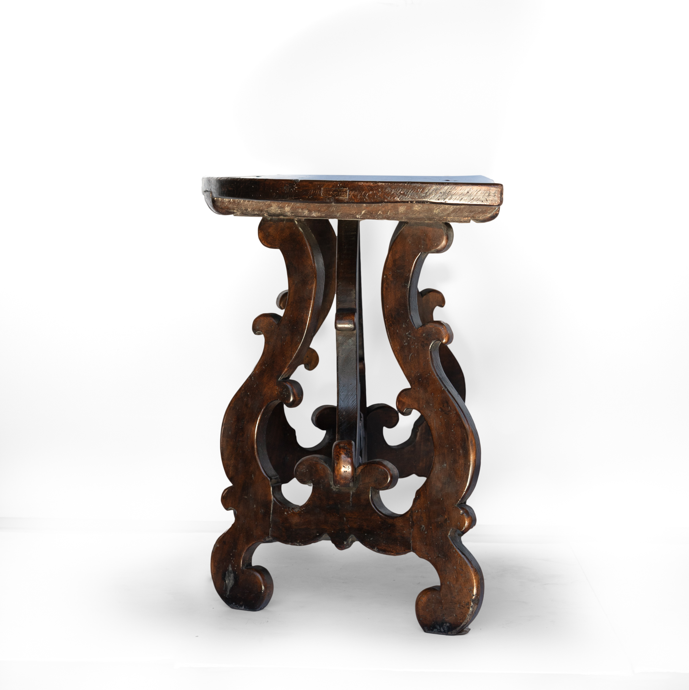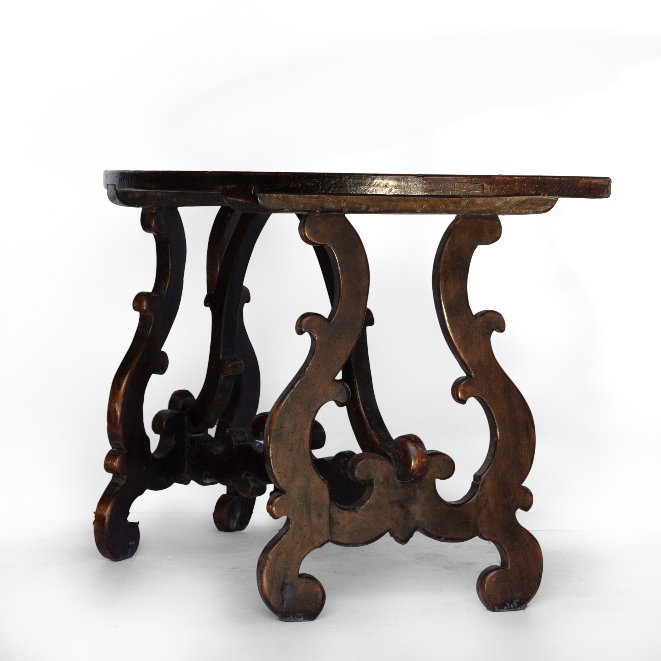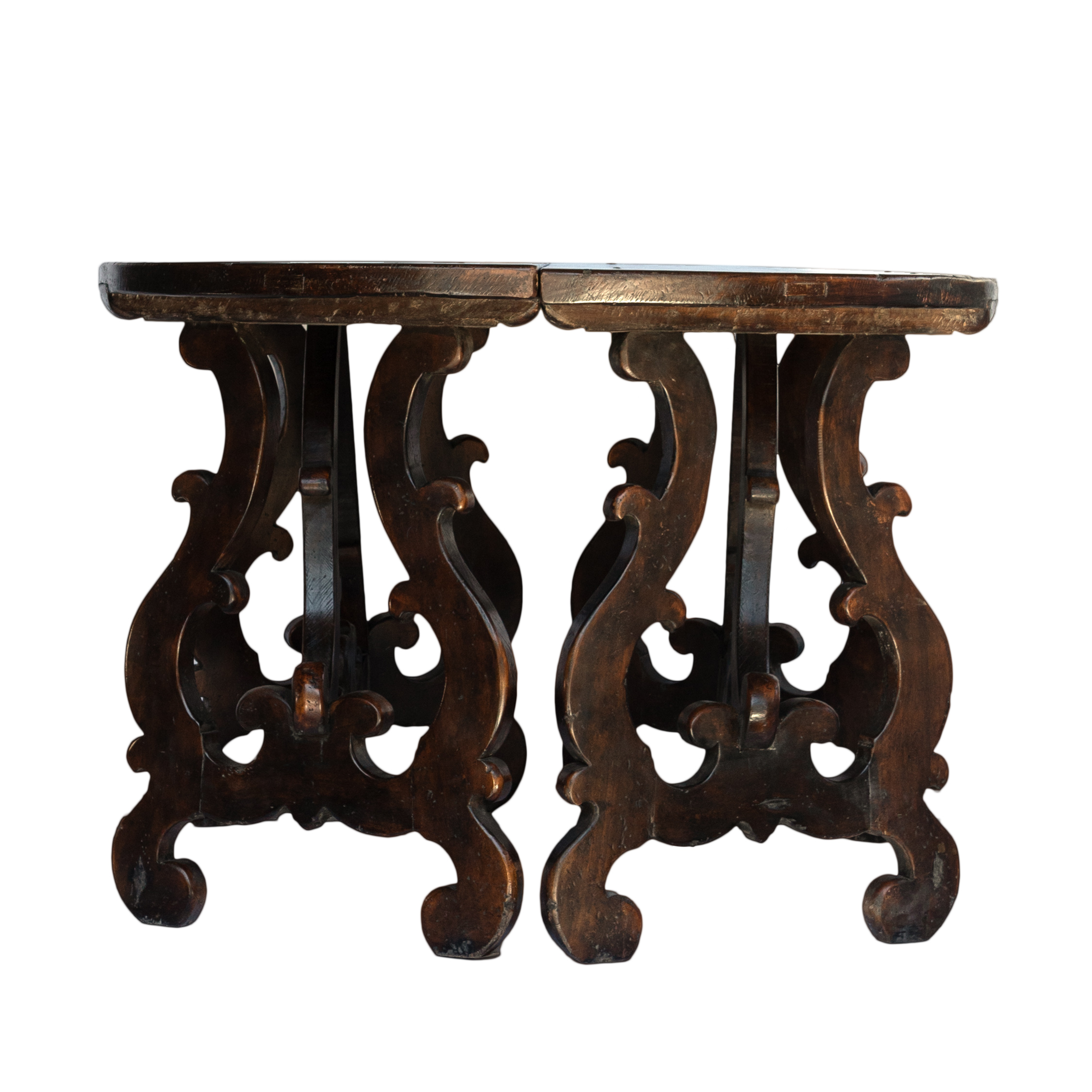 Spanish Baroque Style walnut demilune consoles with spreading harp shaped bases and walnut stretchers. Used back to back as a center table; moved to be used as a pair of consoles. Spanish circa 1890. Sold as a pair.