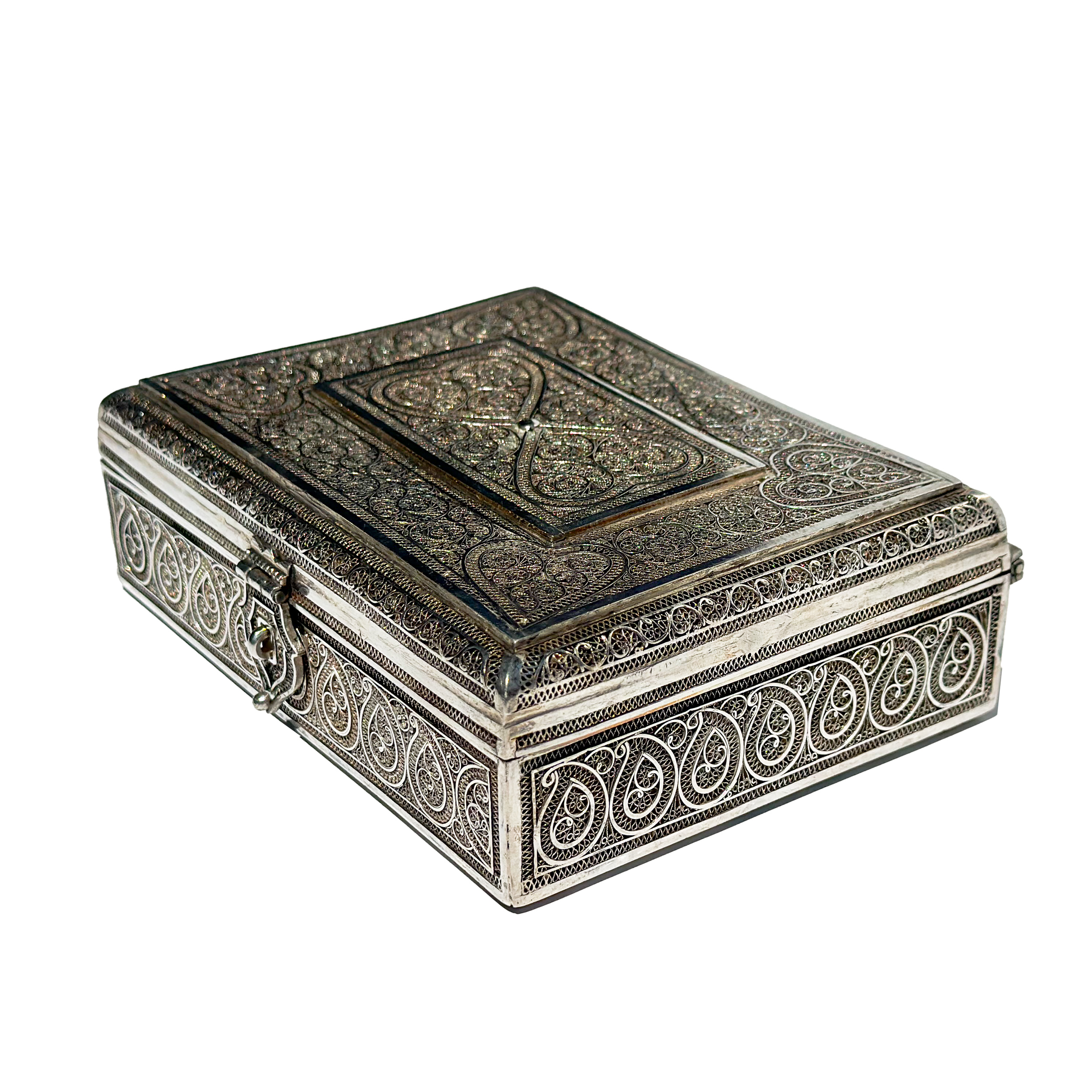 A rectangular hinged silver filigree box with intricate scrolling arabesque and heart motifs throughout. Central rectangular panel on lid framed by continuous border of scrollwork. Sides decorated with repeated teardrop (paisley) patterns and fine filigree work. The interior is polished, offering a reflective surface, while the hinges are subtly integrated into the decorative framework. Original clasp and hinge mechanism intact. Persia circa 1900. height: 2 in. (5 cm.)
