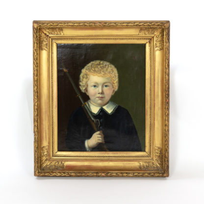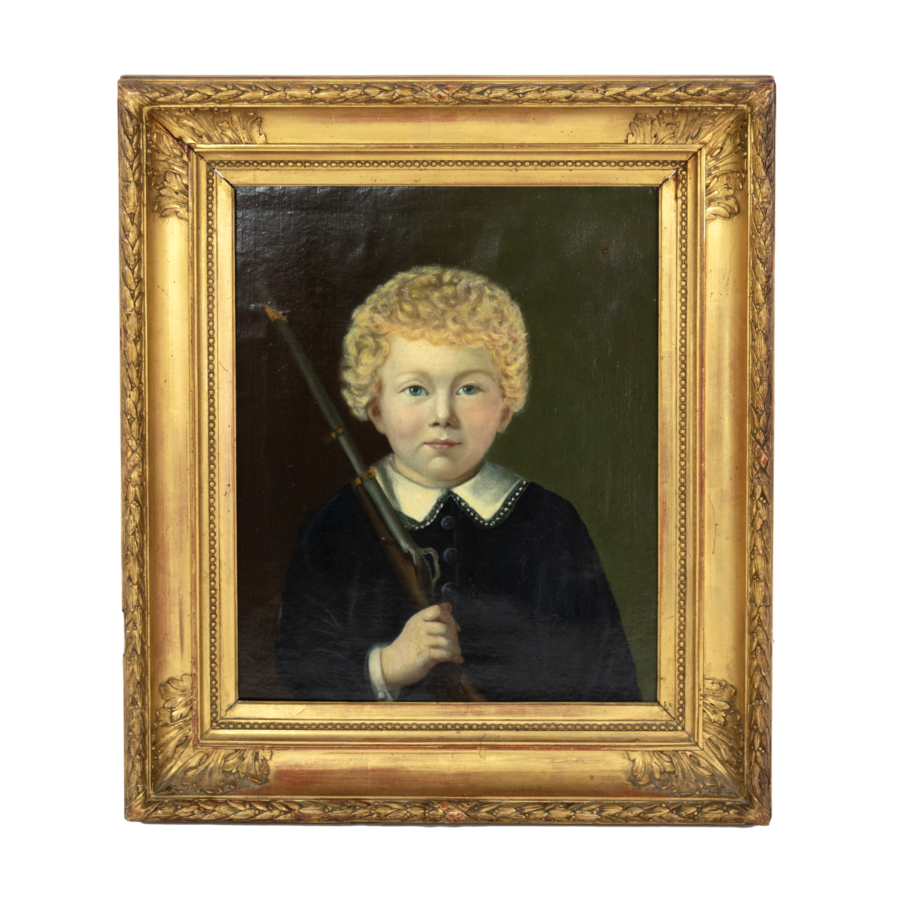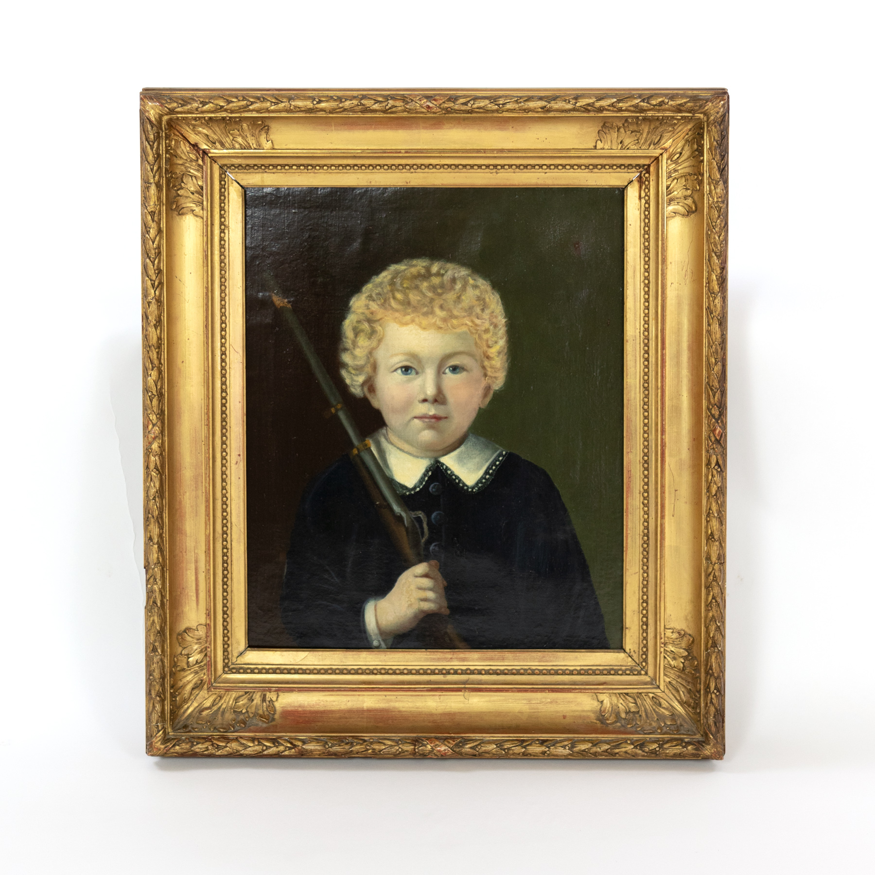 Portrait of a boy, Dutch, circa 1840, unsigned; A very serious looking boy with a pile of blond curls on his head holding a rifle. 1 2