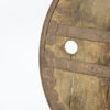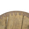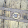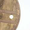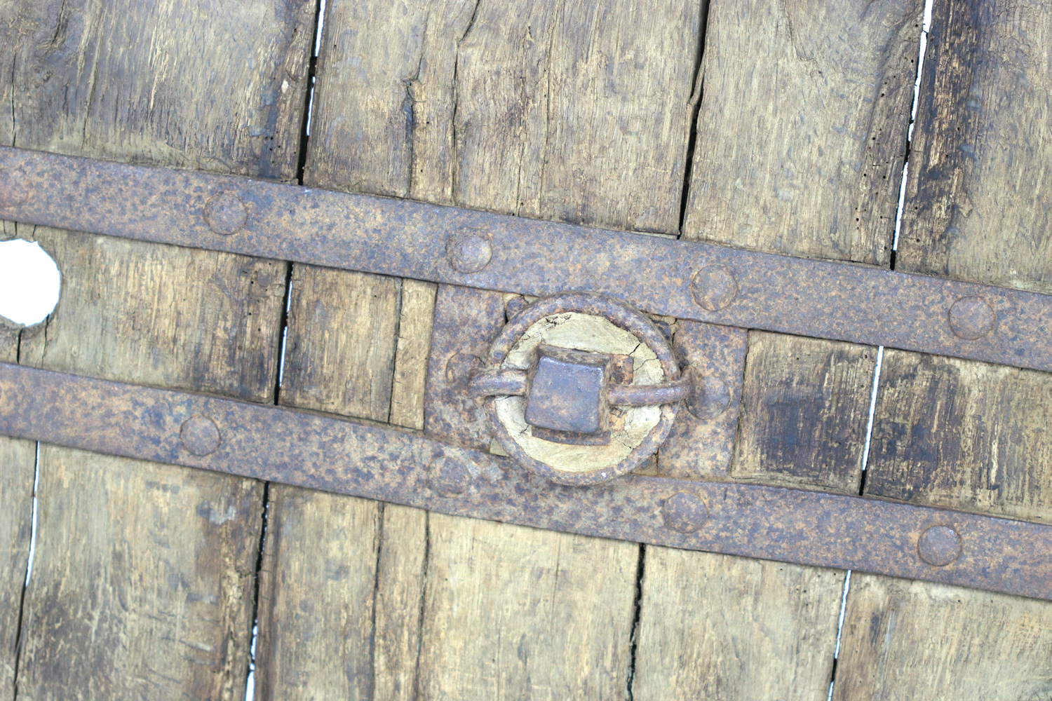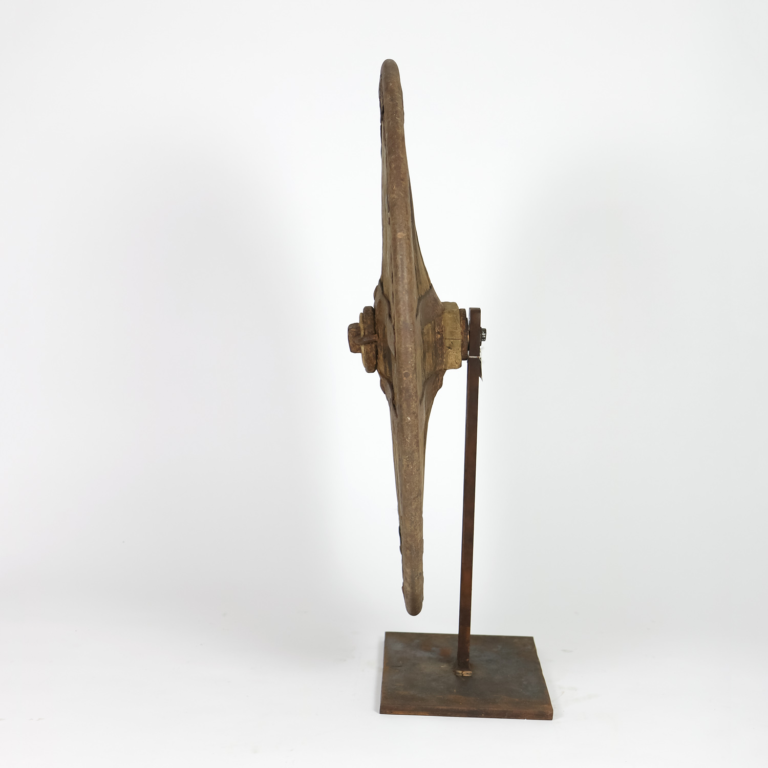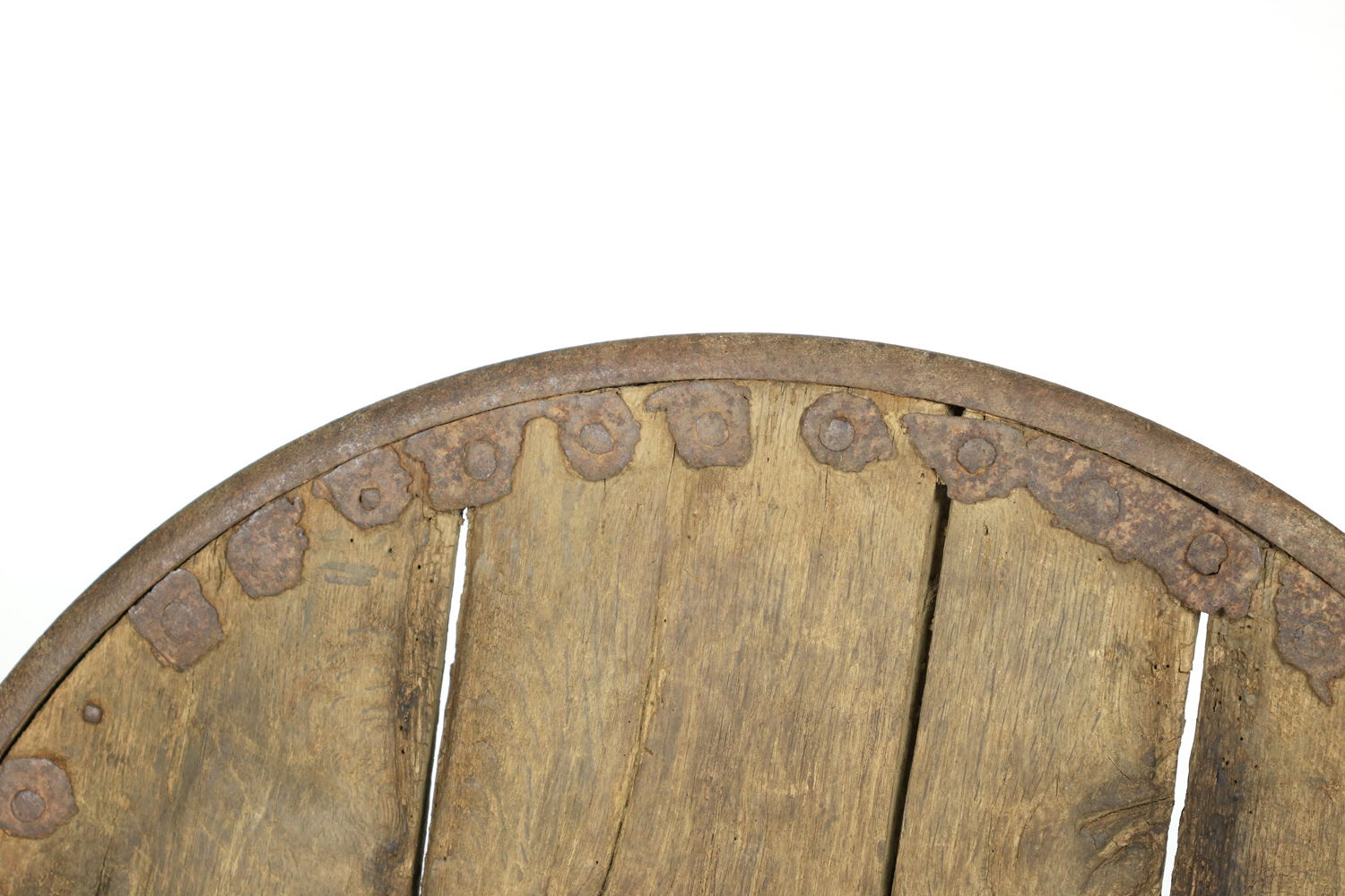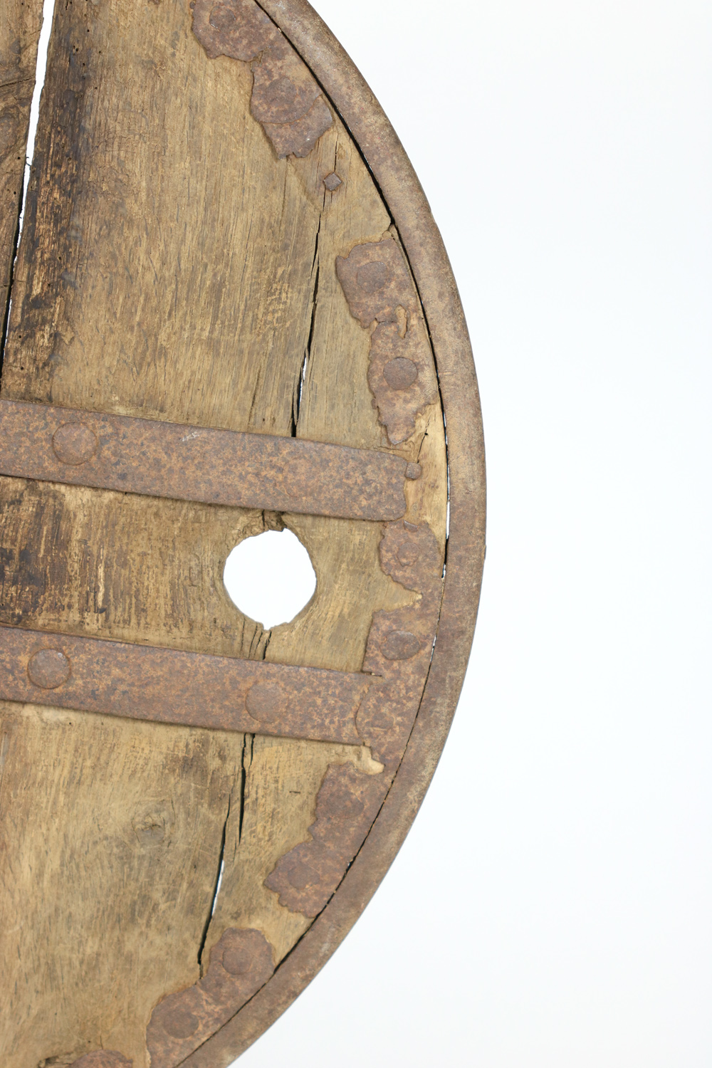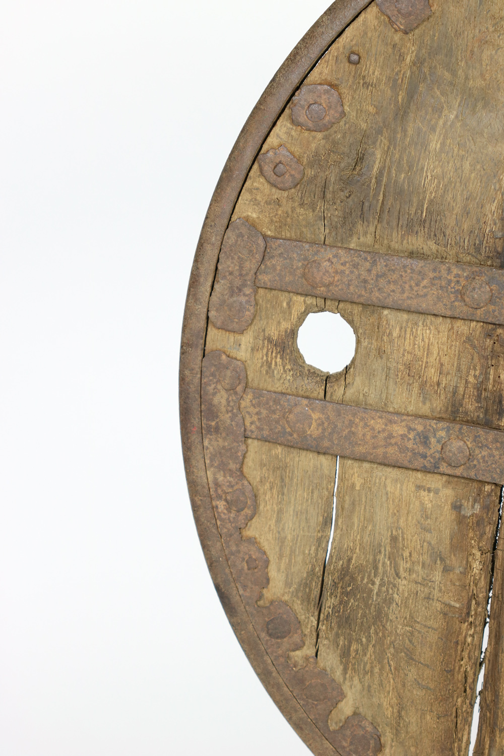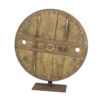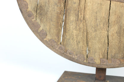 A primitive large oak and iron wheel, circa 1700 on later iron stand, Syrian – a substantial freestanding wheel that can rotate at its axle; weathered oak with parallel iron strapping and iron capped rim.