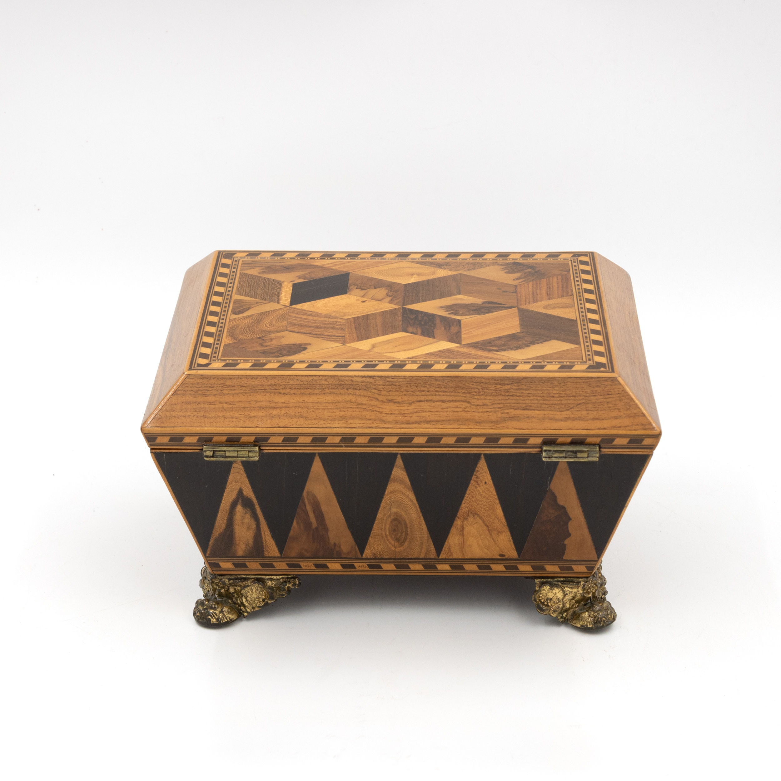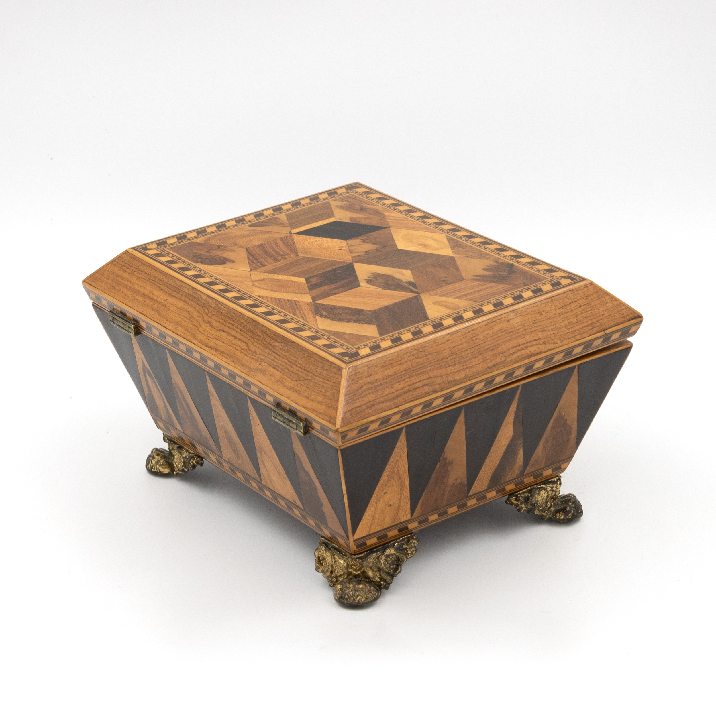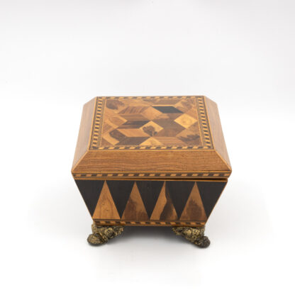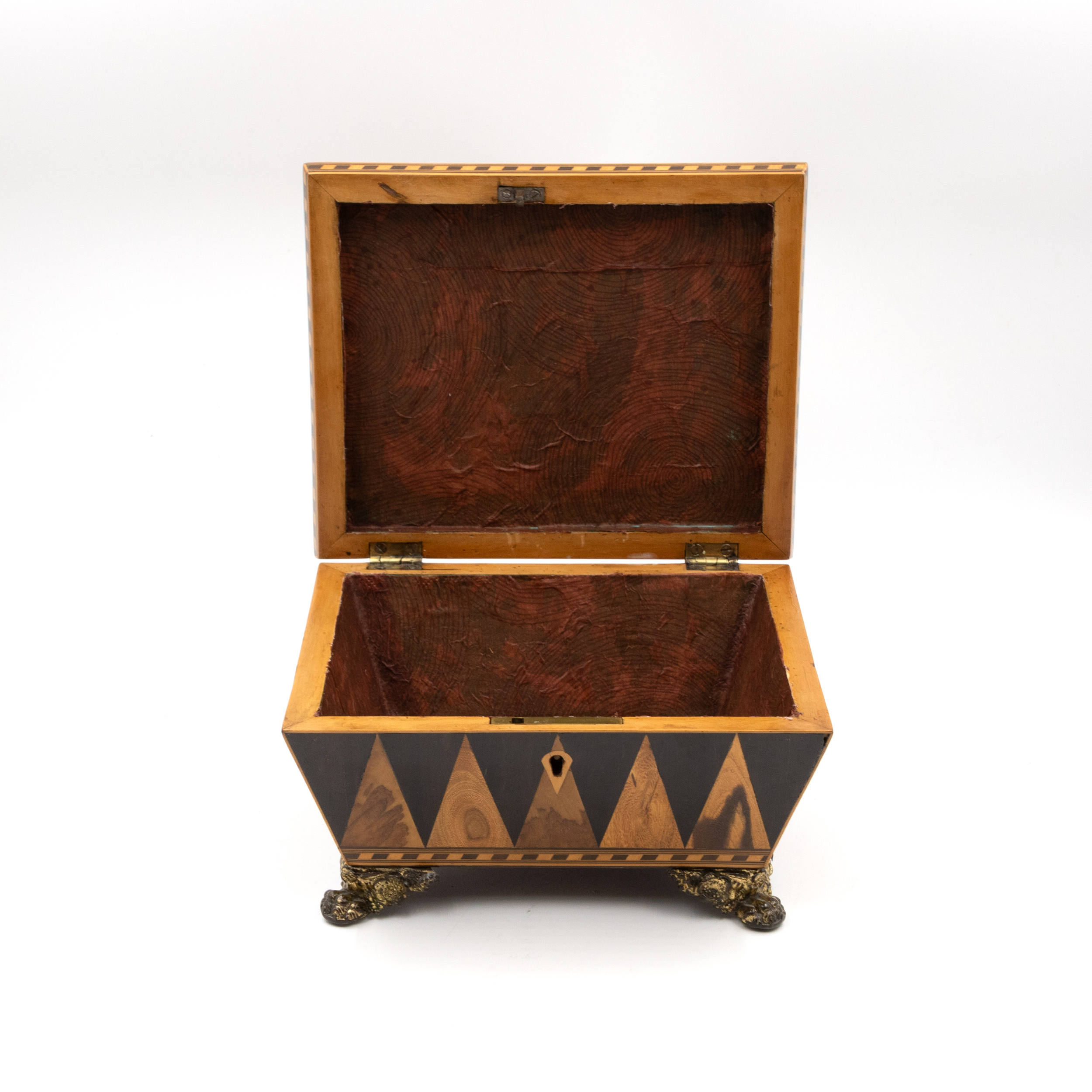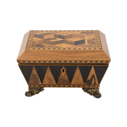 Trapezoid form with geometric marquetry throughout. The lid with tumbling block pattern bordered by alternating ebony and satinwood bands. Sides with Van Dyke pattern in ebony and walnut. Original bronze lion paw feet, red paper-lined interior, with working lock and key. English circa 1810.