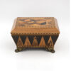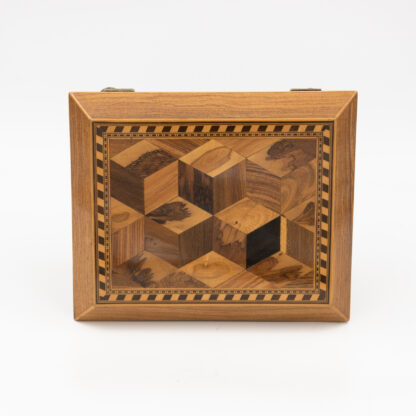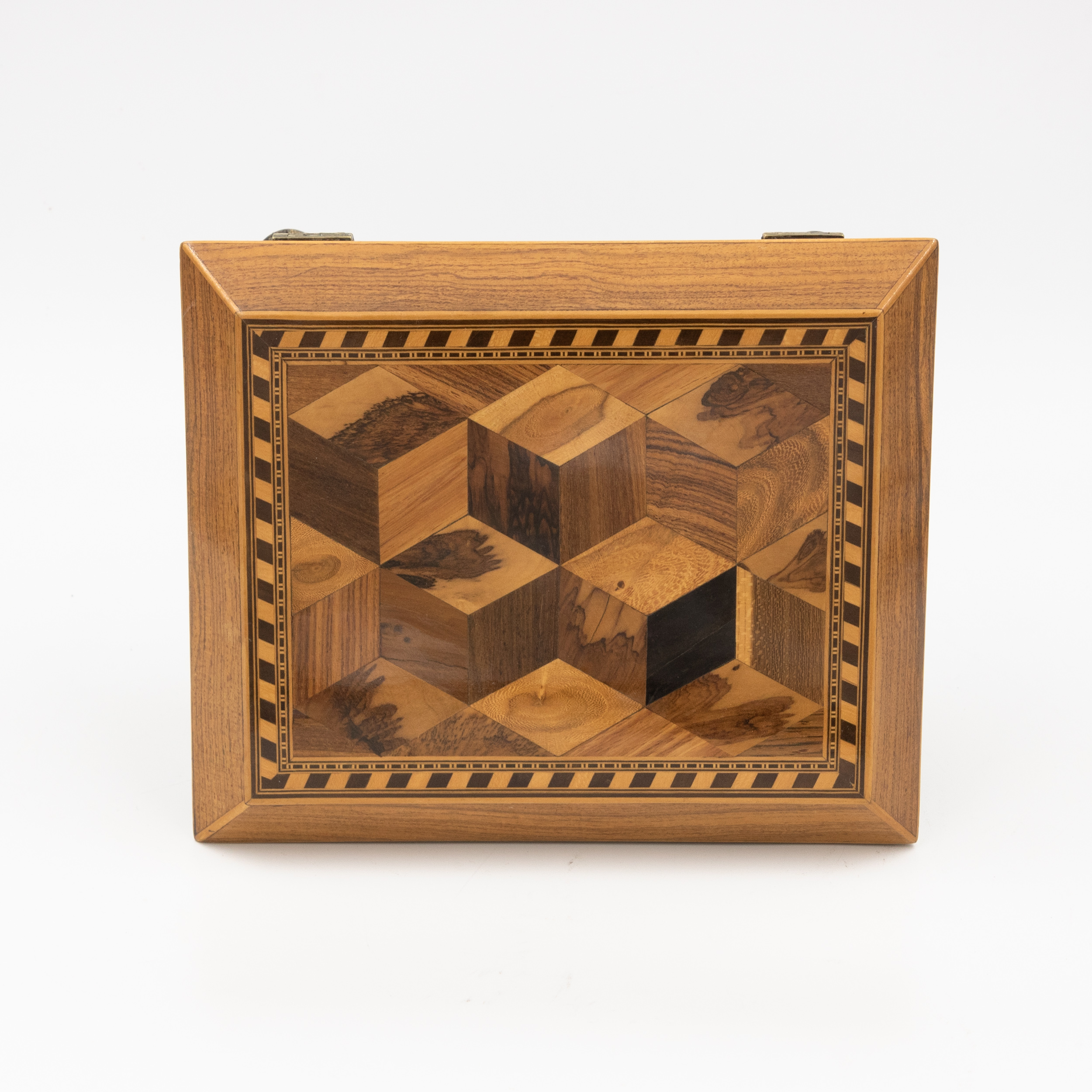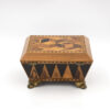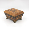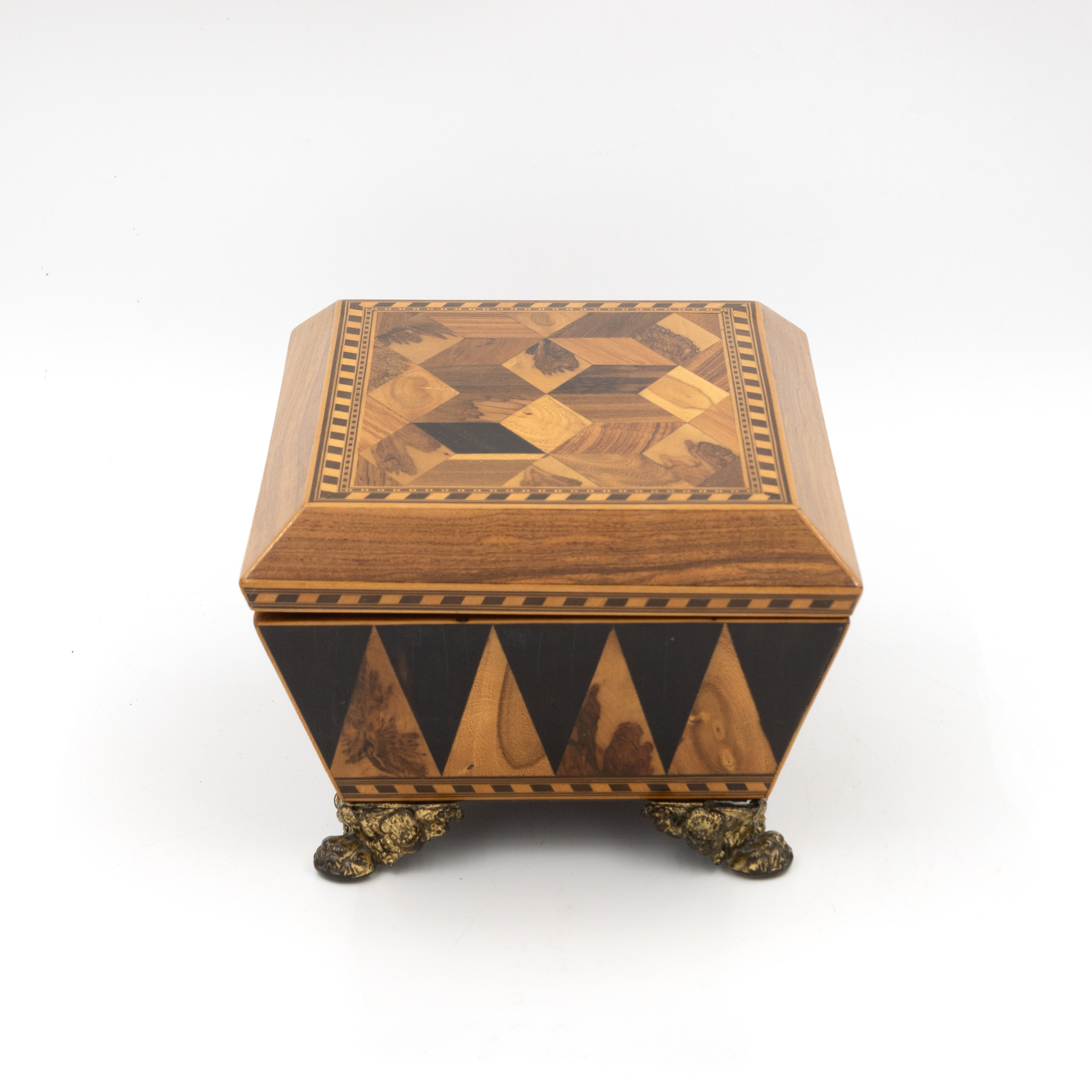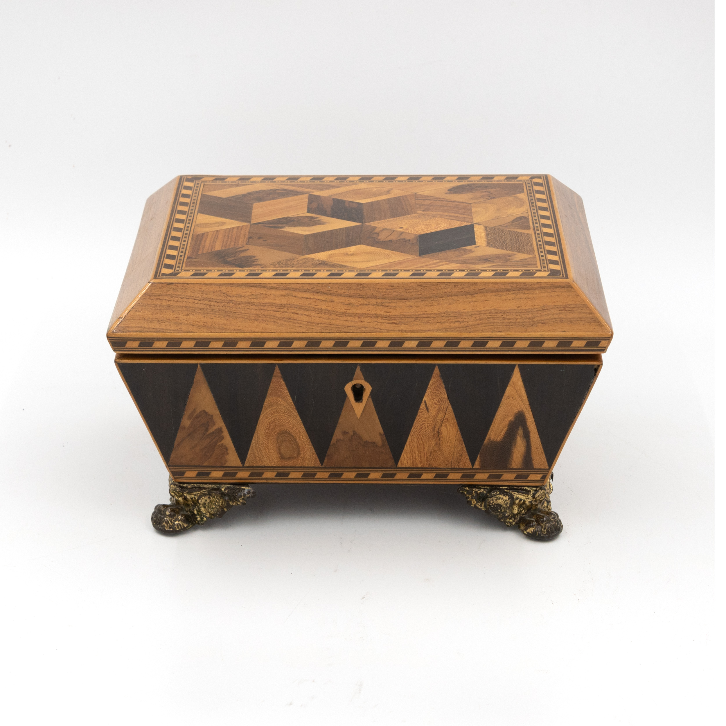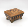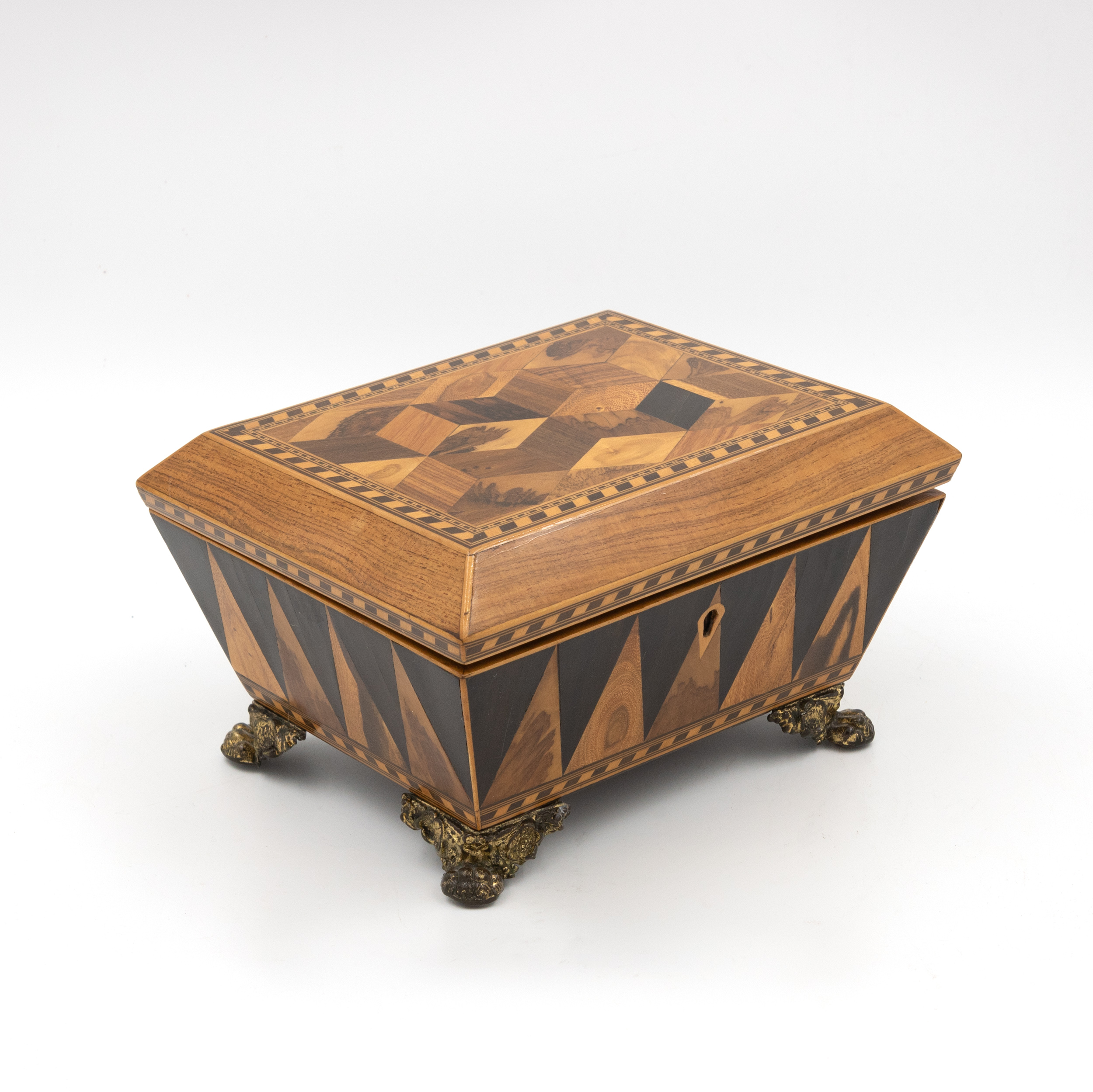 Trapezoid form with geometric marquetry throughout. The lid with tumbling block pattern bordered by alternating ebony and satinwood bands. Sides with Van Dyke pattern in ebony and walnut. Original bronze lion paw feet, red paper-lined interior, with working lock and key. English circa 1810.