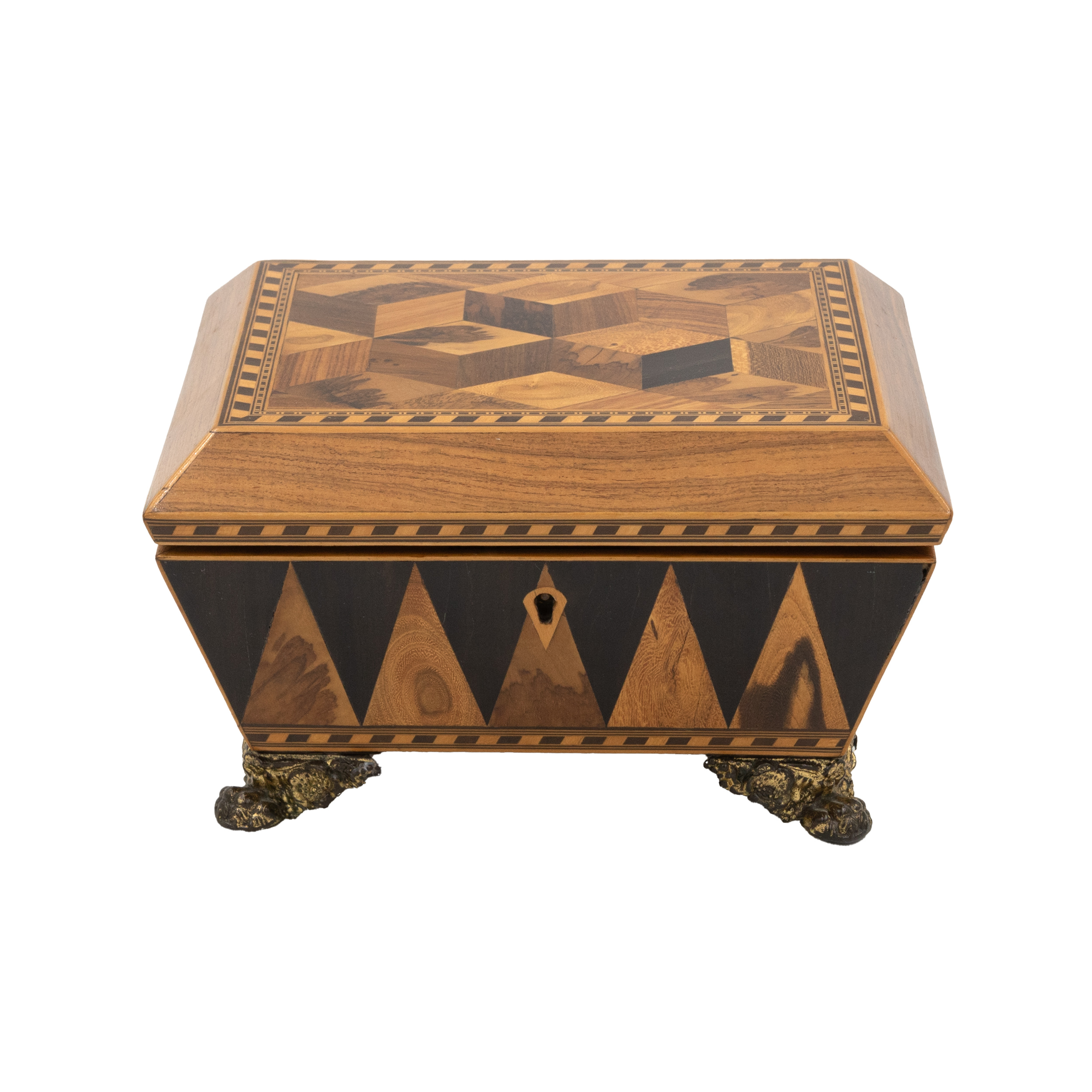 Trapezoid form with geometric marquetry throughout. The lid with tumbling block pattern bordered by alternating ebony and satinwood bands. Sides with Van Dyke pattern in ebony and walnut. Original bronze lion paw feet, red paper-lined interior, with working lock and key. English circa 1810. height: 4.5 in. (11.5 cm.)