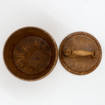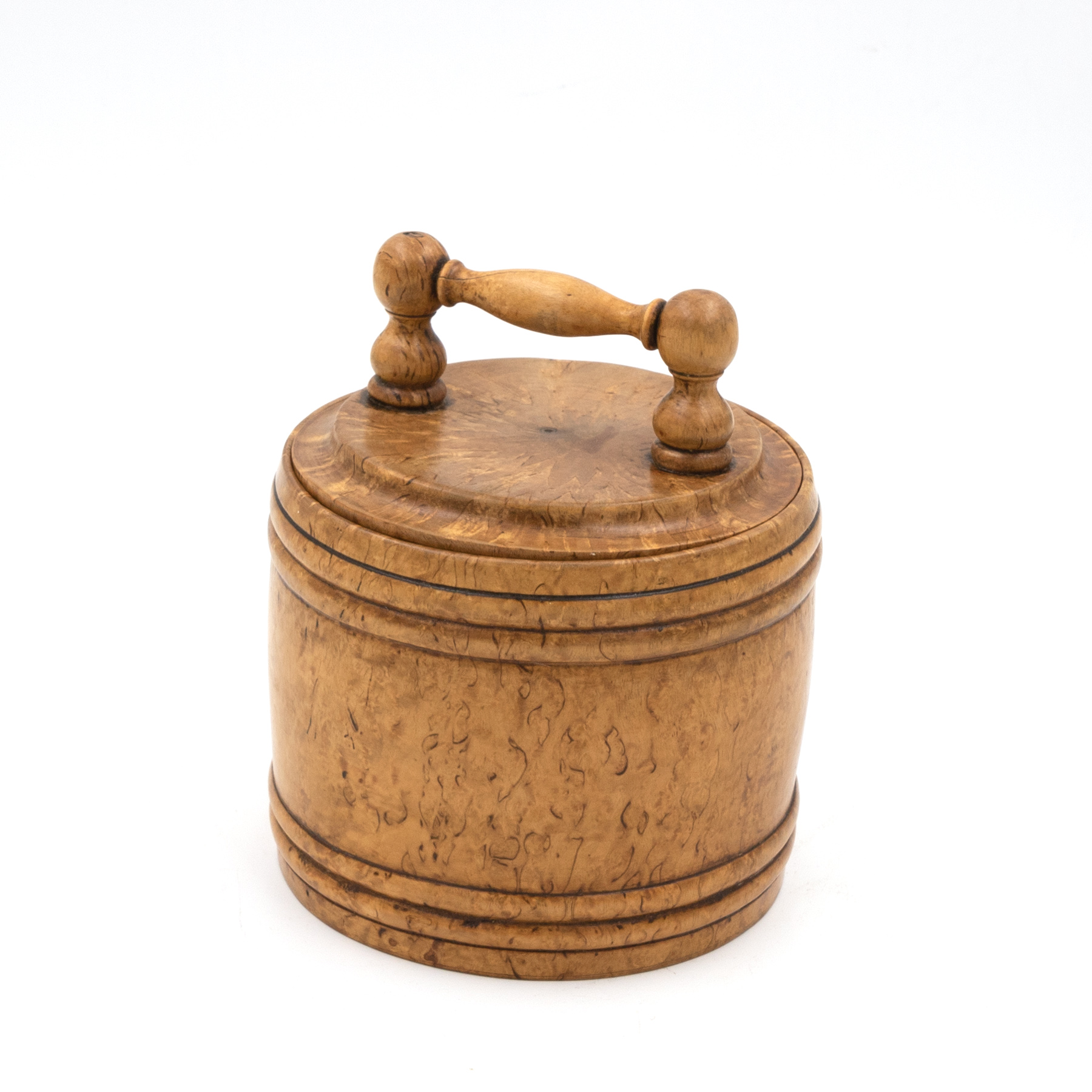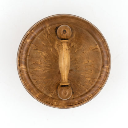 Round carved birch treenware tobacco jar, with handle top; English, circa 1820.