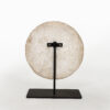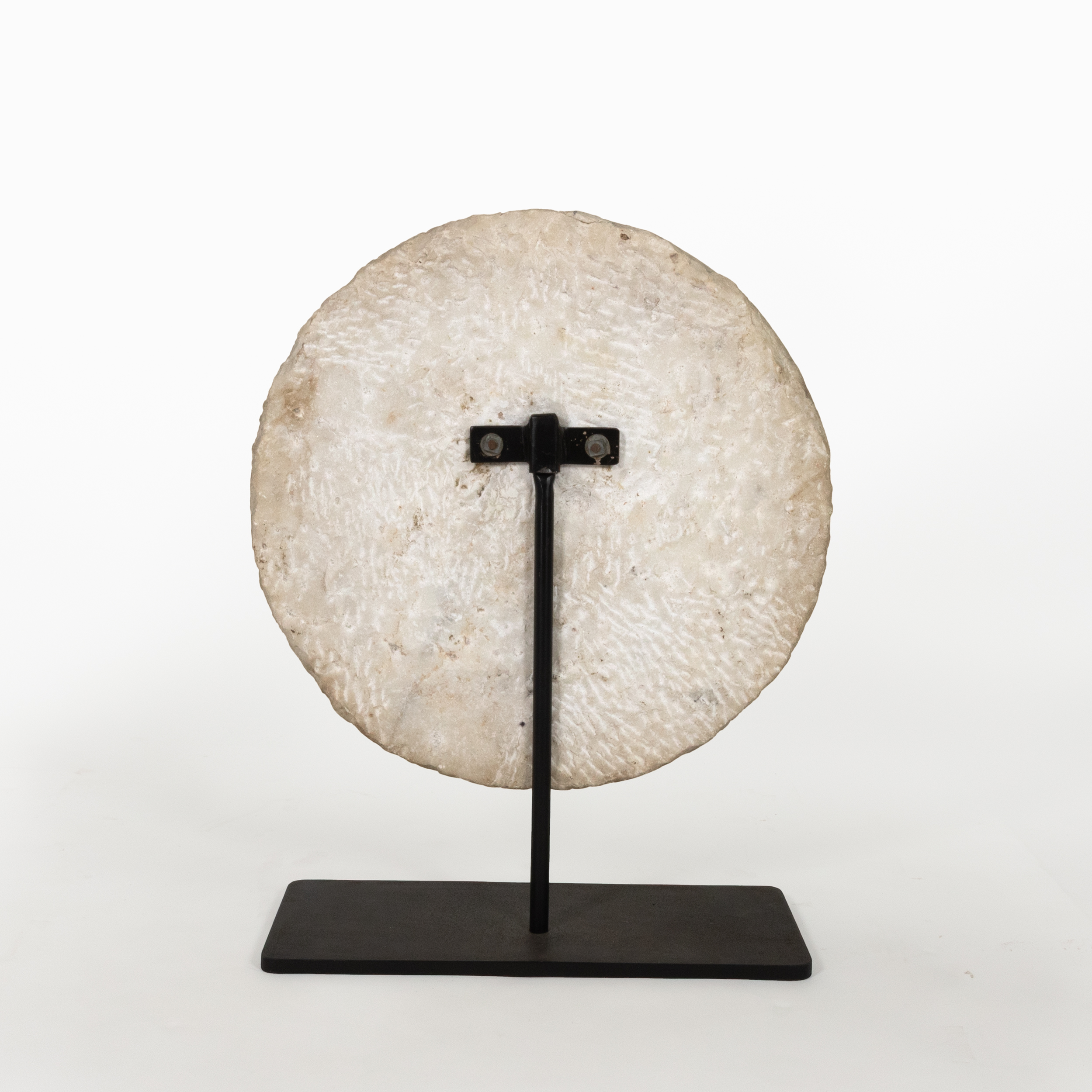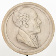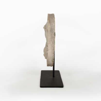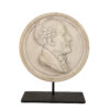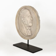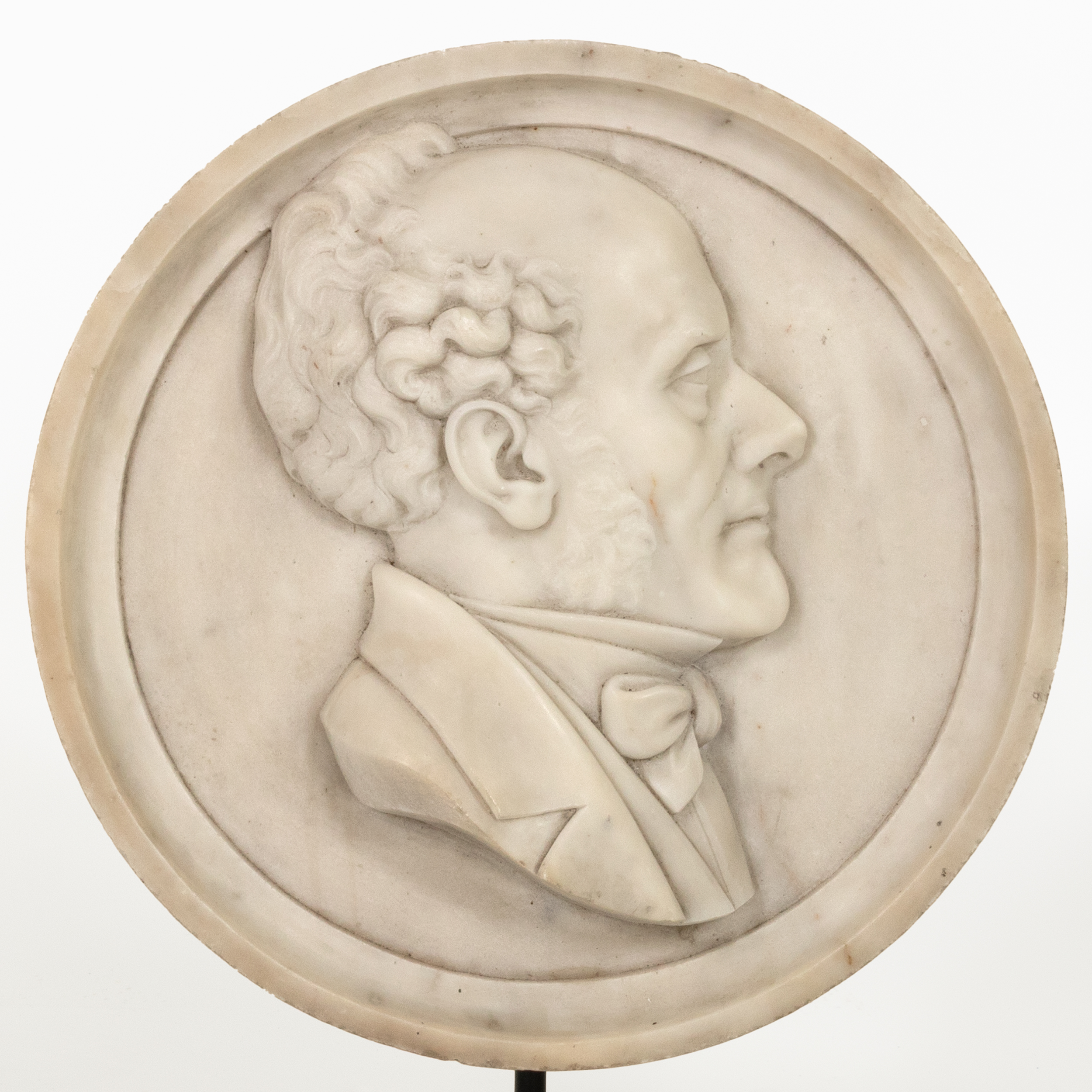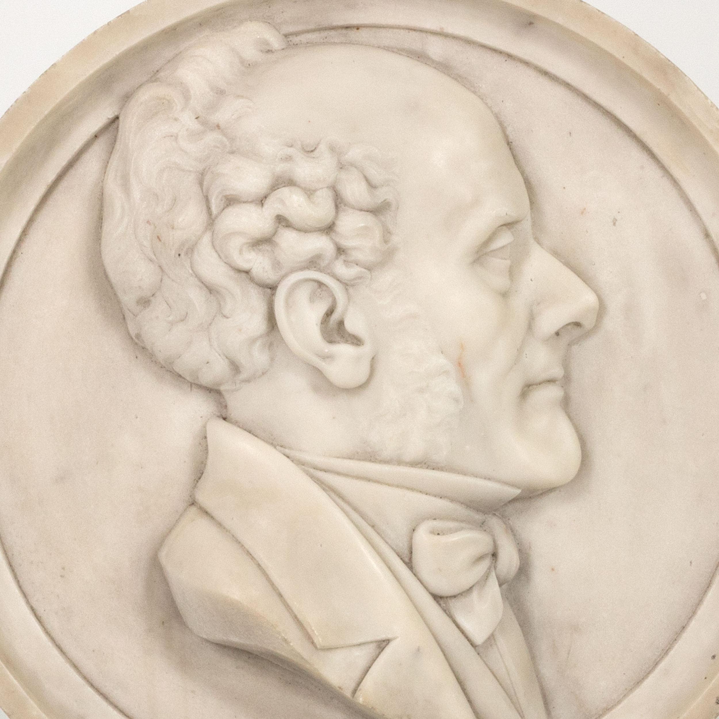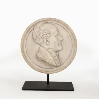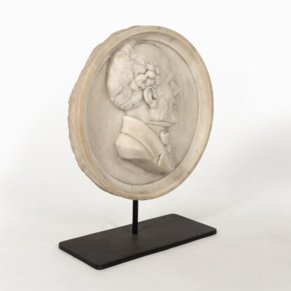 Round white marble bas-relief portrait medallion depicting the profile of a gentleman with wavy, curled hair and sideburns in the style of the mid-19th century. The subject in formal attire with a high collar and bow tie, characteristic of Second Empire fashion. The relief is surrounded by a simple raised border and mounted on a contemporary black iron stand. Unpolished and irregular to the reverse, showing signs of hand-finishing, with metal bracket for support. France, circa 1870.