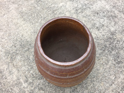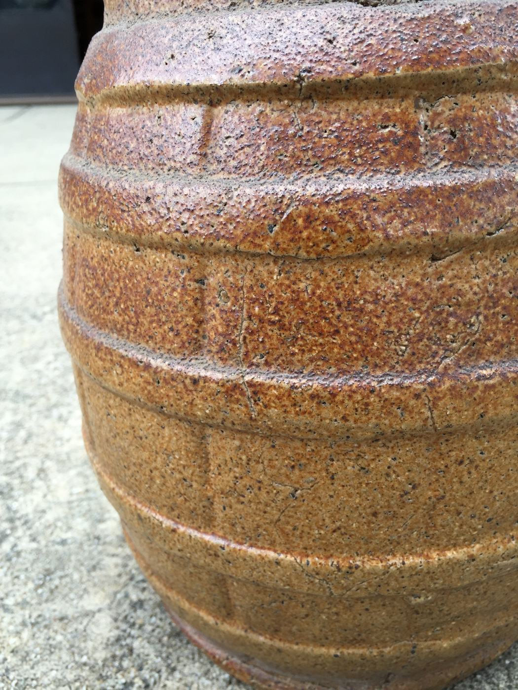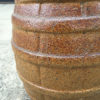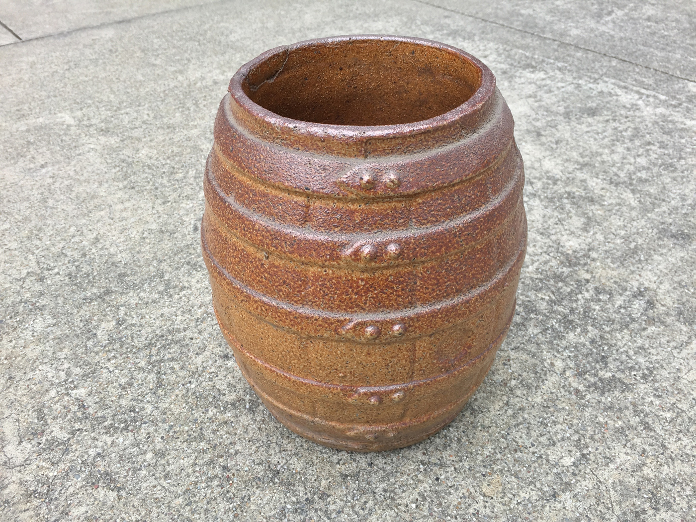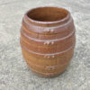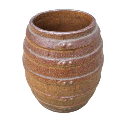 A wonderful English salt glazed pot in the shape of a barrel, circa 1880. Barrel form with suggesting concentric horizontal hoops, rivets and vertical staves; all in a rich, glazed rough surface of burnt orange & brown colors. 1
