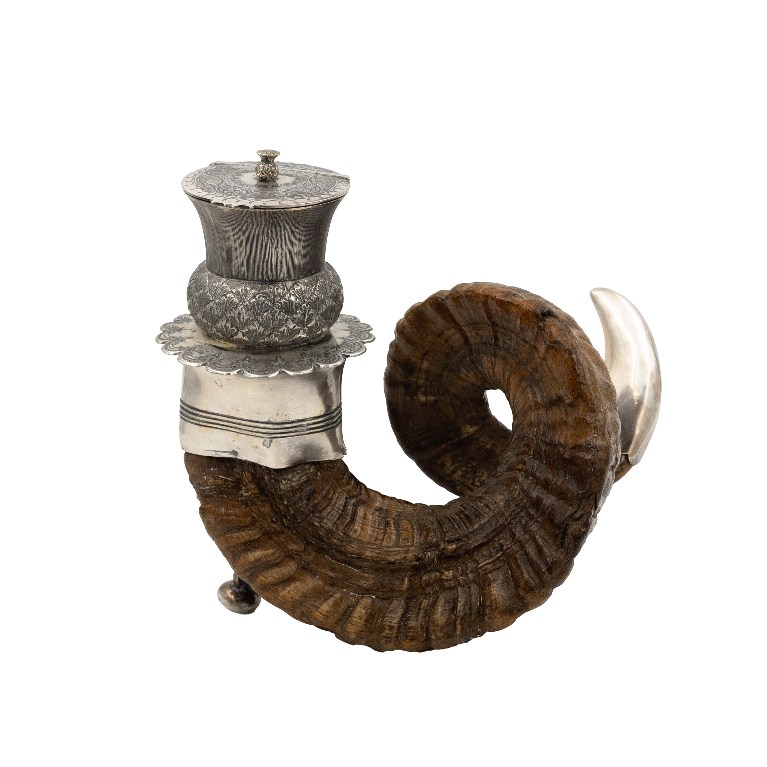 Natural ram's horn with silver-plated acorn form mount. Foliate engraved decoration, scalloped collar, and acorn finial. Interior gilt. On silver ball feet. Scotland, circa 1880 height: 9 in. (23 cm.)