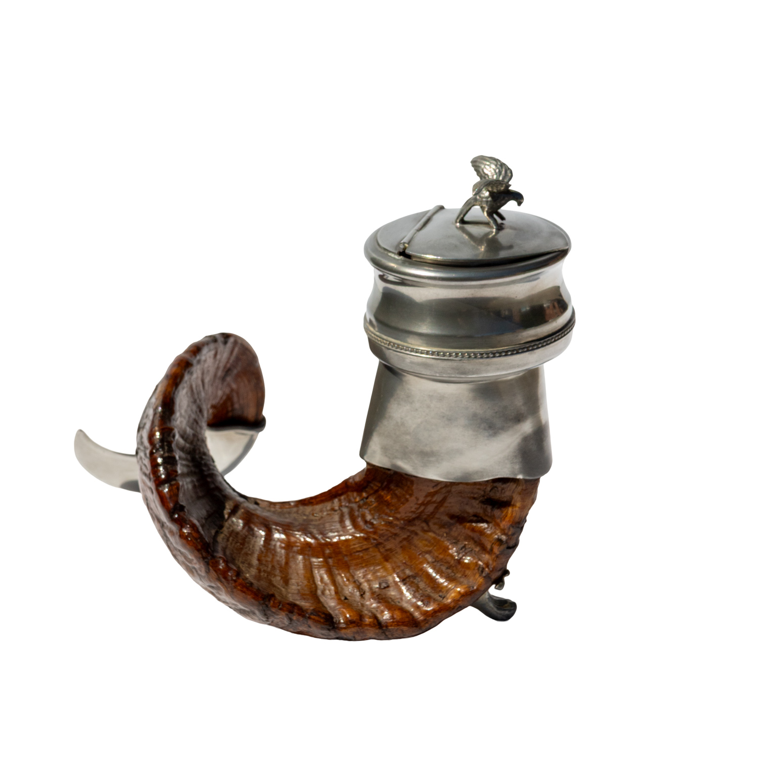 Scottish Rams Horn Snuff Mull With Golden Eagle On The Lid, the national bird of Scotland. Stamped W + CO Sharrow underneath the lid for Sharrow Mills, makers of snuff tobacco and containers since 1737.