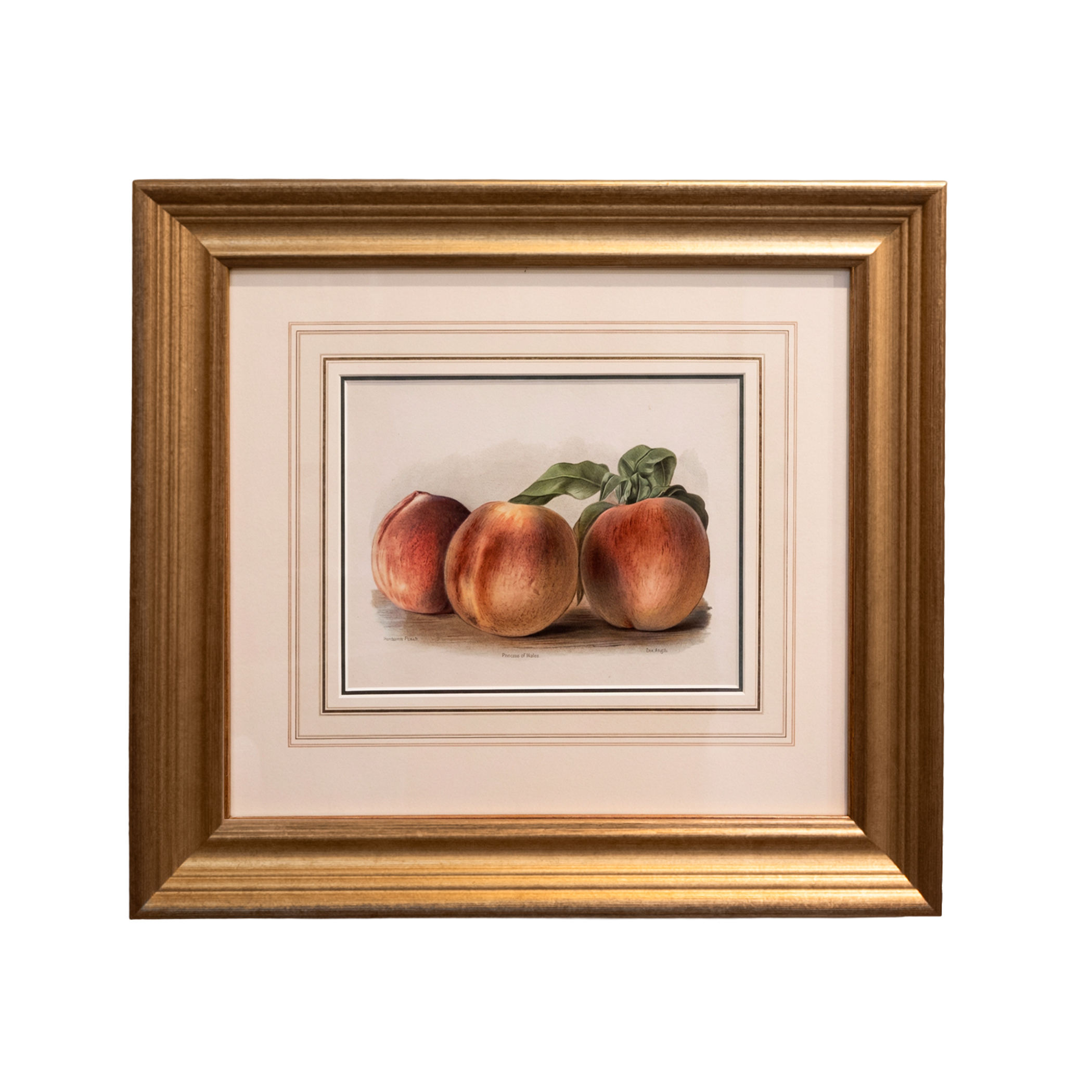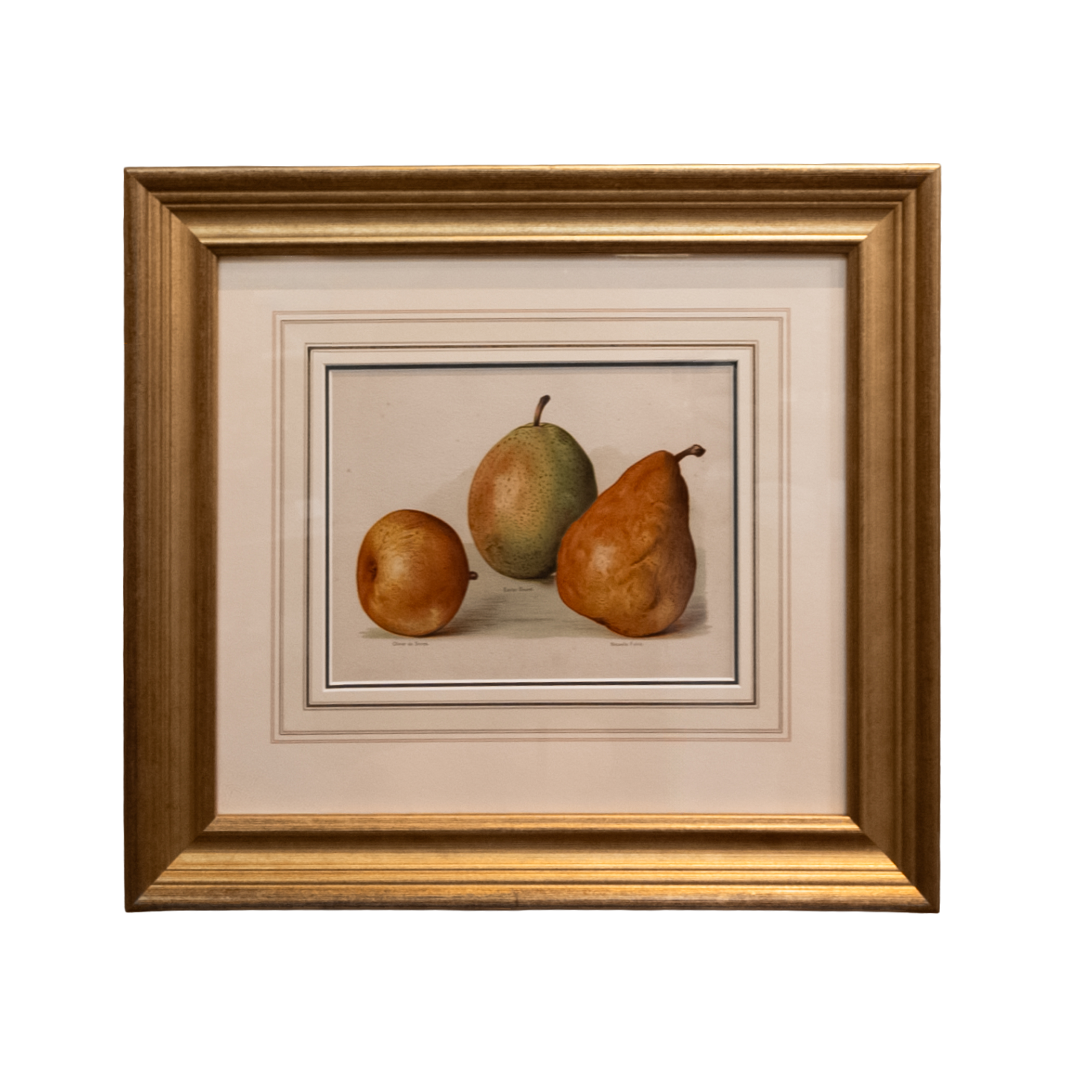 The plates show pears, apples, and peaches drawn from specimens at Rivers Nursery of Sawbridgeworth. May Rivers, a botanical artist and daughter of nurseryman Thomas Francis Rivers, illustrated the work with attention to botanical detail. Each chromolithograph is custom matted with multiple borders in cream and gold-ruled hand-lined mounts, housed in giltwood frames with stepped profiles. Late 19th Century, England. Sold as a complete set of six. 1