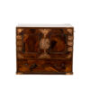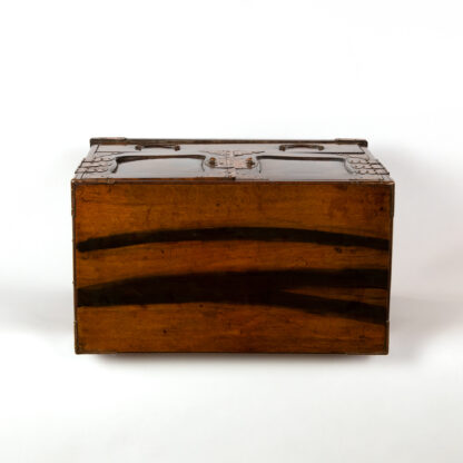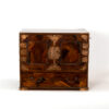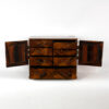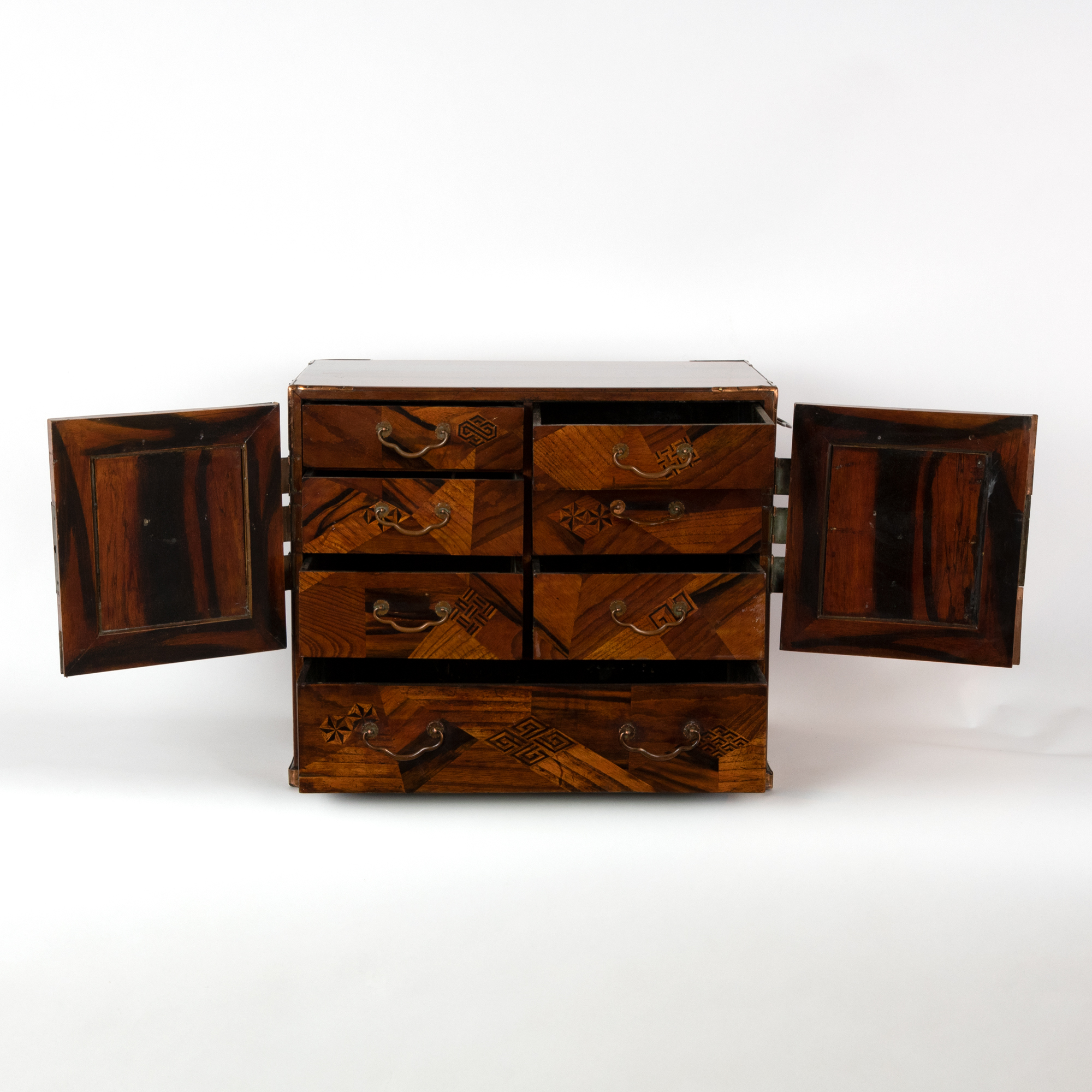 Small Japanese tansu table cabinet, circa 1900. With outstanding hardwood exterior; each door inlaid with various woods of different geometric patterns. Seven drawer interior with similar intricate inlay. Wonderful patina and color. An impressive vintage Japanese tansu chest / table top wooden chest decorated with inlay and marquetry, with fittings, strap hinges and corner supports. Two doors open to six fitted drawers, and one drawer below