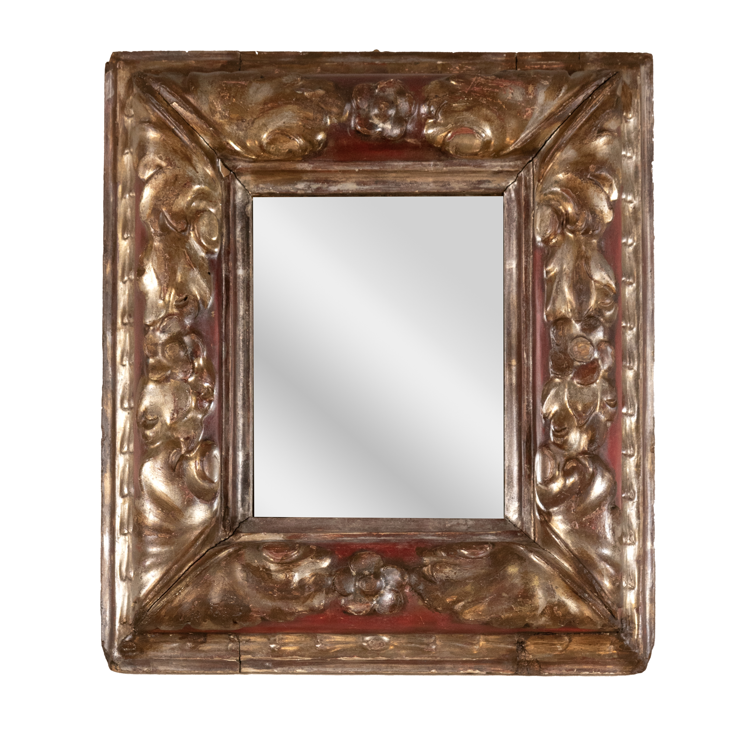A small-scale Spanish giltwood mirror frame from the mid-18th century, featuring robustly carved foliate and floral motifs with burnished silver gilt elements set against a subtly contrasting red painted background. The frame's size and ornate design suggests it was intended for a refined setting, being both practical and decorative; Circa 1750. height: 14.5 in. (37 cm),