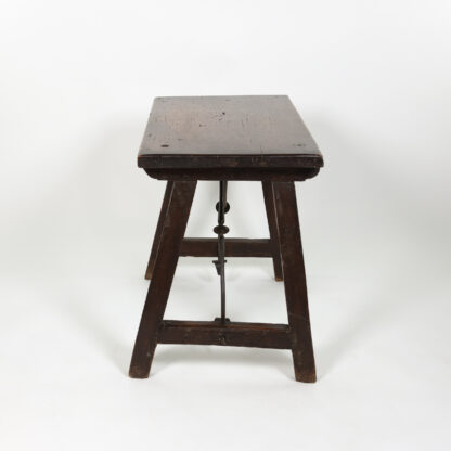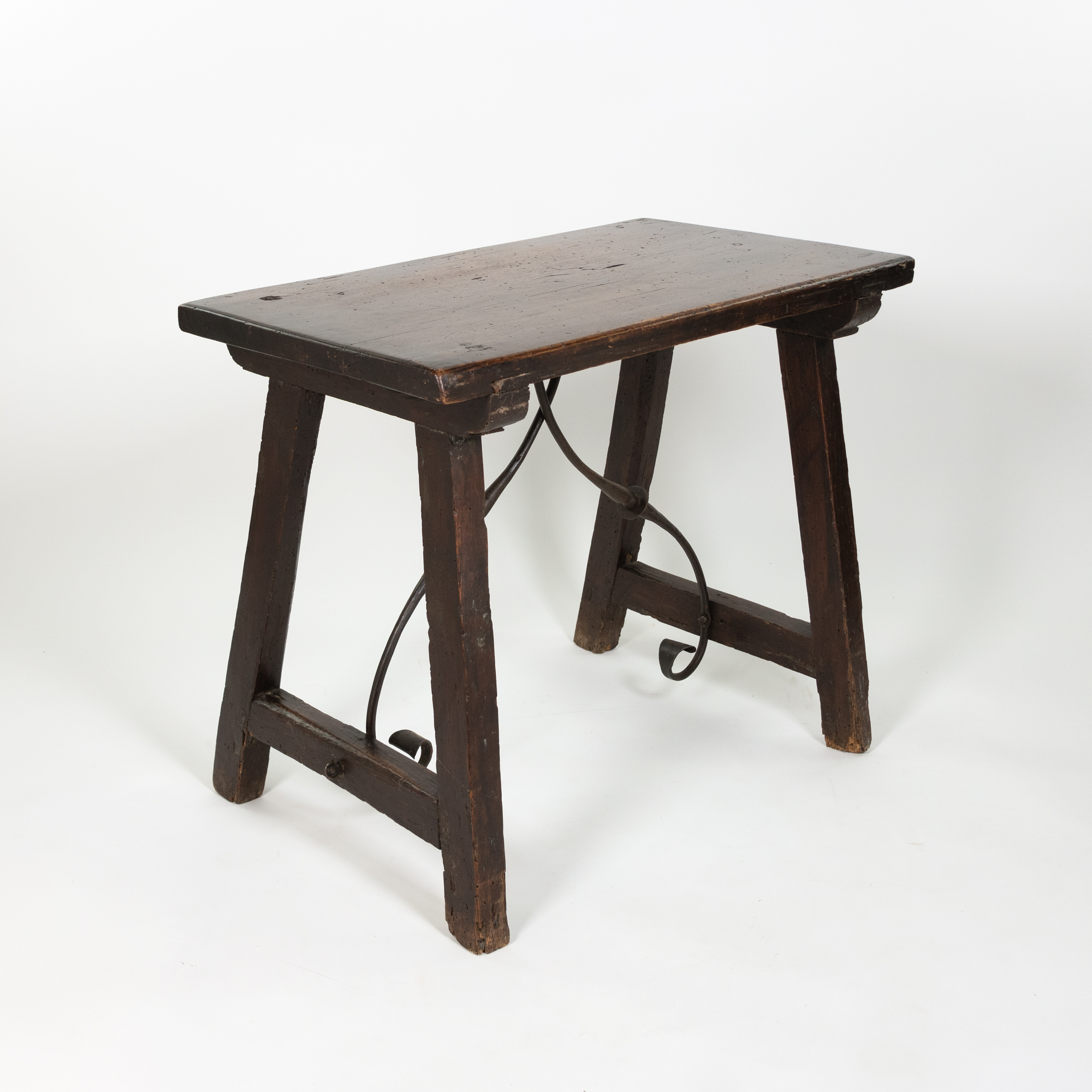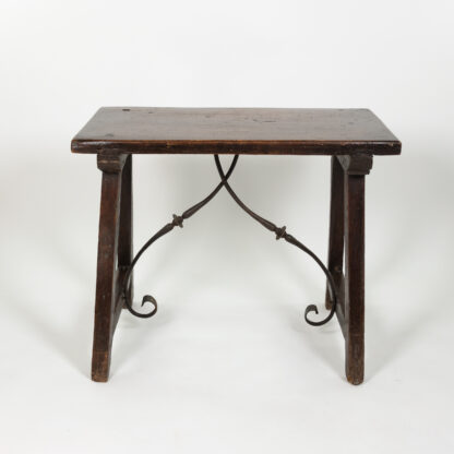 Small-scale Spanish walnut trestle table with iron stretcher circa 1850