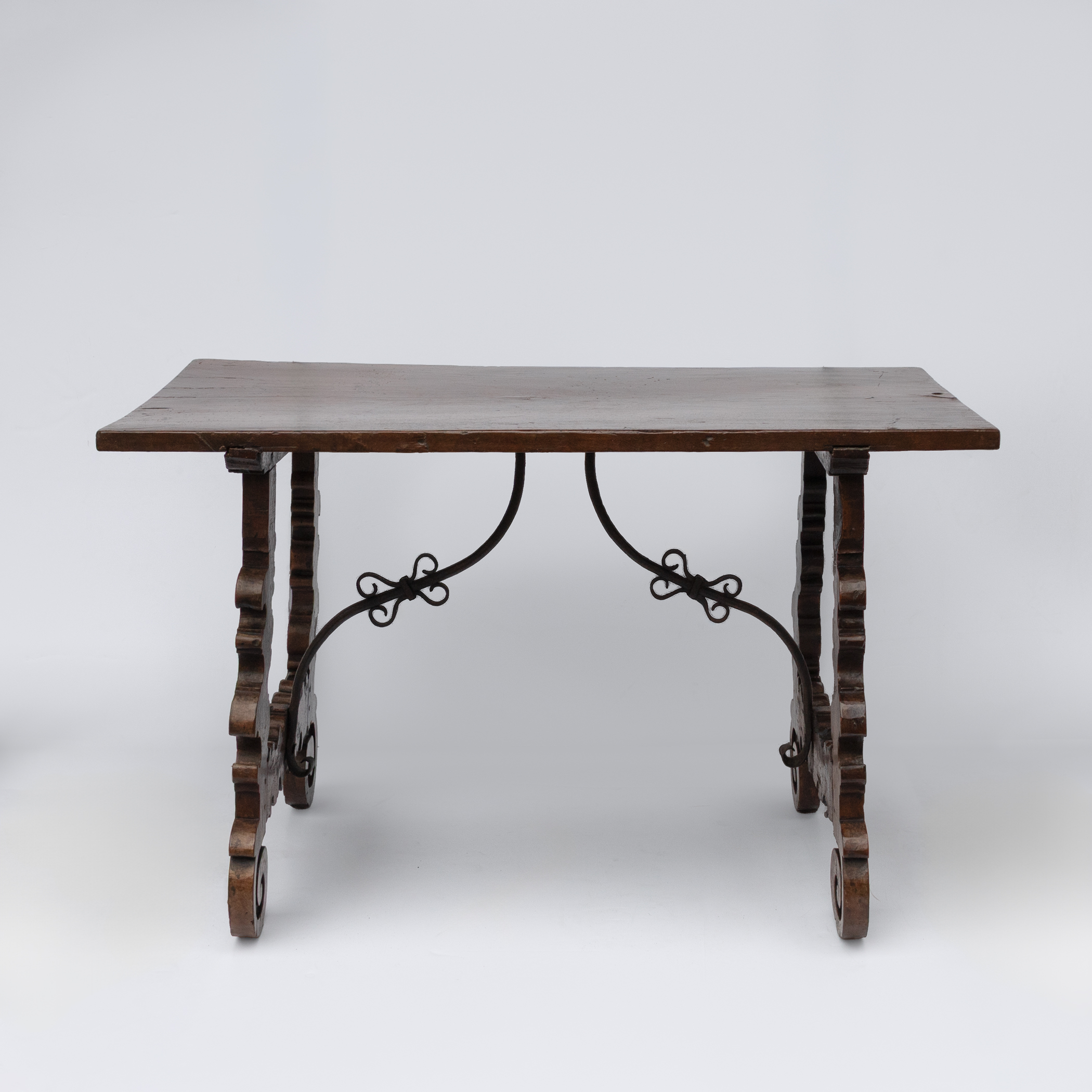 Single plank walnut top of on lyrate trestle supports with scrolled volutes. The supports are connected by a shaped wrought-iron stretcher with scrolled terminals resembling butterfly wings. The lyre-form trestles with scroll feet; wear consistent with age and use. The iron stretcher retains its original dark patina. 17th/18th Century
