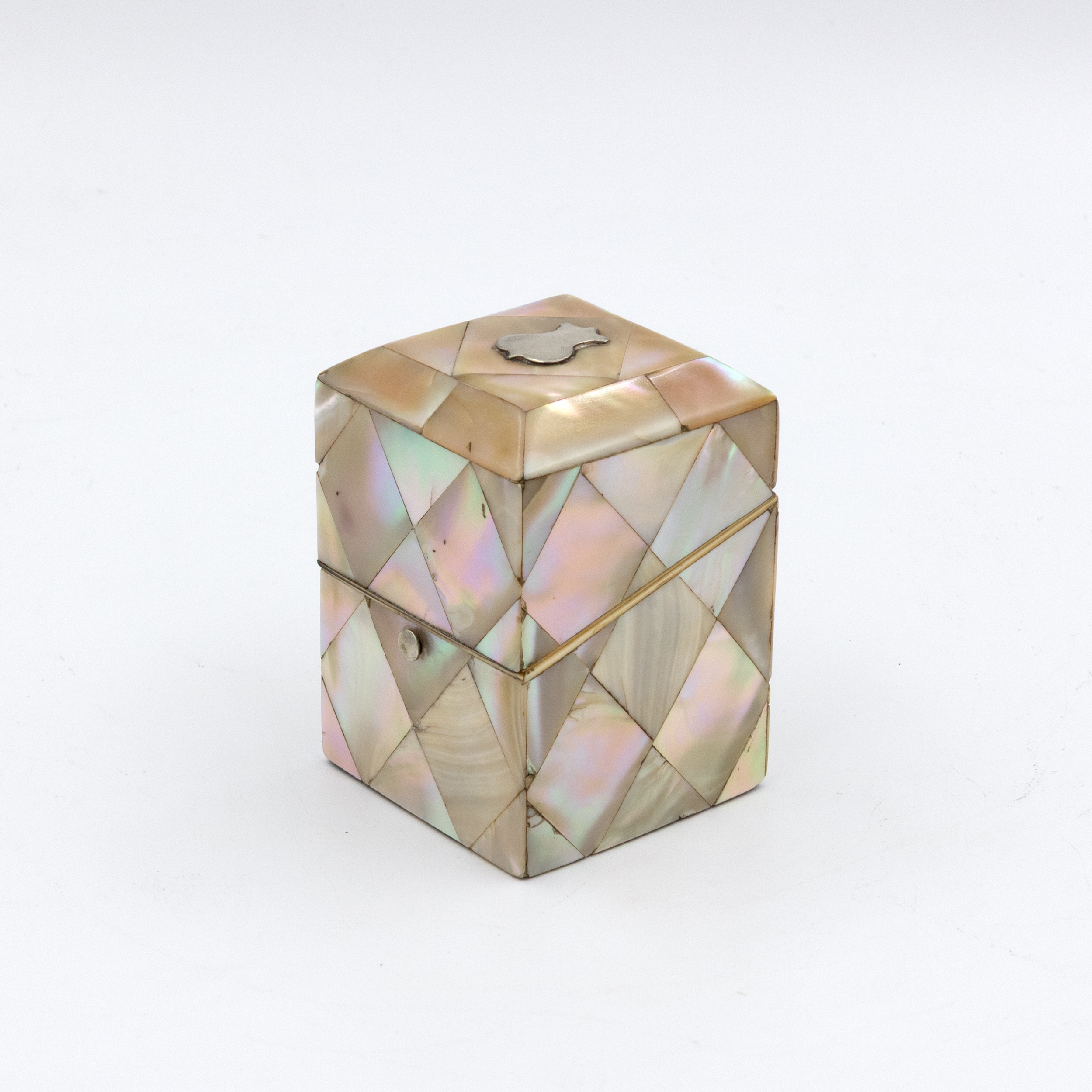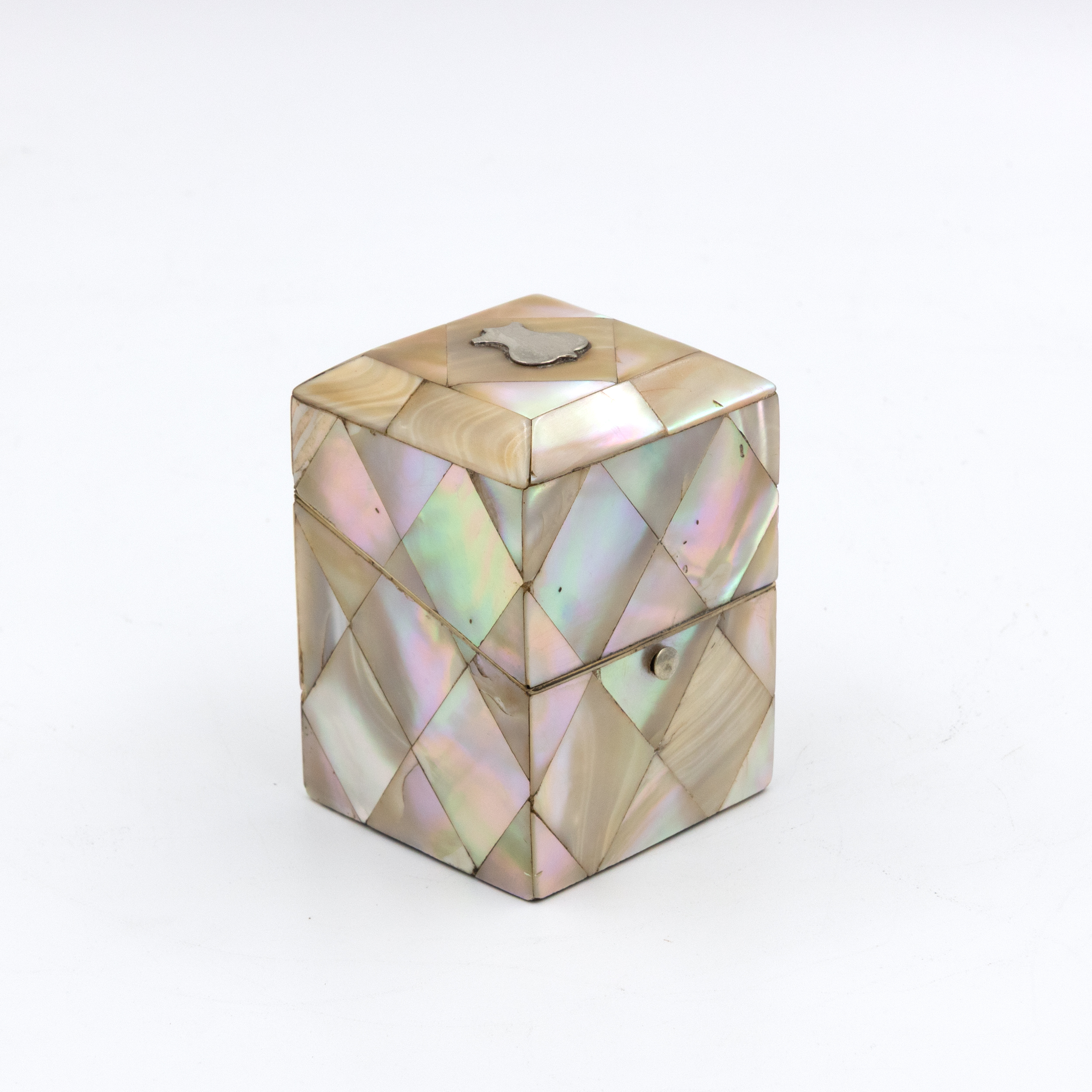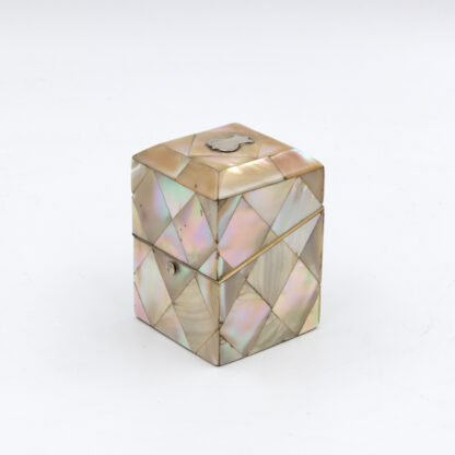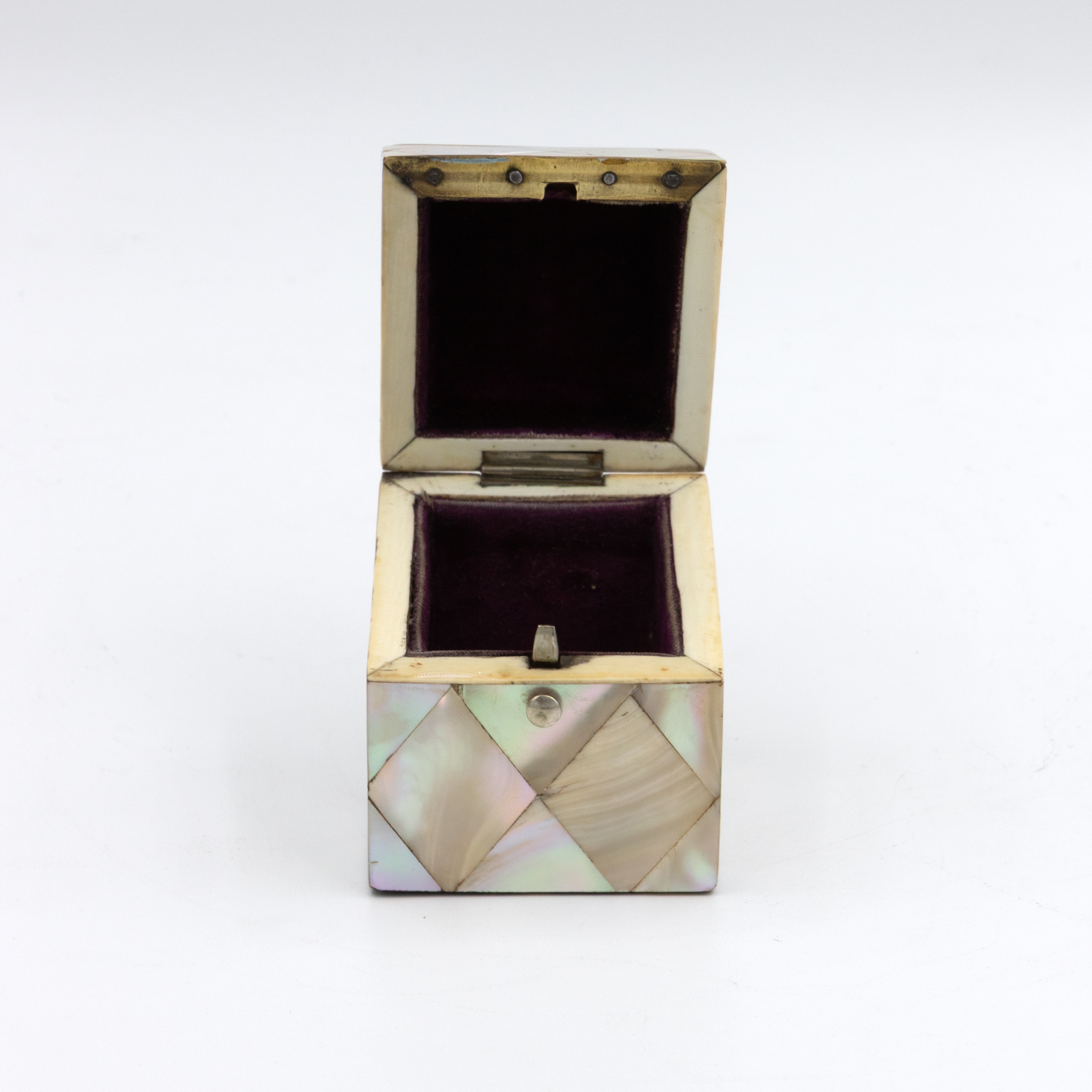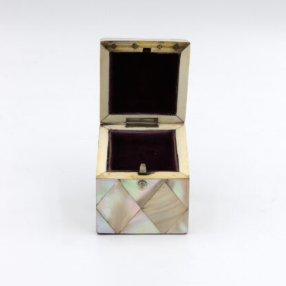 A small English square-form box with mother-of-pearl veneer arranged in a diamond parquetry pattern. The gently chamfered lid is mounted with a small silver escutcheon, typically reserved for personalization, though never engraved. The box opens with a push-button mechanism to reveal a deep amethyst-colored velvet-lined interior. Hinges and fittings are brass, and the lid closes cleanly. Likely intended as a pin or ring box during the Victorian period. The geometric inlay, combined with the iridescent nacre, reflects the era’s interest in surface ornament and personal luxury objects. English, circa 1880.