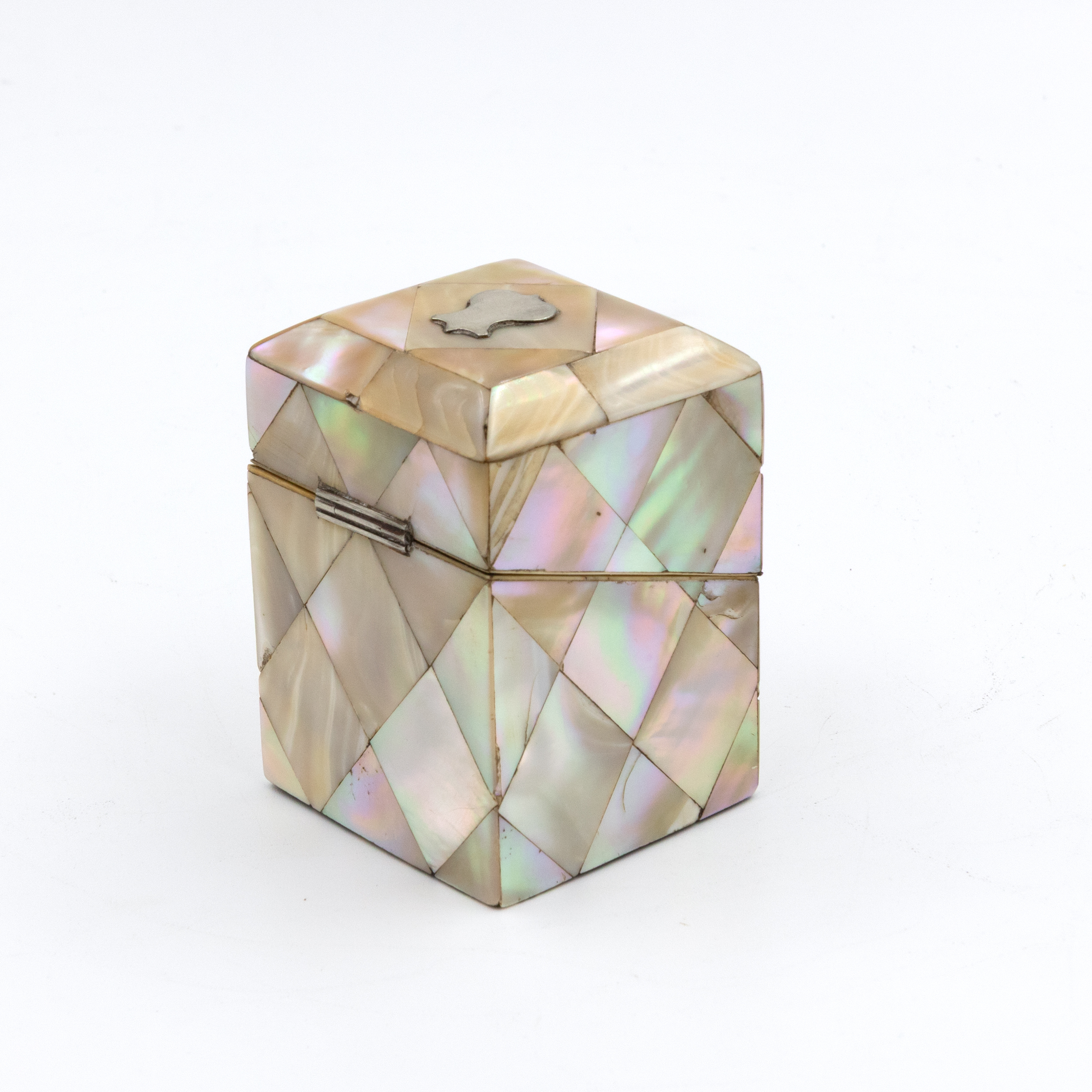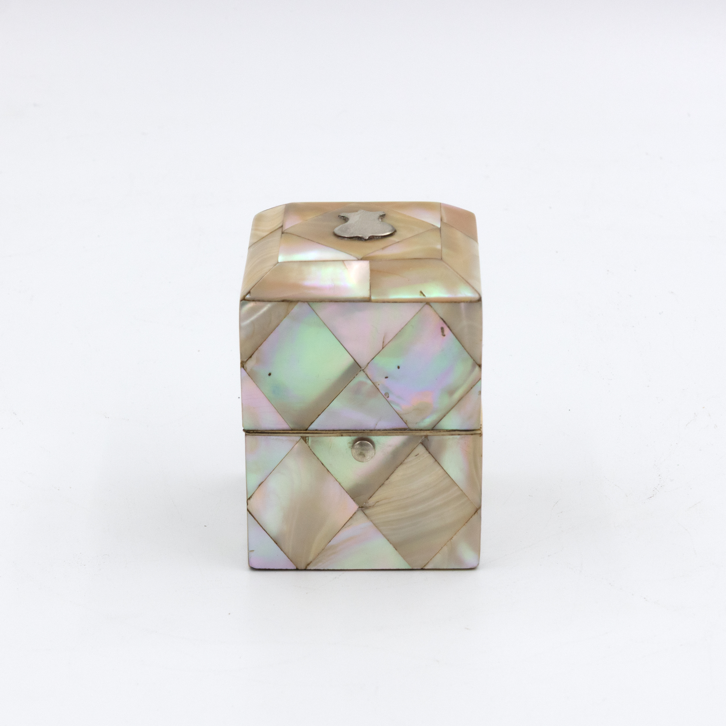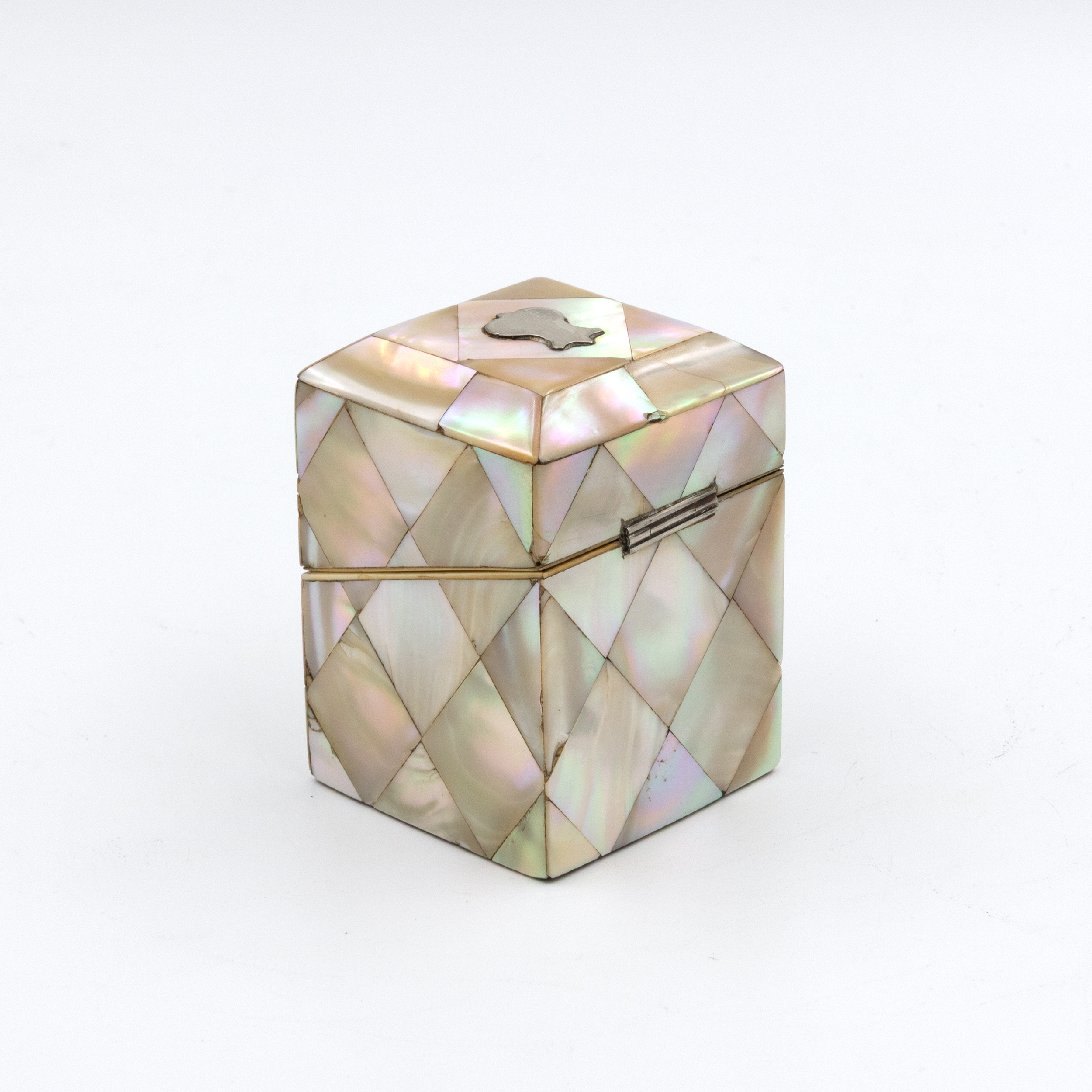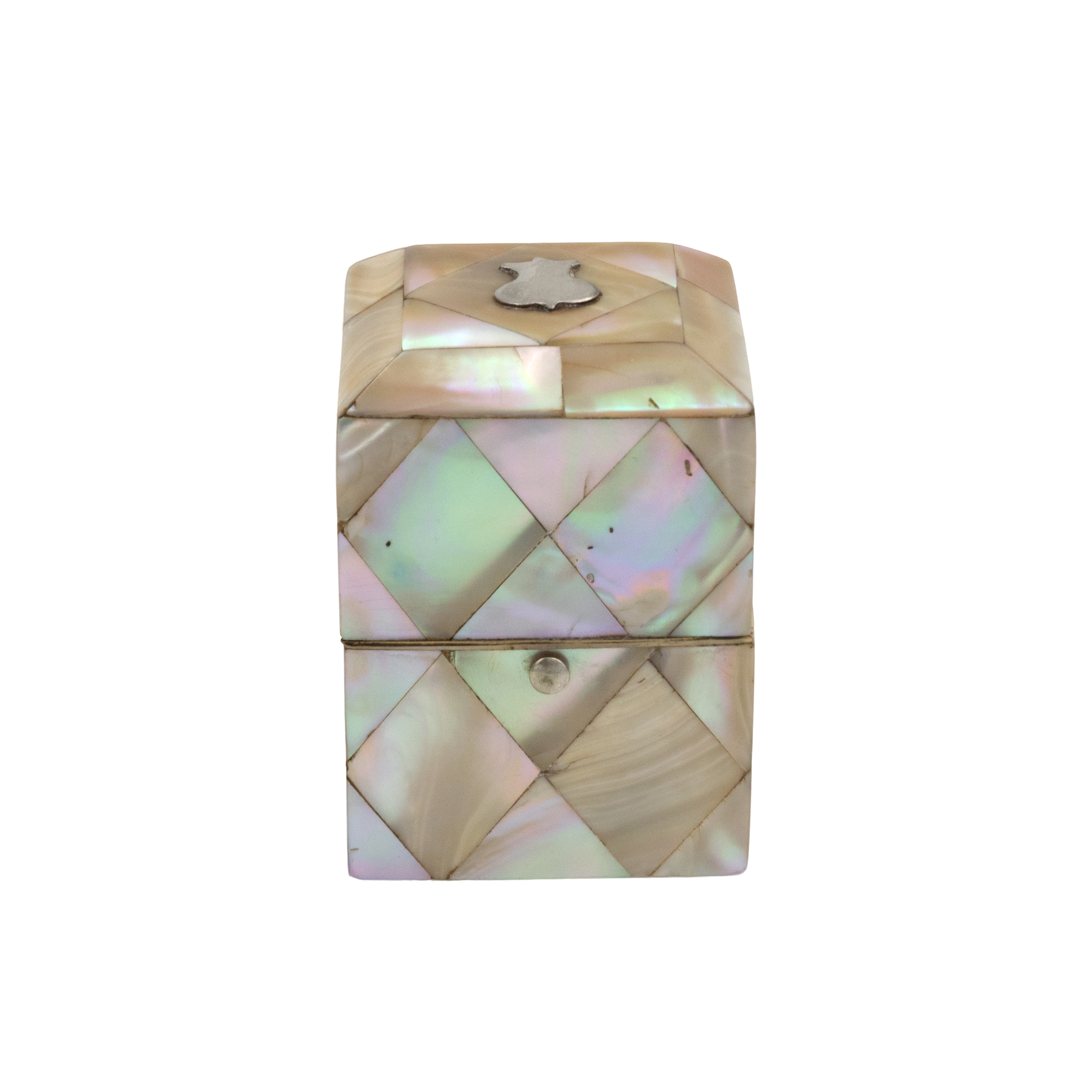 A small English square-form box with mother-of-pearl veneer arranged in a diamond parquetry pattern. The gently chamfered lid is mounted with a small silver escutcheon, typically reserved for personalization, though never engraved. The box opens with a push-button mechanism to reveal a deep amethyst-colored velvet-lined interior. Hinges and fittings are brass, and the lid closes cleanly. Likely intended as a pin or ring box during the Victorian period. The geometric inlay, combined with the iridescent nacre, reflects the era’s interest in surface ornament and personal luxury objects. English, circa 1880.
