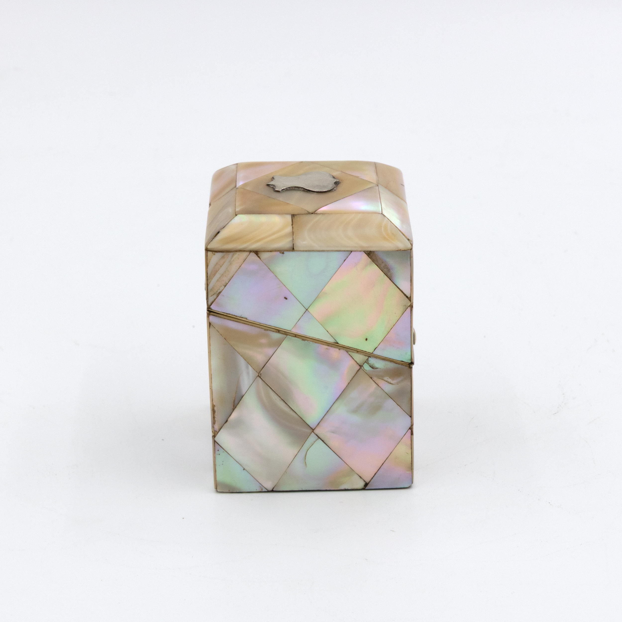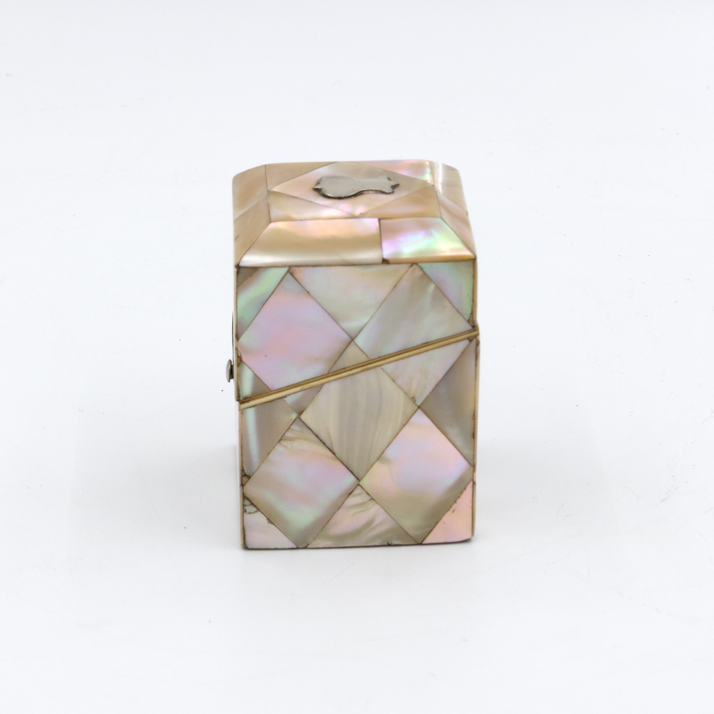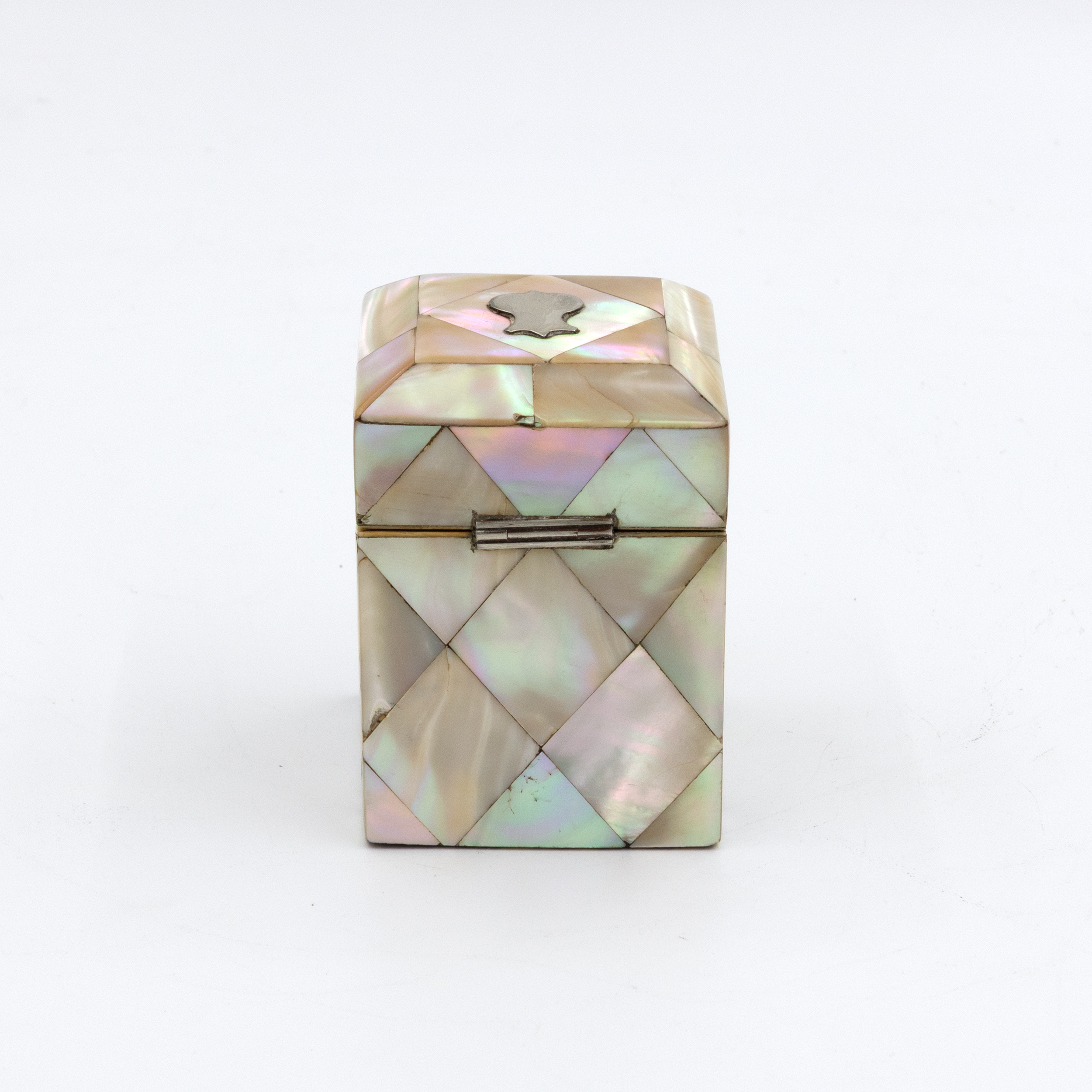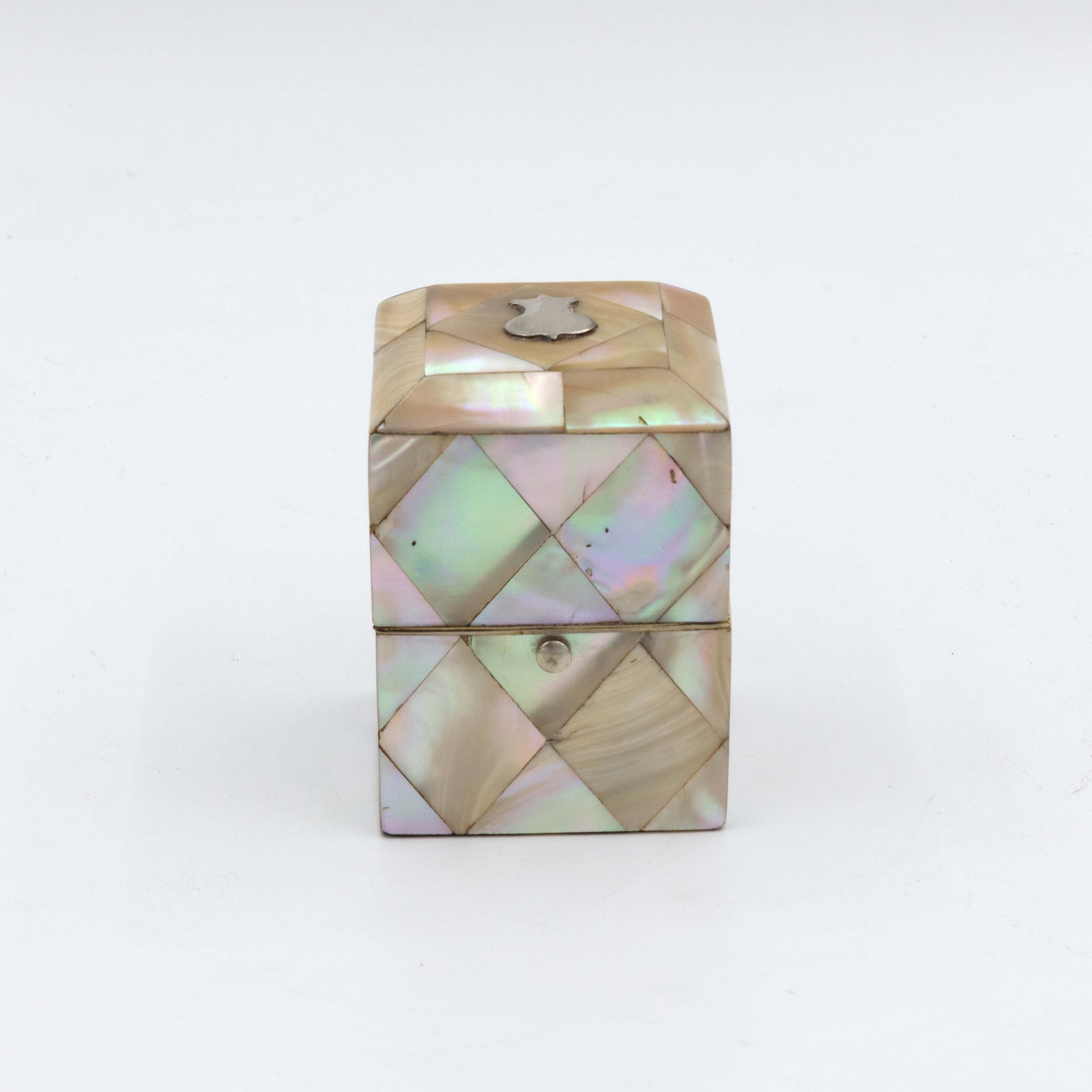 A small English square-form box with mother-of-pearl veneer arranged in a diamond parquetry pattern. The gently chamfered lid is mounted with a small silver escutcheon, typically reserved for personalization, though never engraved. The box opens with a push-button mechanism to reveal a deep amethyst-colored velvet-lined interior. Hinges and fittings are brass, and the lid closes cleanly. Likely intended as a pin or ring box during the Victorian period. The geometric inlay, combined with the iridescent nacre, reflects the era’s interest in surface ornament and personal luxury objects. English, circa 1880.