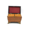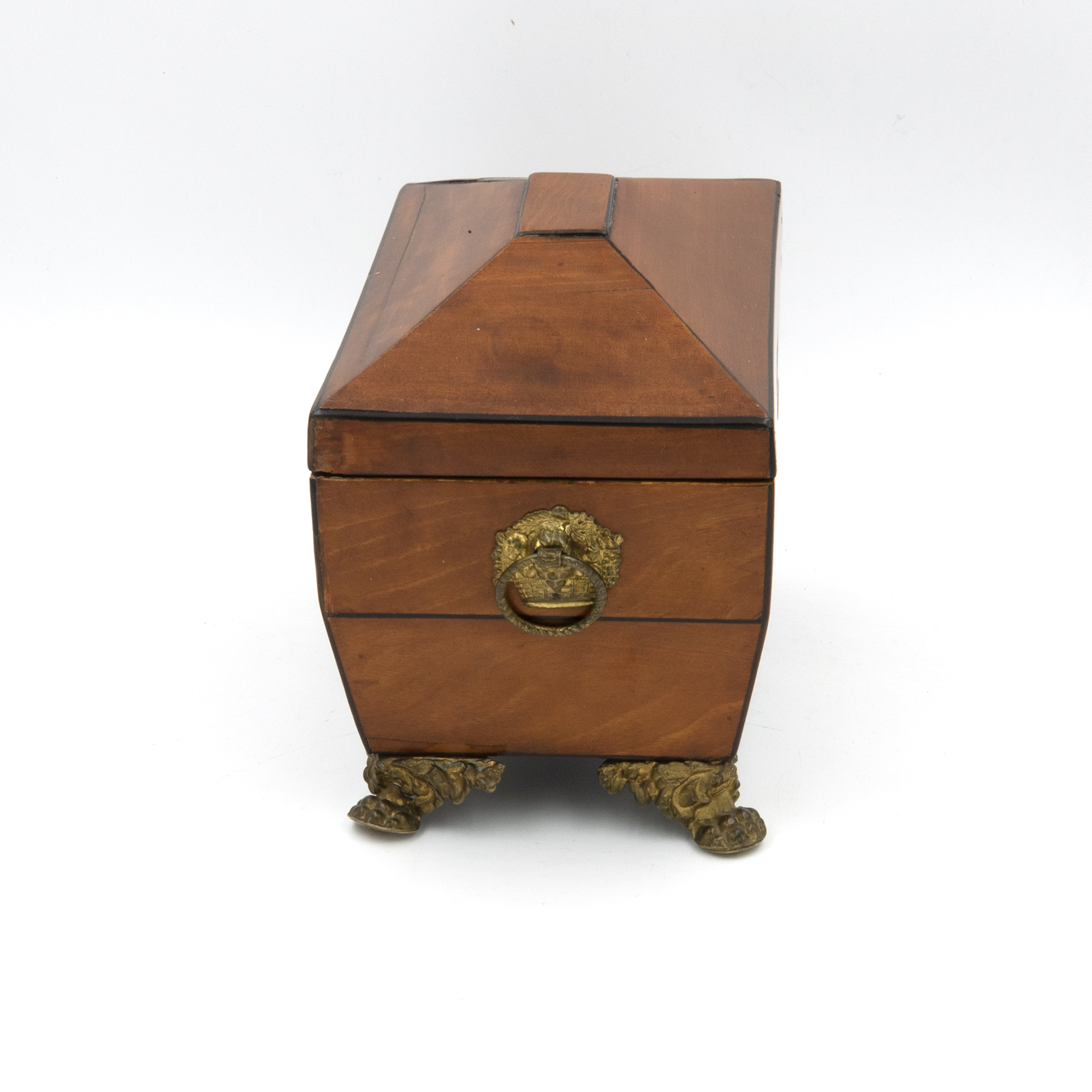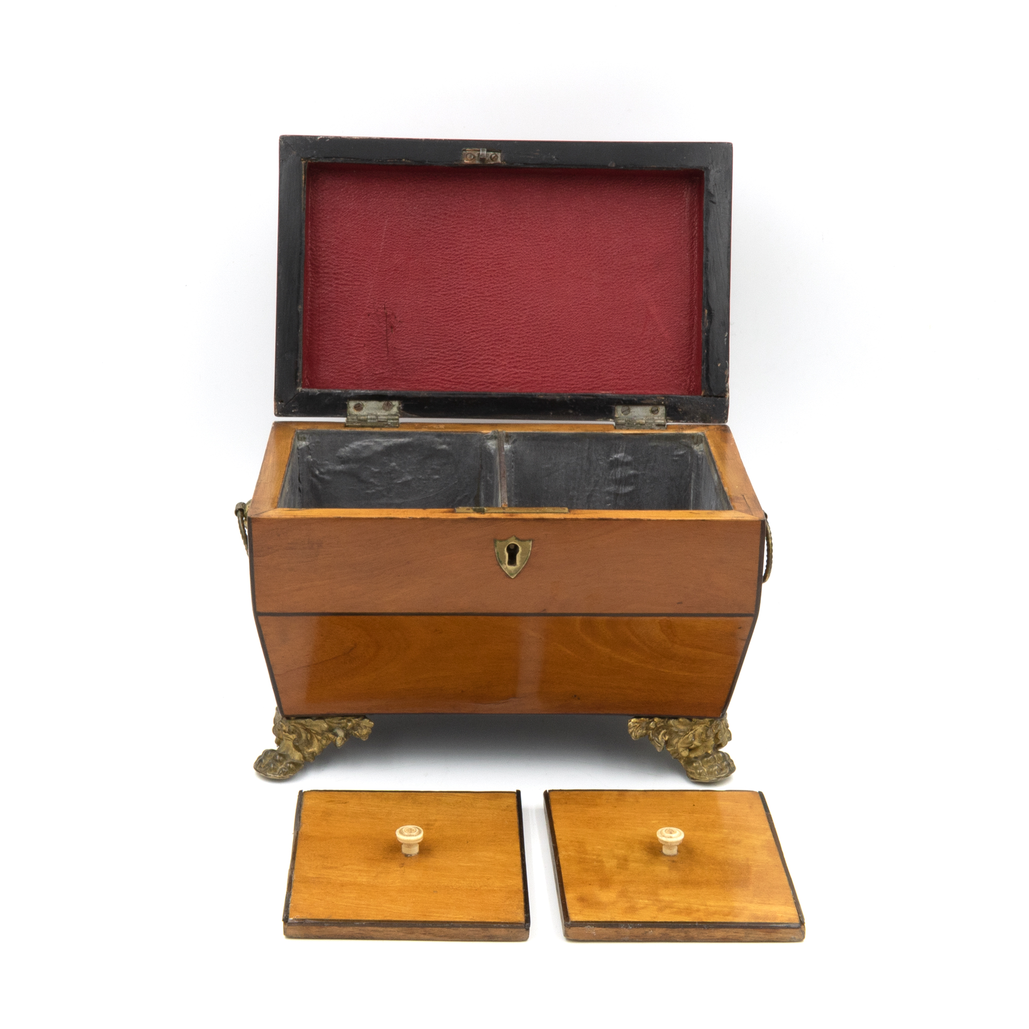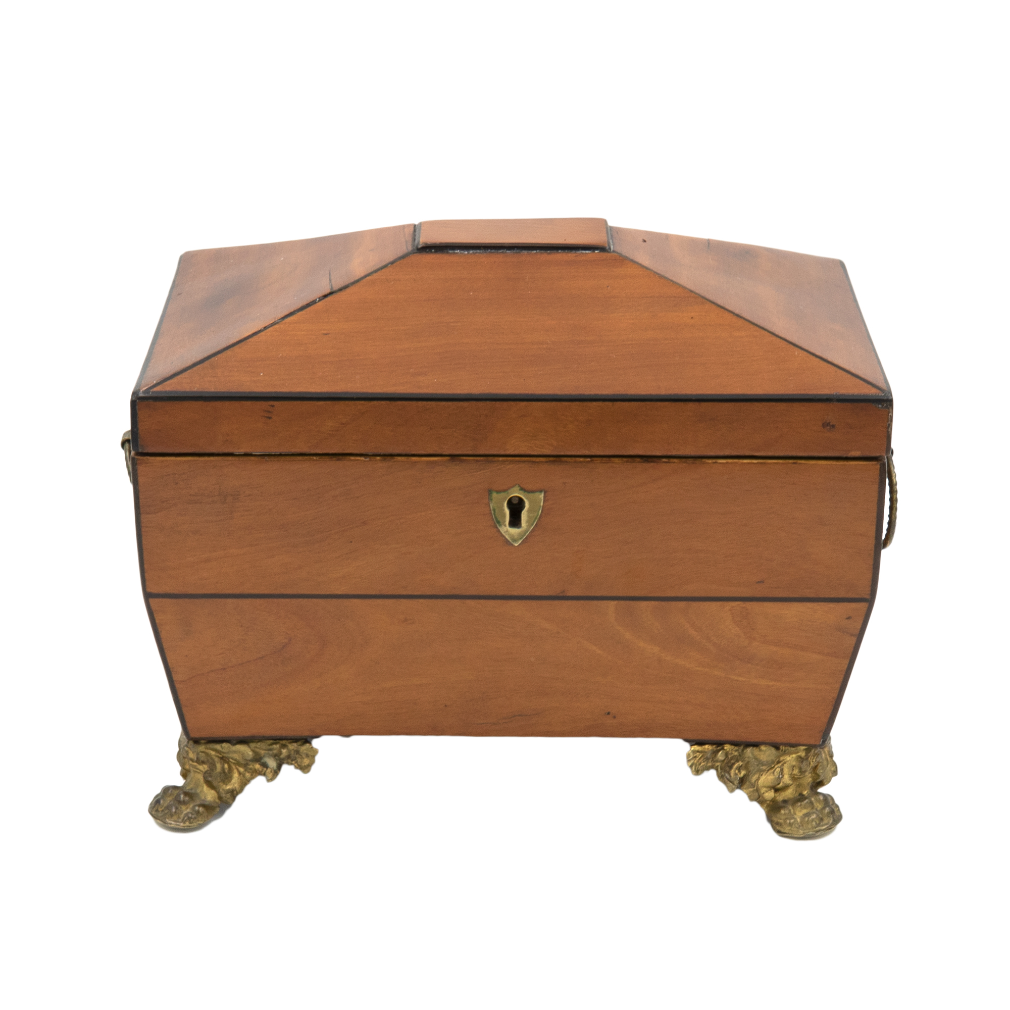 A fine satinwood tent top tea caddy with two interior compartments; English, circa 1840. With brass cornucopia side handles, brass paw feet, brass shield-form escutcheon and ebony edging including an additional horizontal inlay dividing the caddy into top and bottom. Two interior lids with turned bone knobs. Interior foil in very good condition. Working lock and key.
