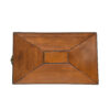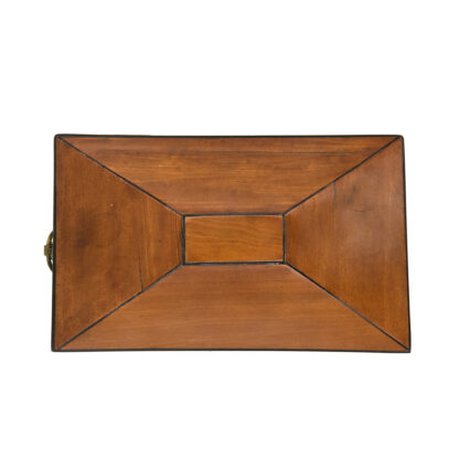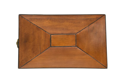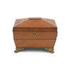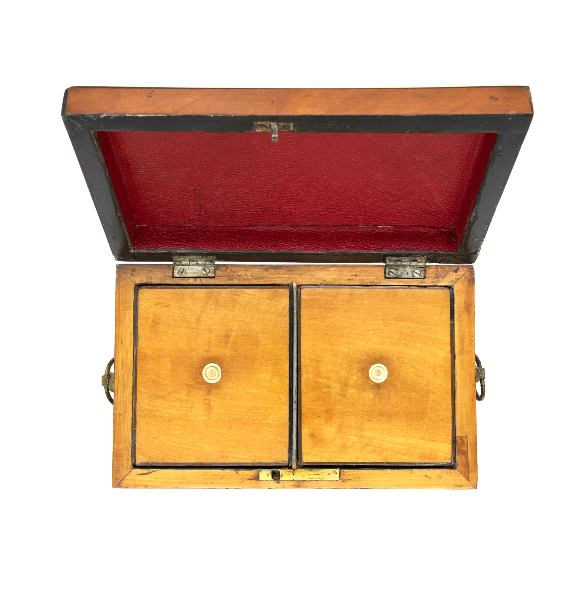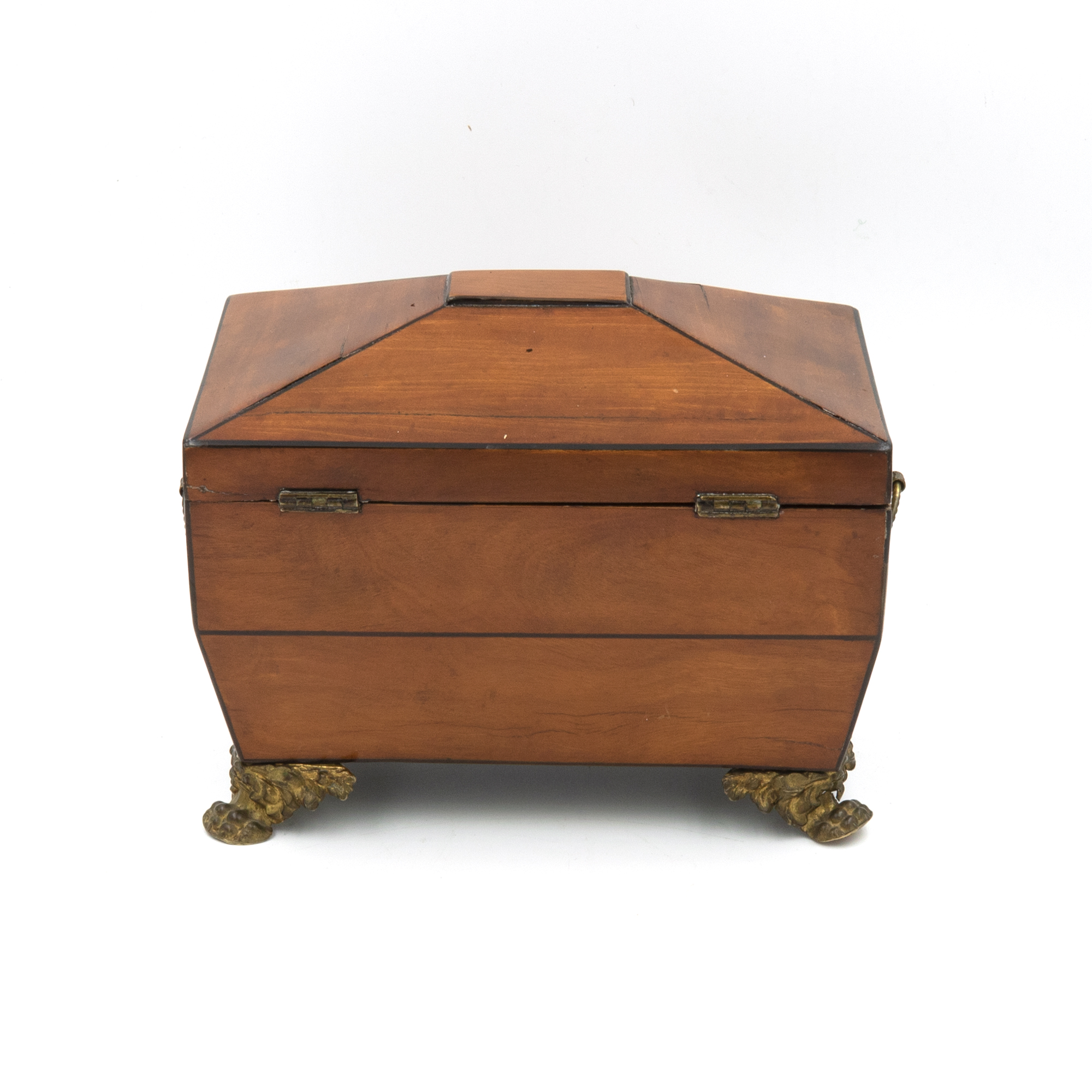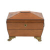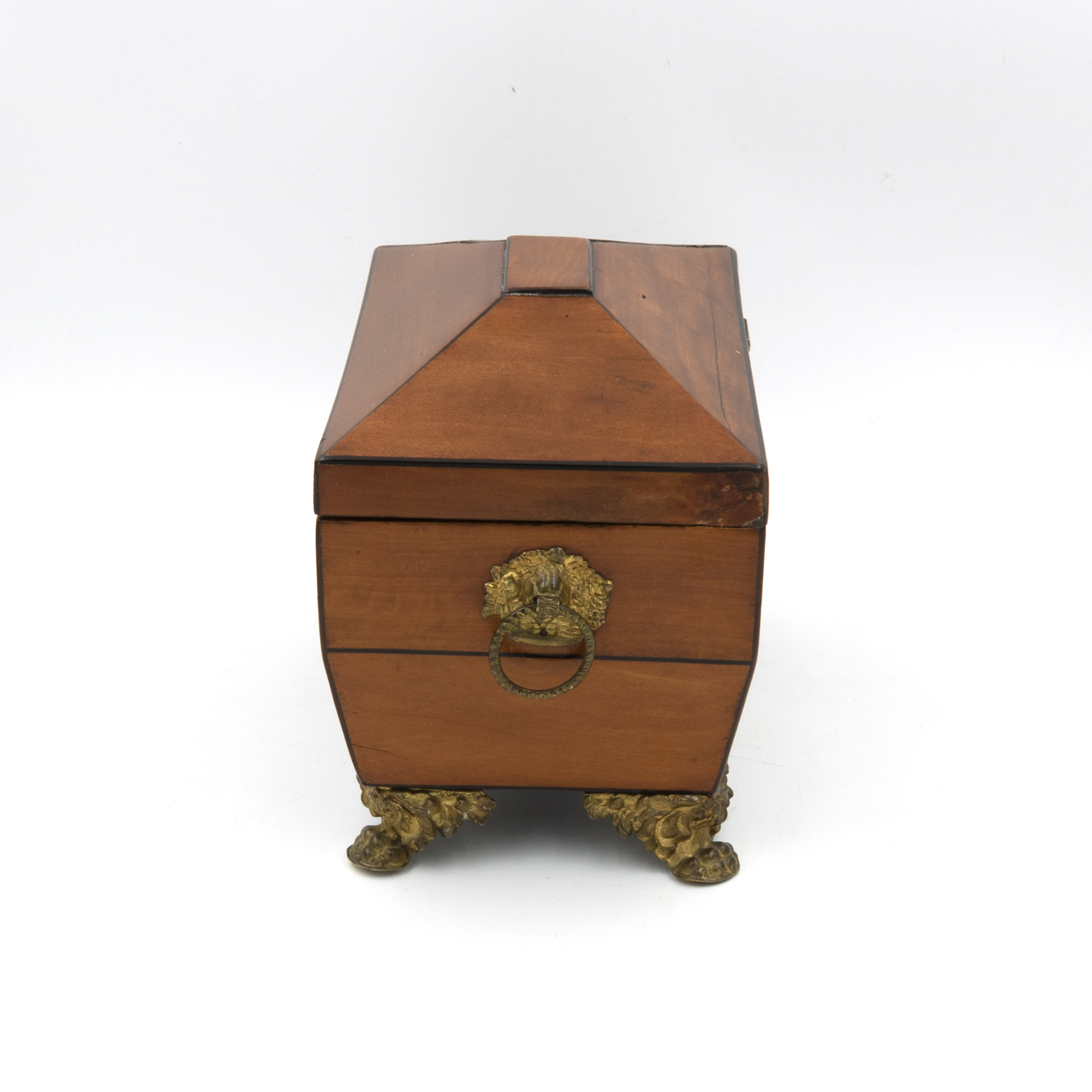 A fine satinwood tent top tea caddy with two interior compartments; English, circa 1840. With brass cornucopia side handles, brass paw feet, brass shield-form escutcheon and ebony edging including an additional horizontal inlay dividing the caddy into top and bottom. Two interior lids with turned bone knobs. Interior foil in very good condition. Working lock and key.